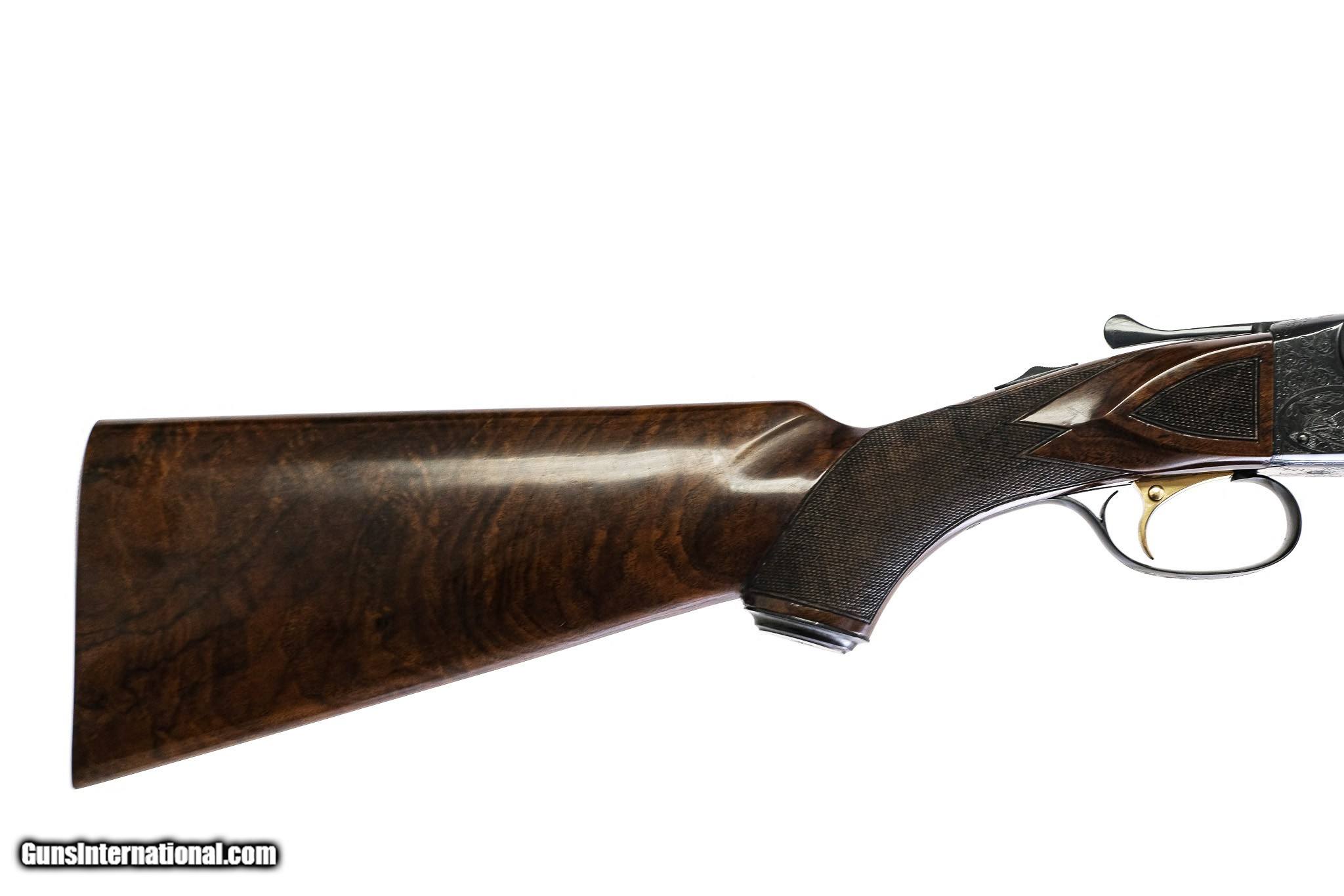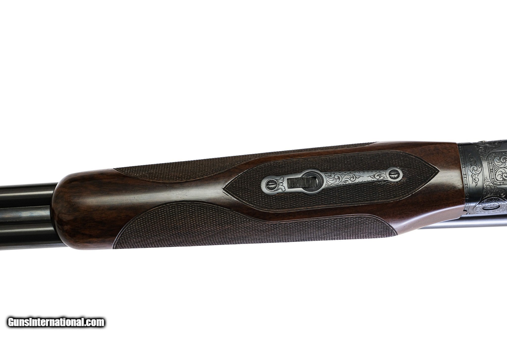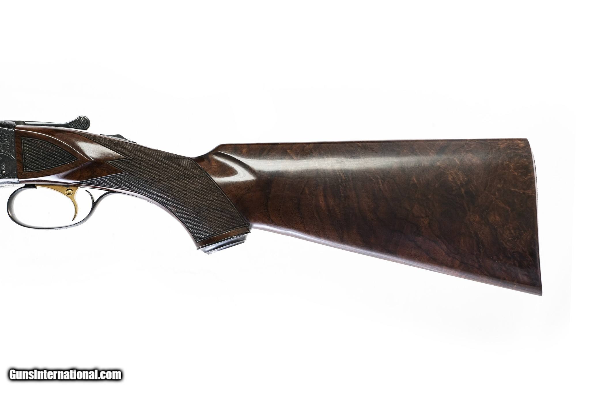 Description: Winchester - Model 21, SxS, Factory #5 Engraving, RARE Vent Rib, Two Barrel Set, 20ga/28ga. 30" M/F (20ga) & 30" (28ga) IC/M. Rare vent rib, this is an early factory engraved #5, checkered butt, checkered side panels, kidney style beavertail with two complete forends. The water table, barrel flats, and foreign irons are all jeweled. Gorgeous #5 engraving that is complete factory engraved. 20ga barrels are 30" M/F, 28ga barrels are 30" IC/M. All barrels are vent rib and have their own forend. This outstanding gun is in new condition. Inv: 67701 7 lbs. 5 oz (with 20ga barrels) 14 1/4" x 1 1/2" x 2 1/4" $19,995.00 SOLD |