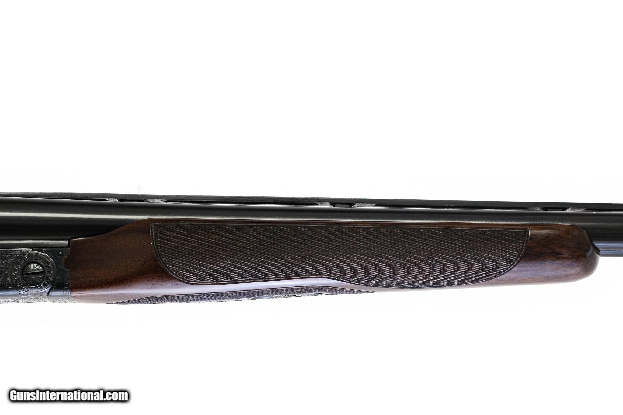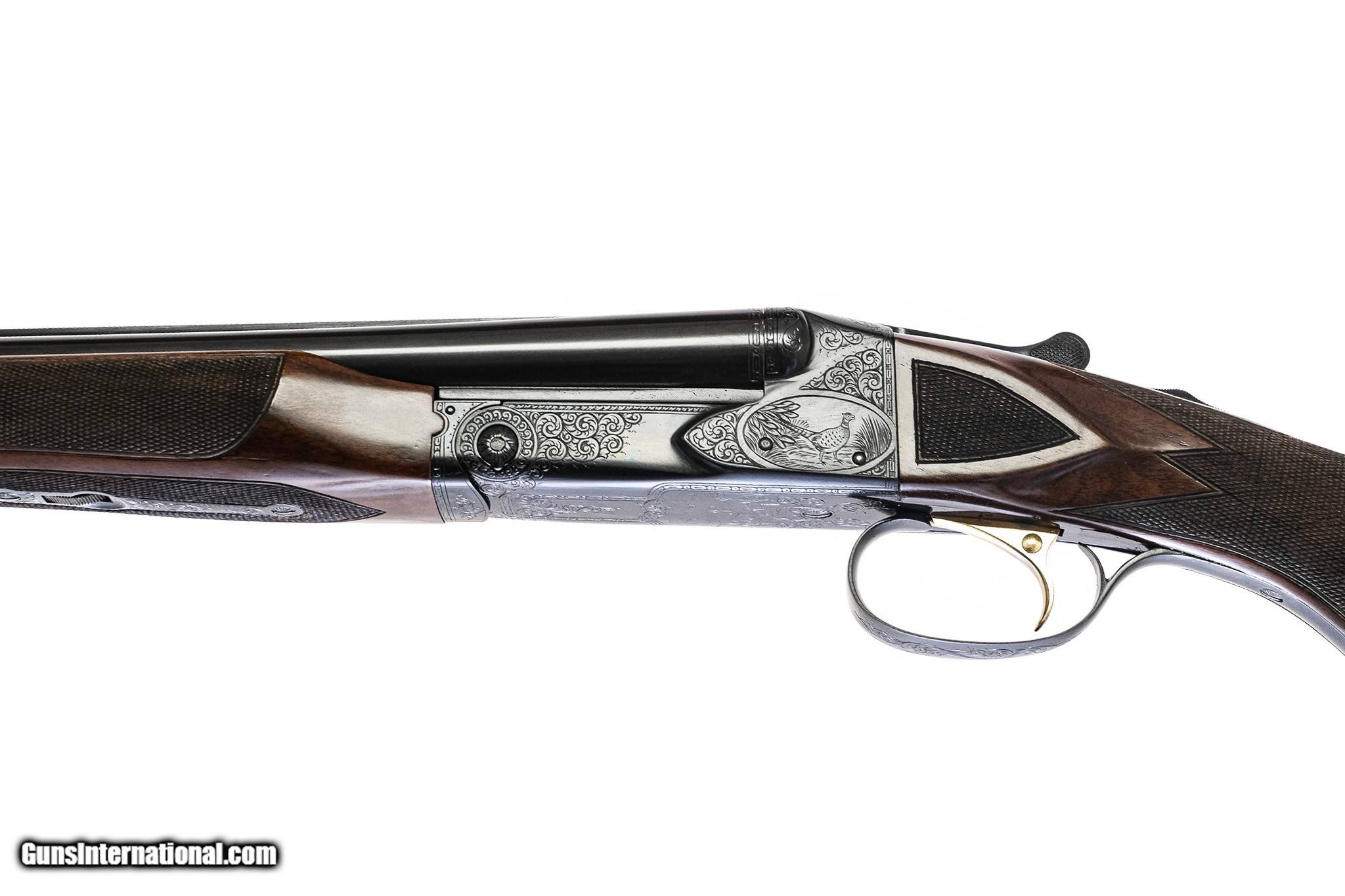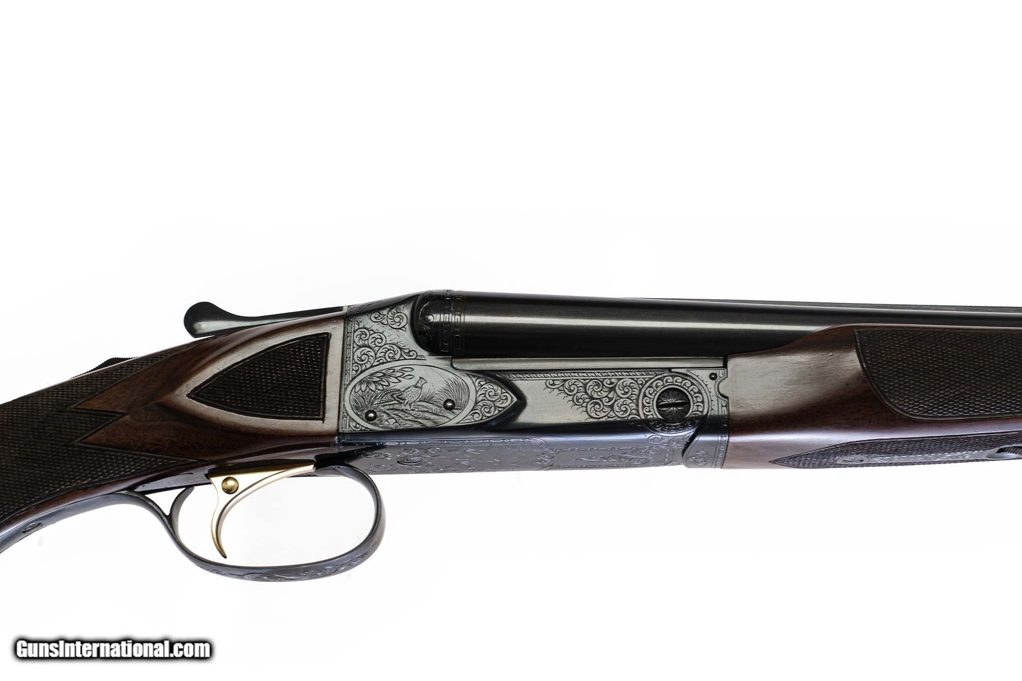 Description: Winchester - Model 21, SxS, Factory #5 Engraving, RARE Vent Rib, Two Barrel Set, 20ga/28ga. 30" M/F (20ga) & 30" (28ga) IC/M. Rare vent rib, this is an early factory engraved #5, checkered butt, checkered side panels, kidney style beavertail with two complete forends. The water table, barrel flats, and foreign irons are all jeweled. Gorgeous #5 engraving that is complete factory engraved. 20ga barrels are 30" M/F, 28ga barrels are 30" IC/M. All barrels are vent rib and have their own forend. This outstanding gun is in new condition. Inv: 67701 7 lbs. 5 oz (with 20ga barrels) 14 1/4" x 1 1/2" x 2 1/4" $19,995.00 SOLD |