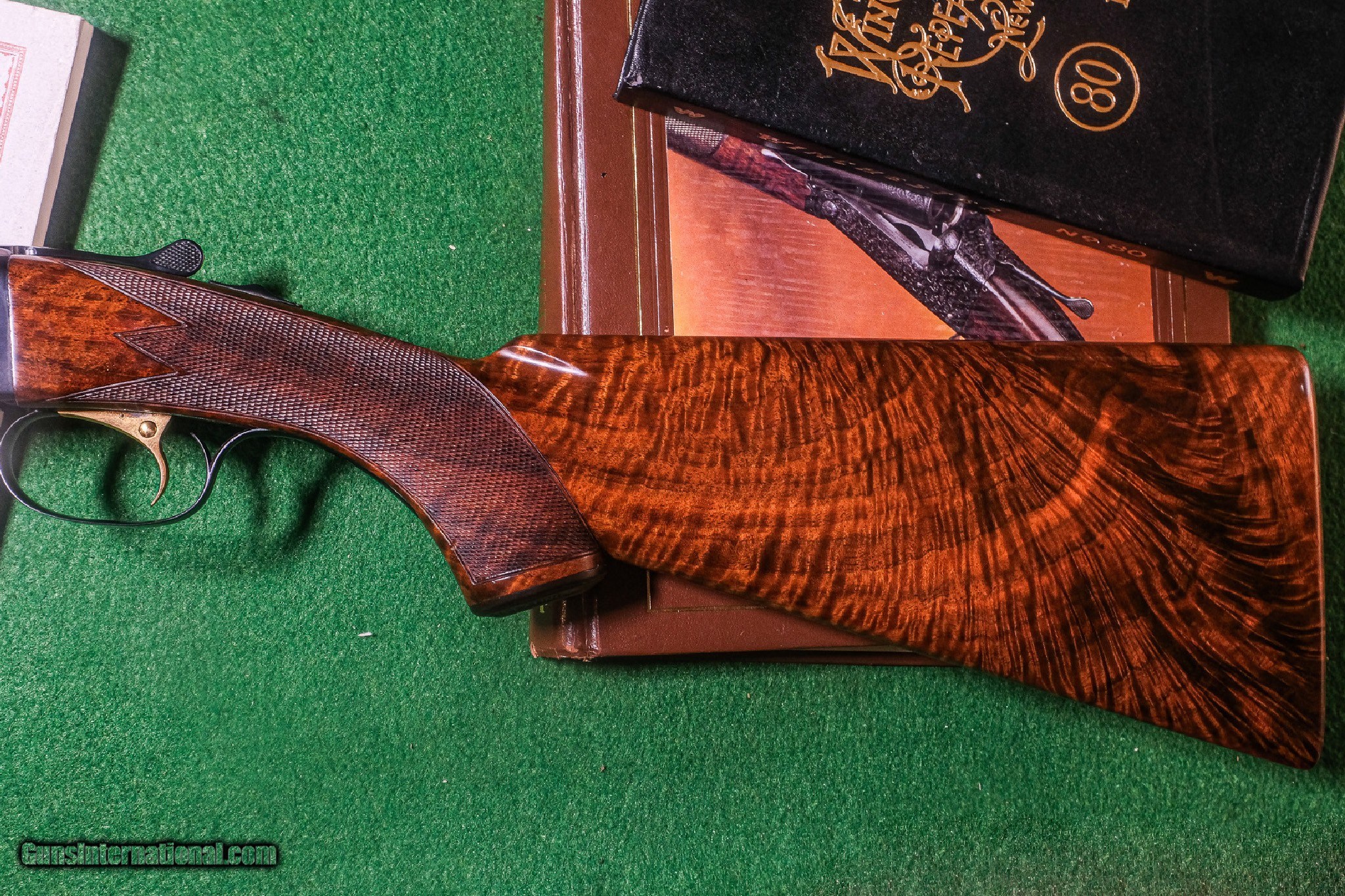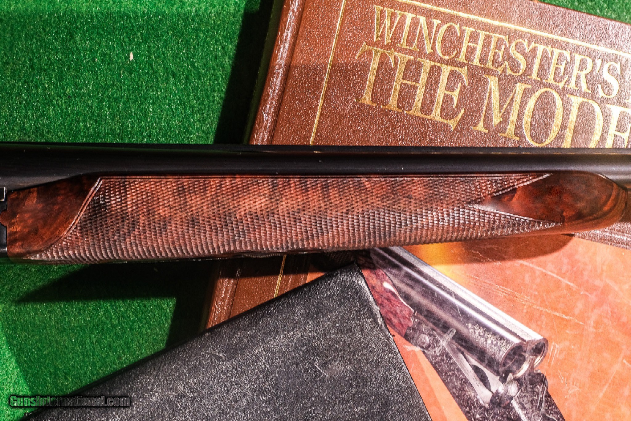 Description: Winchester - Model 21, SxS, Four Barrel Set, 20ga/28ga/28ga/.410. 28" (20ga) WS1/WS2 / 28" (28ga) M/IM / 28" (28ga) M/IC / 28" (.410) F/M. First set, 20ga. 28” barrels choked WS1/WS2 with a red Bradley front sight and a matted rib, marked Custom Built by Winchester. Second set, 28ga. 28” barrels choked M/IM with a red Bradley front sight and a matted rib, marked Custom Built by Winchester. Third set, 28ga. 28” barrels choked M/IC with a red Bradley front sight and a matted rib, marked Custom Built by Winchester. Fourth set, 410 rare 3” chamber 28” barrels choked F/M with a red Bradley front sight and a matted rib, marked Custom Built by Winchester. This gun has three forends, with multi-point pattern checkering with ebony insert. All jeweled water tables, barrel flats, and forend iron. This is an early round custom frame with superior build quality. Gold single selective trigger, three-point checkering on buttstock, capped pistol grip, checkered butt, outstanding old growth black walnut full feather crotch. Winchester marked gun. This gun is as new with perfect bluing, wood finish, and checkering. Extremely rare four-barrel set in its original four-barrel case. This is an outstanding custom shop gun with all of the correct markings. Inv: 90550 $27,500.00 CT Shotgun/Galazan buys sells and trades the world’s largest inventory on Model 21 shotguns. we are experts in all phases of buying, selling, and repairing as well as restoration of these very complex guns we have handled more Model 21 in all regards than all other companies put together. we have bought sold and manufactured most of the Grand Royal and Grand American grade guns and we understand them intimately. In 1994, Galazan/CT Shotgun purchased the Winchester Custom Shop from U.S. Repeating Arms Company and at that time designated the sole manufacturer and authorized repair for the Model 21, we purchased all of the inventory machining tooling and highly regarded trade secrets in regards to manufacturing and repairing maintaining these intricate shotguns. CT Shotgun/Galazan continues to perform the only authorized factory service on all these fine guns if you are interested in purchasing repairing or altering a Model 21 we should be your sole source when it comes to a Model 21 every gun we sell is serviced and inspected, comes with our lifetime warranty. CT/Galazan also has all assorted accessories, original style cases and recoil pads. WHY BUY A MODEL 21? 1. No one knows the gun better than us. 2. We are the only authorized repair facility for Model 21s. 3. We build the new Winchester Model 21. 4. We build the CSMC Model 21. 5. Every gun receives a safety inspection before sold to a customer. 6. Most guns are detailed, cleaned & lubricated and any parts charged to make them as factory new. 7. Fair honesty, reputable dealing for over 50 years. 8. Very competitive pricing. If you compare our guns to any other gun on the market, you will find in most instance that our guns are the best value. The best are brought up to factory specs which, in some cases, can be more than the gun. 9. The largest collection of Model 21s in the world. 10. Why any Model 21 SxS you buy from us; we offer a lifetime mechanical warranty. The largest, most diverse, high-grade shotgun and firearms inventory in history. There is no one even close and a service department to back up everything we sell with our unparalleled warranty to support our customers exclusively. If someone tells you they have a larger inventory, just look for yourself. SOLD |