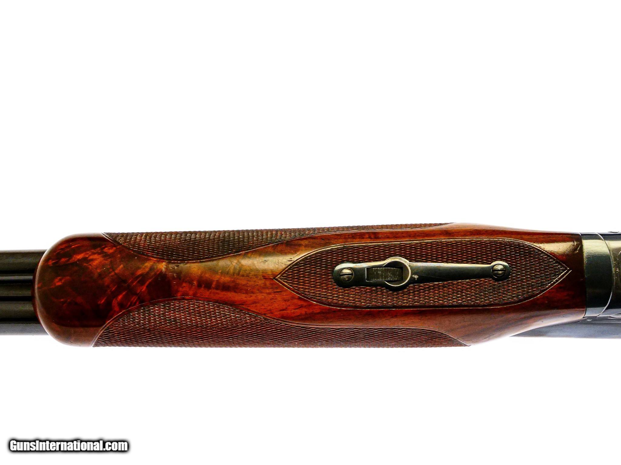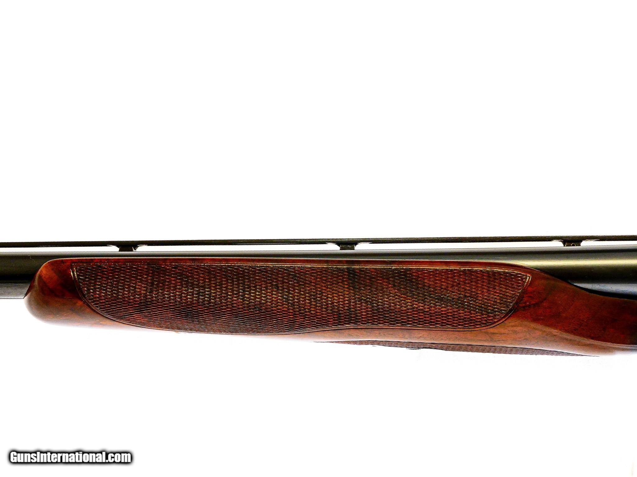 Description: Winchester - Model 21, SxS, RARE Trap Grade, Special Order Gun, 12ga. 32" Barrels Choked F/F. Cody Letter made in 1939 just as it is. 32" barrels, factory vent rib choked Full/Full, kidney style beavertail, marked trap grade on floor plate, checkered side panels, very rare round ball pistol grip, factory cheek peice, Monte Carlo gun, heavily figured Winchester feather crotch, original Winchester leather face pad, single selective trigger, auto ejector, 2 3/4" chambers, 99% blue, 99% wood finish, and 99% checkering. Only minor handling marks but original wood finish. This is one of the most unusual Model 21s we have ever handled, a rare collector grade gun. Inv: 67046 7 lbs. 6 oz. 14" x 1 1/2" x 1 5/16" $8,750.00 SOLD |