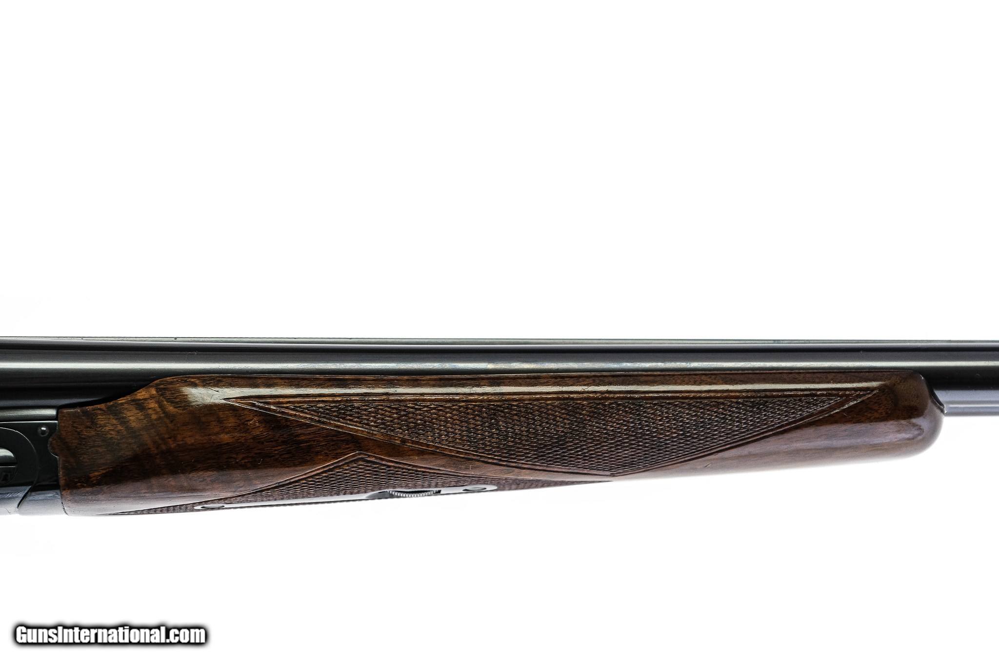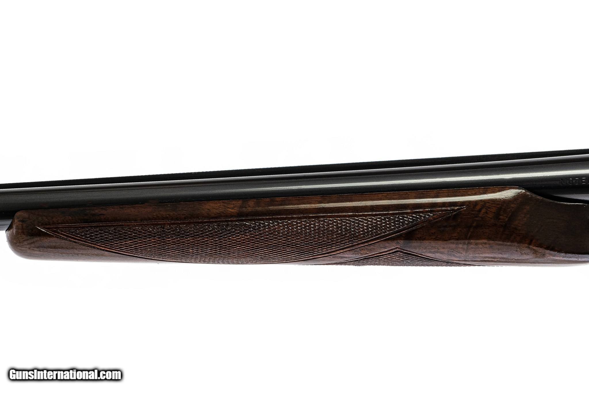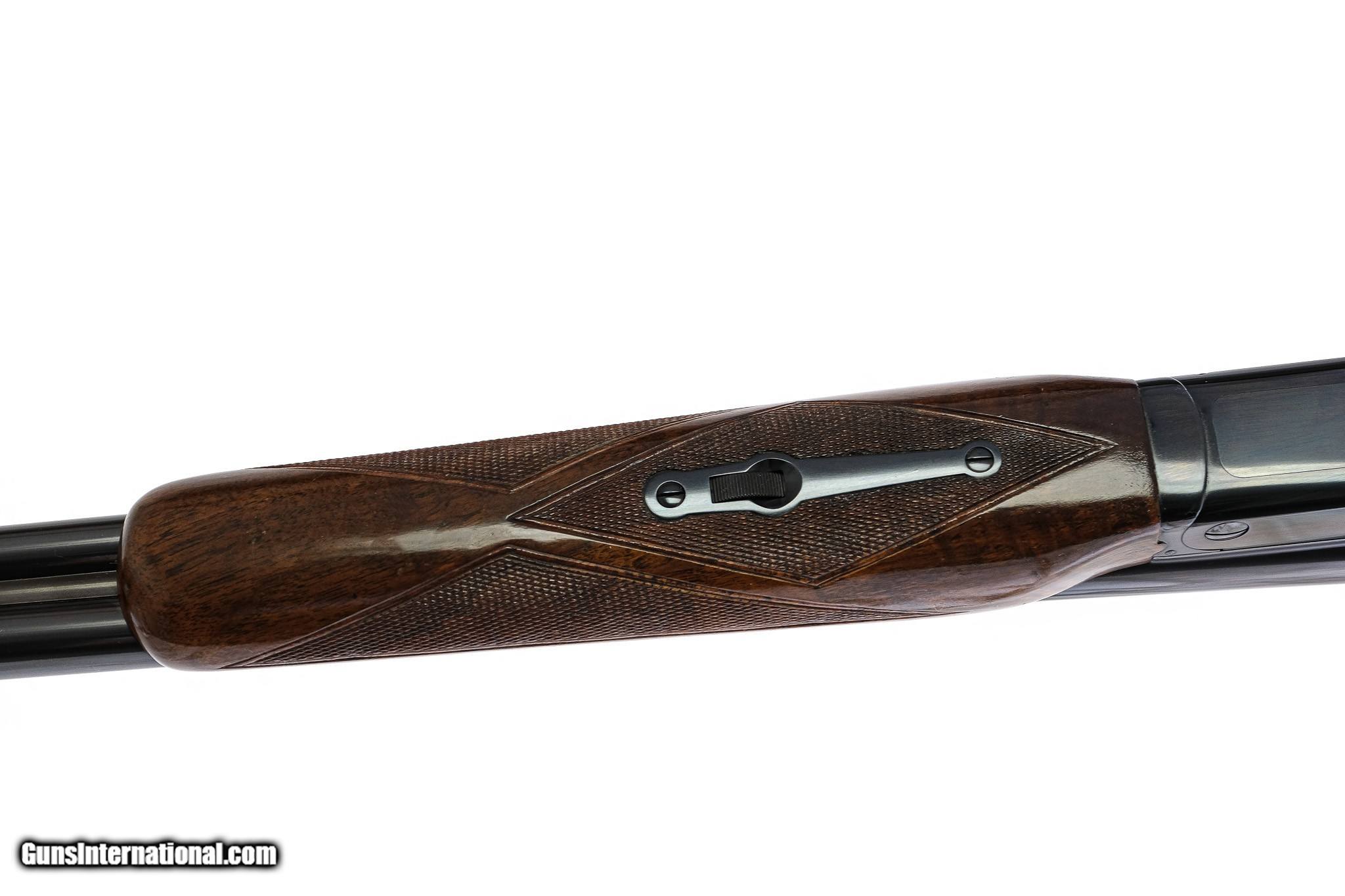 Description: Winchester - Model 21, SxS, Two Barrel Set, 20ga. 30" F/F & 26" IC/M. Magnum barrel is 3" chambered, and choked F/F and 26" Barrel is 2 ¾" chambered choked IC/M. Single selective trigger, automatic ejector, pistol grip, original Winchester pad, 1950's diamond style checkering on forend. This is a very rare gun that has it all! A magnum with a extra 26" barrels, with beautiful American walnut, matte rib, showing virtually no use! And is completely original! Perfect screws, outstanding rare gun with minor handling marks. Inv: 76685 6 lbs. 12 oz. 14" x 1 ½" x 2 ¼" $11,995.00 SOLD |