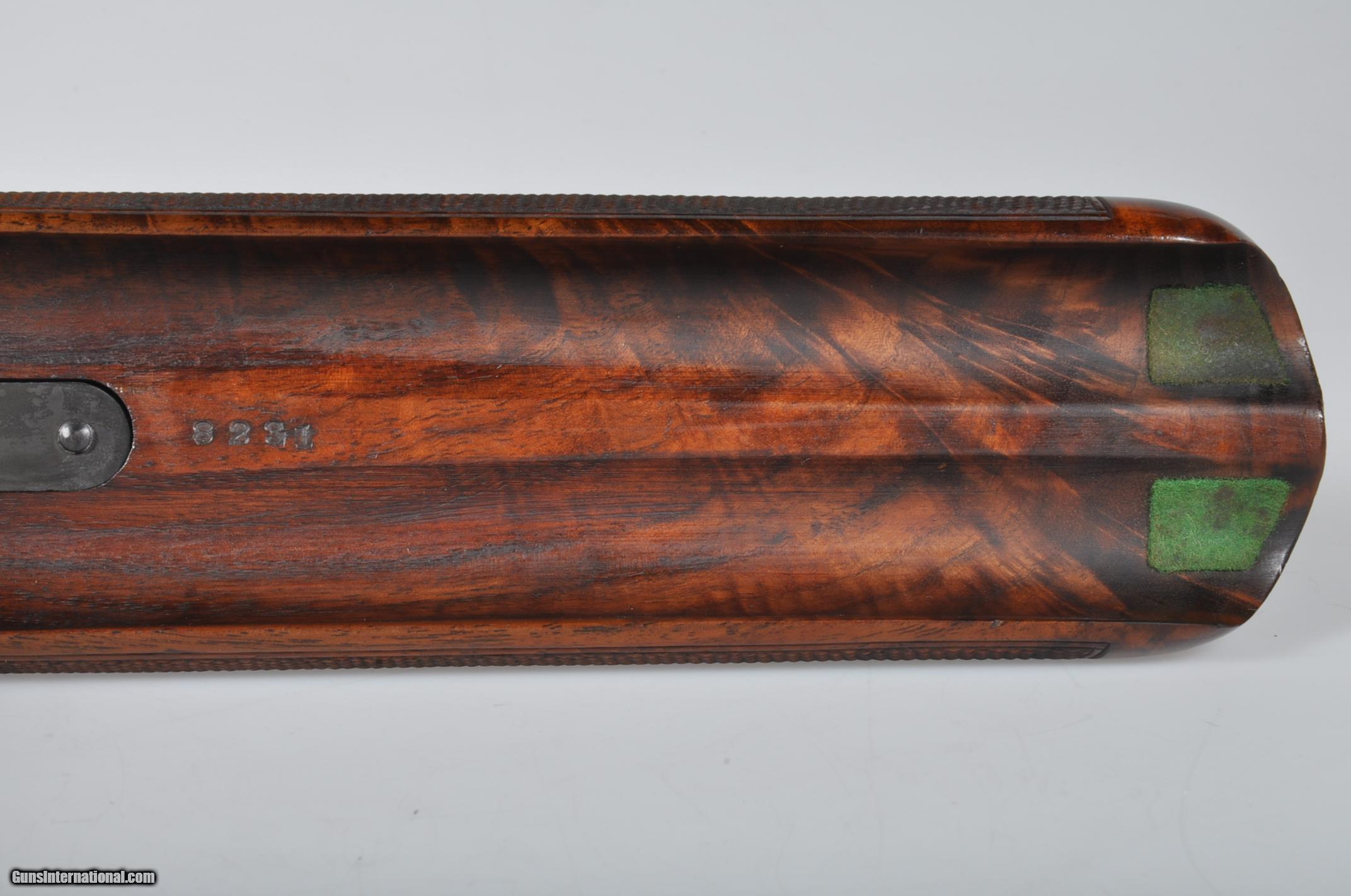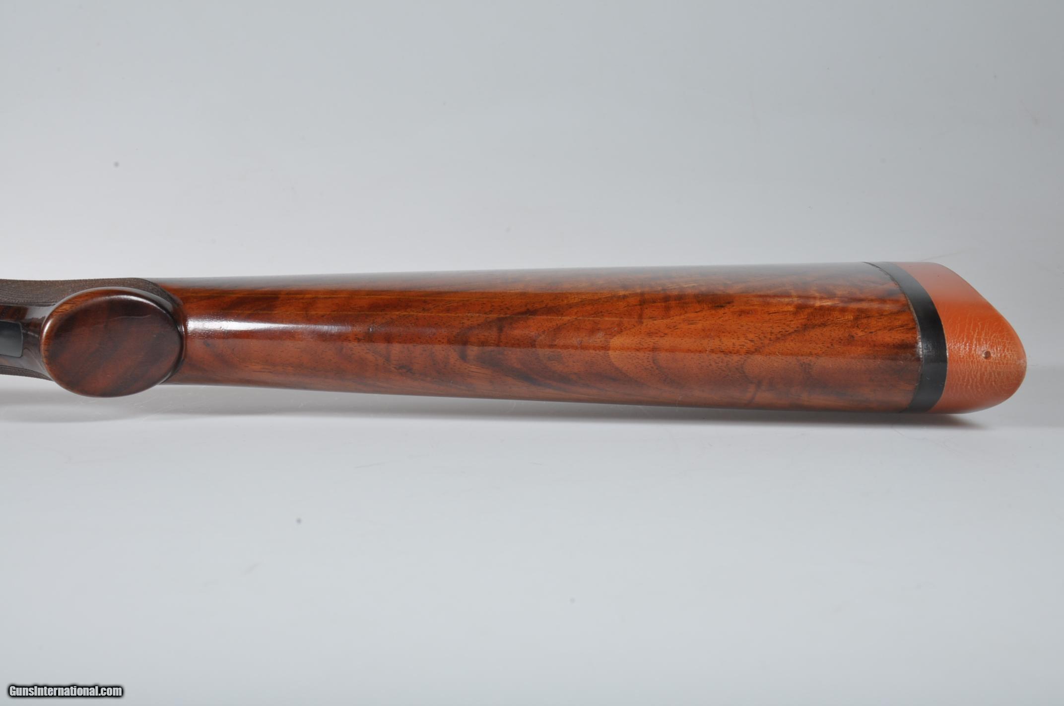 Description: 12 gauge, 30″ barrels, 2 3/4″ chambers. Both chokes are marked FULL and measure .006 right and .008 left. Full length ventilated rib with dual silver beads. Bores are bright and shiny. Floorplate is marked TRAP. Single selective trigger, automatic ejectors, automatic safety. Pistol grip stock with checkered side panels, checkered in three point pattern with 14″ length of pull over a red Winchester recoil pad. Beavertail forearm with roll type release checkered in “Kidney” pattern. Condition: All metal has been reblued. The bluing on the barrels is uneven and thinning in areas, more on the right barrel. The wood appears original and has had varnish added at one time. There are various light handling marks. Drop at comb: 1 5/8”. Drop at heel: 2 ¼””. Weight: 8 lbs. Mechanics are excellent. We prefer to communicate by email. We can not accept credit cards for collectible firearms. We have more than 500 Winchester Model 21s in stock in every grade and gauge. We also have hundreds of Parkers, Fox and LC Smith Shotguns so feel free inquire other fine shotguns. SOLD Manufacturer: Winchester Model: 21 Trap Serial Number: 8231 Chambers: 2 3/4 Ejectors: Yes Barrels: 30 Triggers: SST Gauge Info: 12 Stock: Pistol Grip Fore End: Beavertail LOP: 14 Rib: Ventilated |