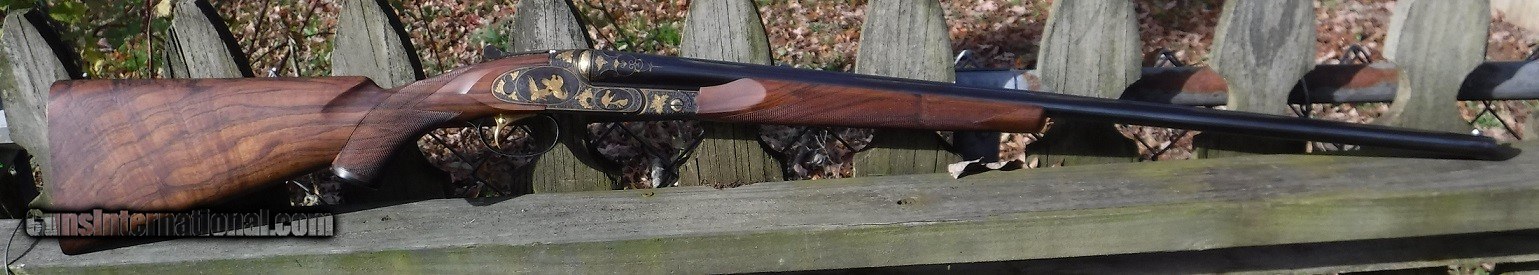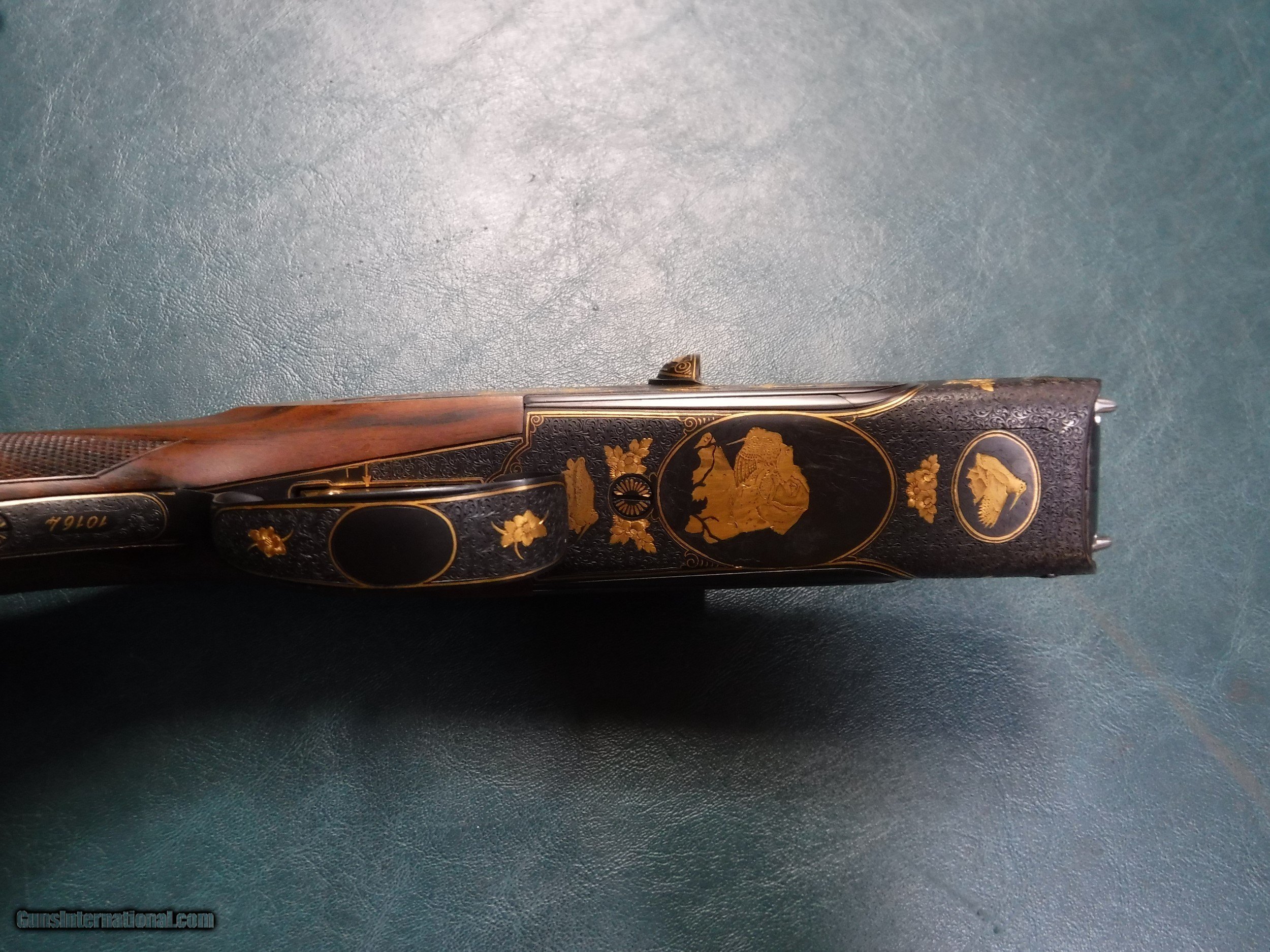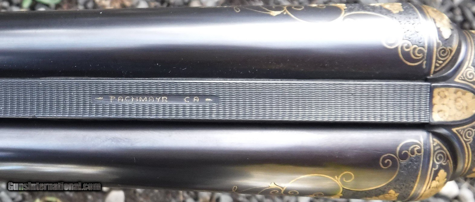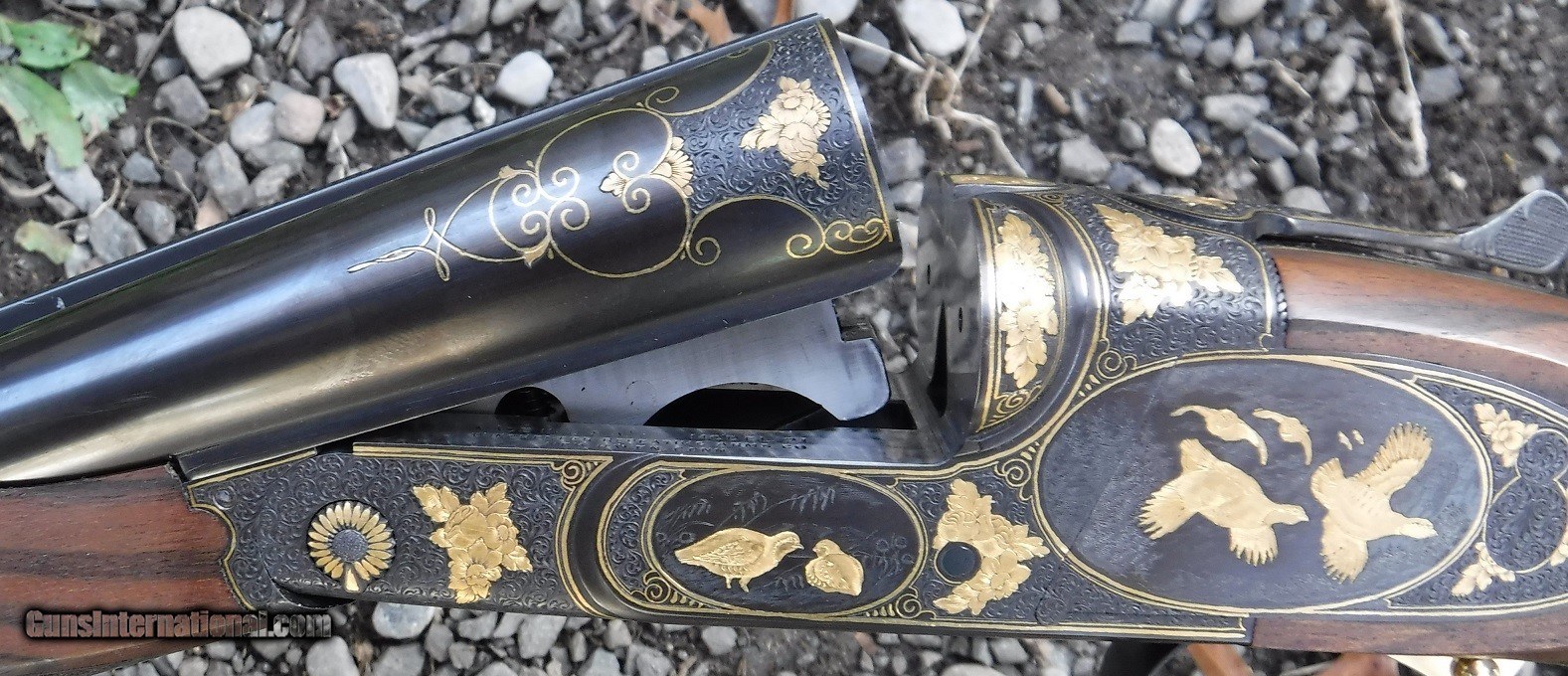 Description: WINCHESTERMODEL 21 CUSTOM BY PACHMAYR - 20 GAUGETWO BAREL SET - FANTASTIC CUSTOM WORK - ADDED SIDE PLATES - EXTENSIVE GOLD INLAYS AND FINE SCROLL ENGRAVING - GOLD INLAYS INCLUDE FIGHTING COCKS, PHEASENTS, CHUCKERS, WOODCOCKS, DOG WITH WOODCOCK IN MOUTH, WIRE BOADERS AROUND ALL EDGES, CLUSTERS OF ROSES, SERIAL NUMBERS, "PACHMAYR CA" ON RIB, PLATED TRIGGER - THERE ARE WEDGES OF SCROLL AT BREECH ENDS OF BARRELS AND GOLD ROSE S AT MUZZLES - BARREL SET #1 IS 28" CHOKED WIN. SKEET 1 & WIN SKEET 2 / SET #2 IS 28" CHOKED .008 & .024 MARKED MODIFIED & FULL - SINGLE SELECTIVE TRIGGER - AUTO EJECTORS - ENGINE TURNED JEWELING ON BARREL FLATS, WATER TABLES, AND FOREND IRON - BEAVERTAIL FOREND WITH VERY FINE CHECKERING IN A POINT PATTERN - BUTTSTOCK HAS WELL FIGURED WALNUT WITH DARK CONTRASTING STREAKS - PISTOL GRIP WITH BLACK COMPOSITE CAP WITH GOLD PLATED INITIAL PLATE - LOP 14 3/16" OVER CHECKERED BUTT- DAC 1 3/8" - DAH 2 3/8" - OIL FINISH WITH FINE CHECKERING IN WRAP AROUND POINT STYLE - WEIGHT OF GUN W/ #1 BLS. 6 lbs. 14 ozs. - W/ #2 BLS. 7 lbs. 1 oz. - GUN IS CASED IN HUEY OAK AND LEATHER WITH ACCESSORIES - (SEE PHOTO'S) - THIS IS ONE OF PACHMAYR'S FINEST - IMAGINE THE COST OF ENGRAVING AND INLAYS ALONE IN TODAYS MARKET SOLD |