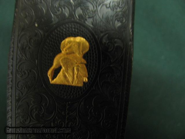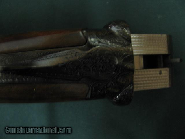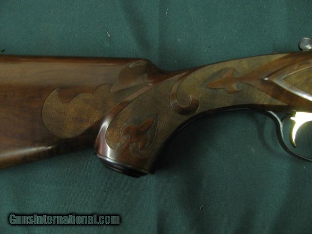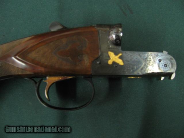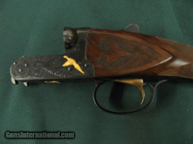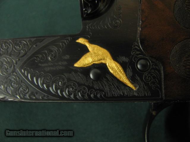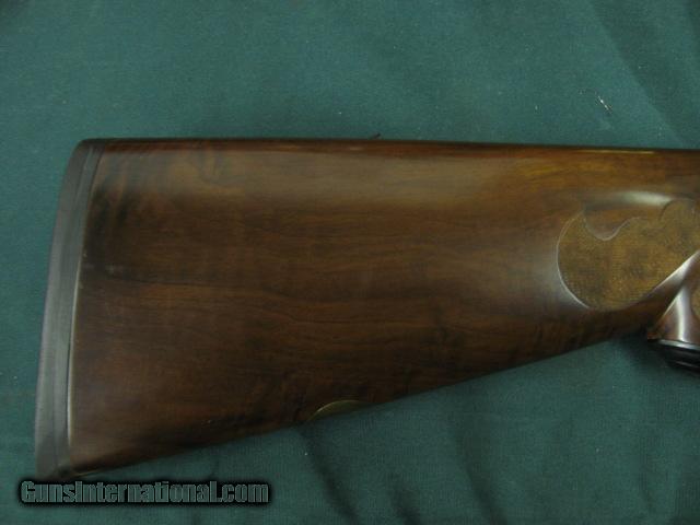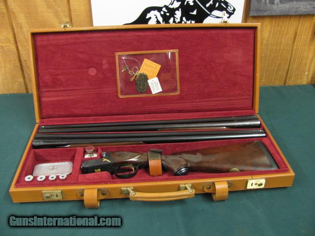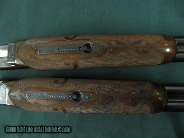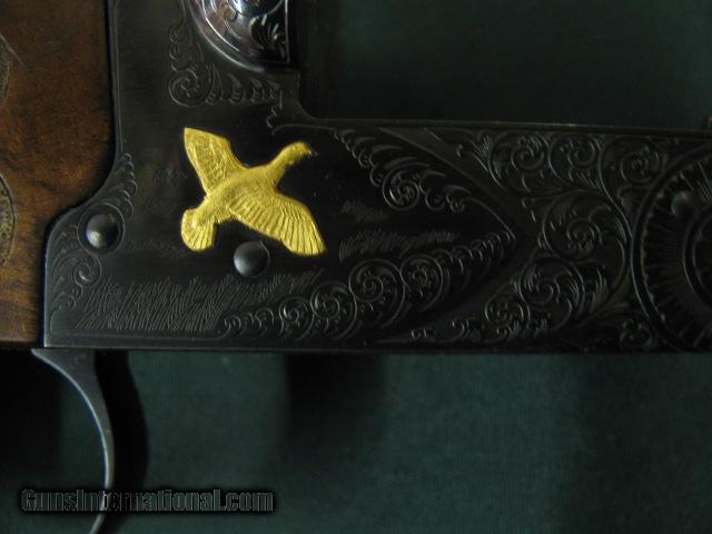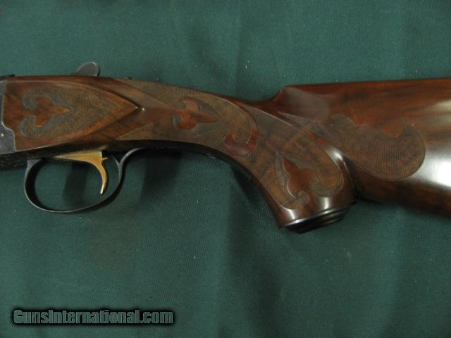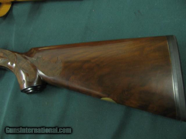 Description: 5149 Winchester 23 WBS 2 barrel HUNT SET, 20ga 26bls ic/mod, 28 ga 26bls ic/m, solid rib, gold raised relief PHEASANT,QUAIL,KING BUCK LAB AND DUCK,MR OLINS DOG, leather case 4 silver snap caps, oiler, 99% condition with AA++Fancy. walnut,fleur-des-lies checkering, pistol grip with cap, butt pad, all original. SOLD |