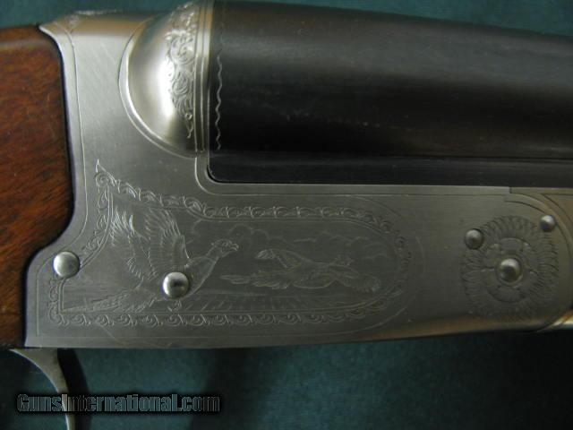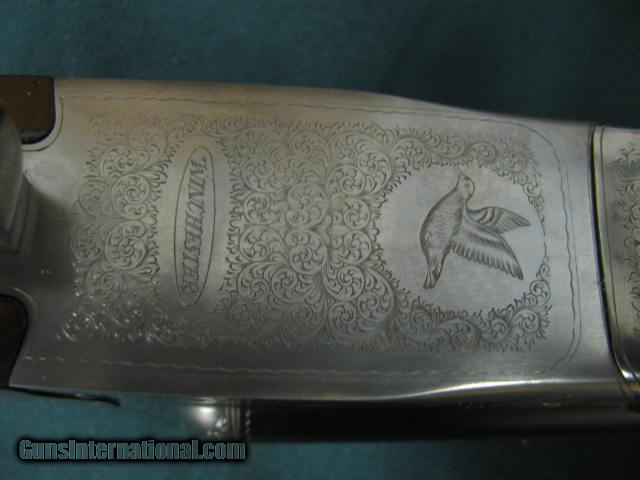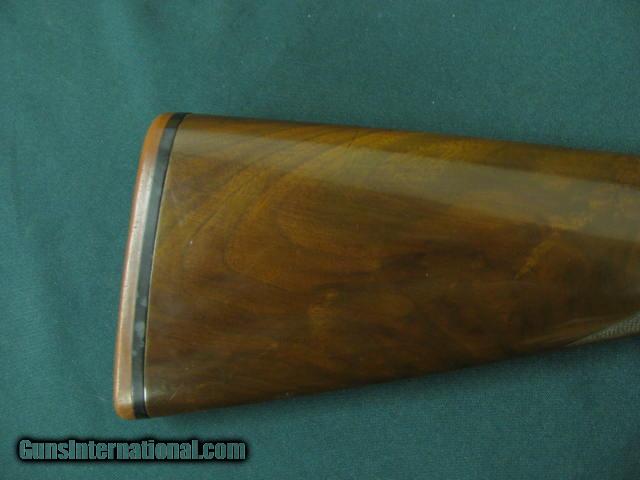 Description: 6092 Winchester 23 Pigeon XTR lightweight,20 gauge 26 inch barrels, ic/mod STRAIGHT GRIP, vent rib ejectors, Winchester pad, birds/dogs engraved on coin silver receiver. 2 bruises size of dime on comb. AA+ highly figured walnut. 2 3/4 and 3 inch chambers. these are hard to find. SOLD |