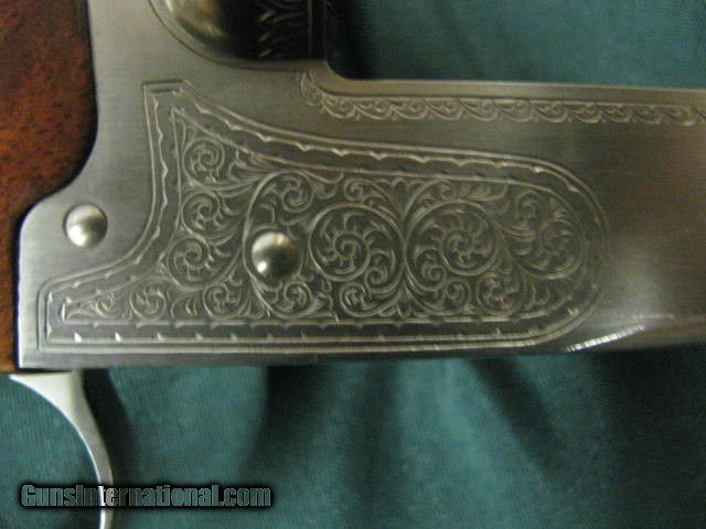Description: 6871 Winchester 23 Pigeon XTR 12 gauge 28 inch barrels, mod/full, round knob, ejectors, single select trigger,Winchester butt plate, all original, vent rib, A+ Walnut, correct Winchester case/Pamphlet,98++ condition, As new in Case.coin silver rose and scroll engraved receiver. SOLD |