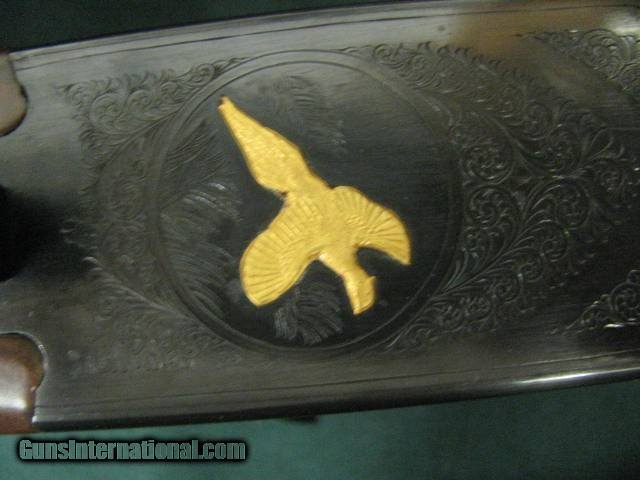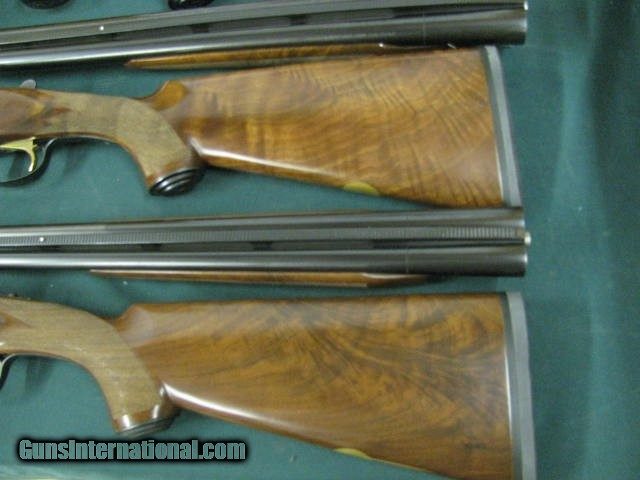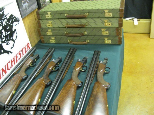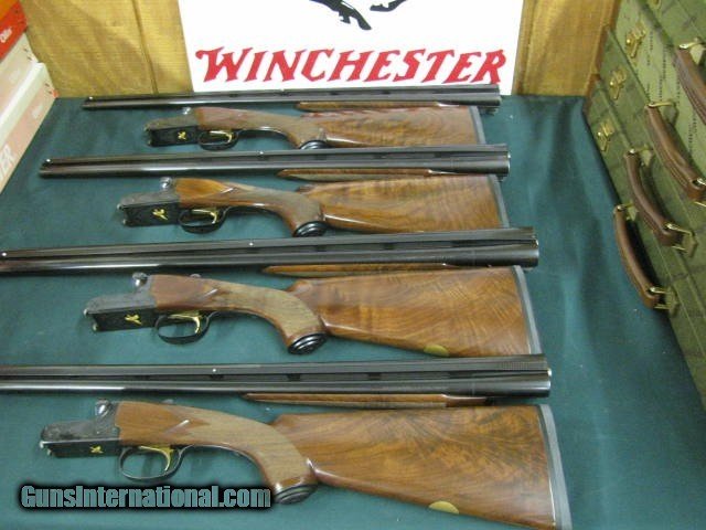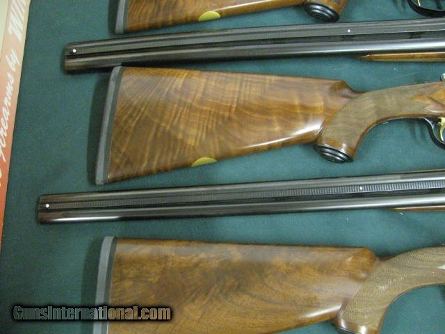 Description: 6882 Winchester Model 23 Classic 4 gun set,12, 20, 28, 410 gauge,26 bls,ejectors,RAISED RELIEF GOLD QUAIL/PHEASANT, vent rib, pistol grip,single select trigger,UNFIRED, all CORRECT SERIALIZED boxes,WINCHESTER cases, papers, COMPLETE 4 GUN SET WITH SAME SERIAL NUMBER OF --152--.AAA++ hand selected HIGHLY FIGURED WALNUT..FINEST SET I HAVE HAD. DONT MISS THIS RARE/EXQUISITE COMPLETE SET. NONE FINER SOLD |