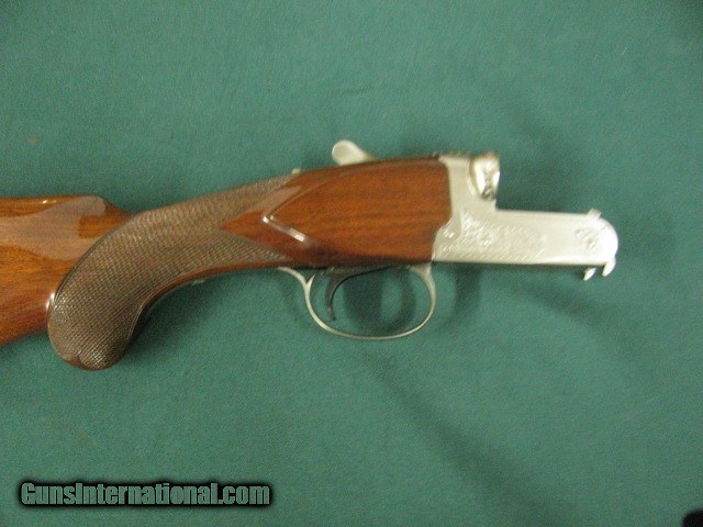 Description: 6939 Winchester 23 Pigeon XTR 20 gauge 26 inch barrels,ic/mod, round knob long tang, ALL ORIGINAL,Winchester butt plate,vent rib, 2 white beads, ejectors, single select trigger, opens/closes/tite,98-99% condition, correct Winchester locking case.rose and scroll coin silver engraved receiver. SOLD |