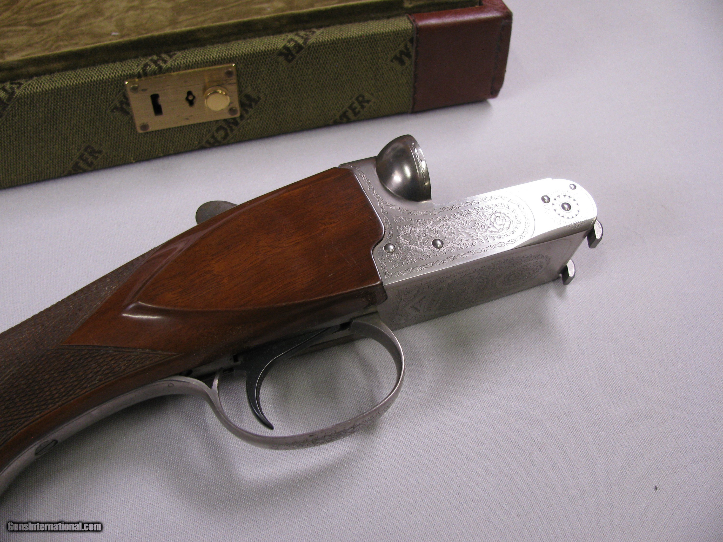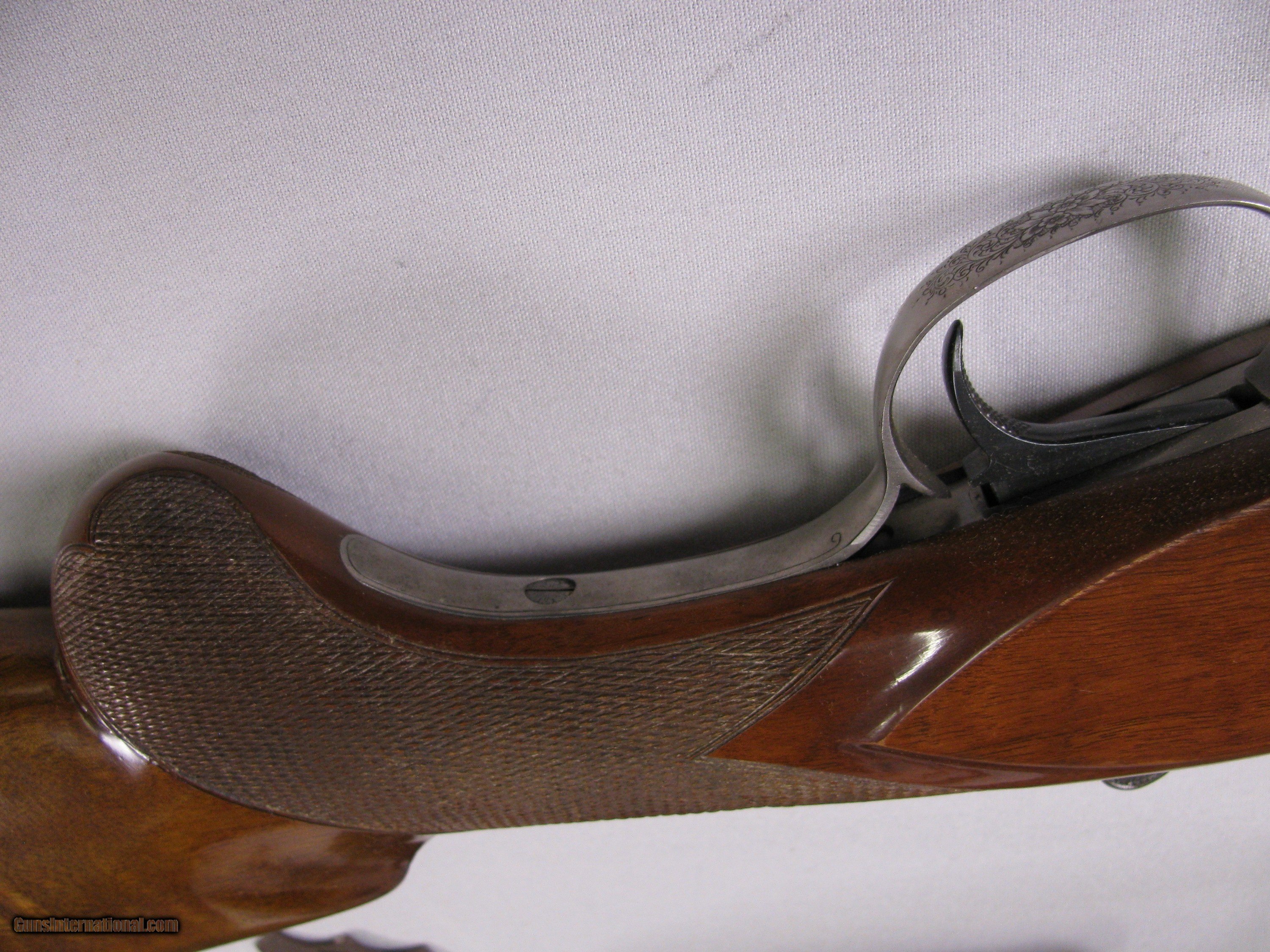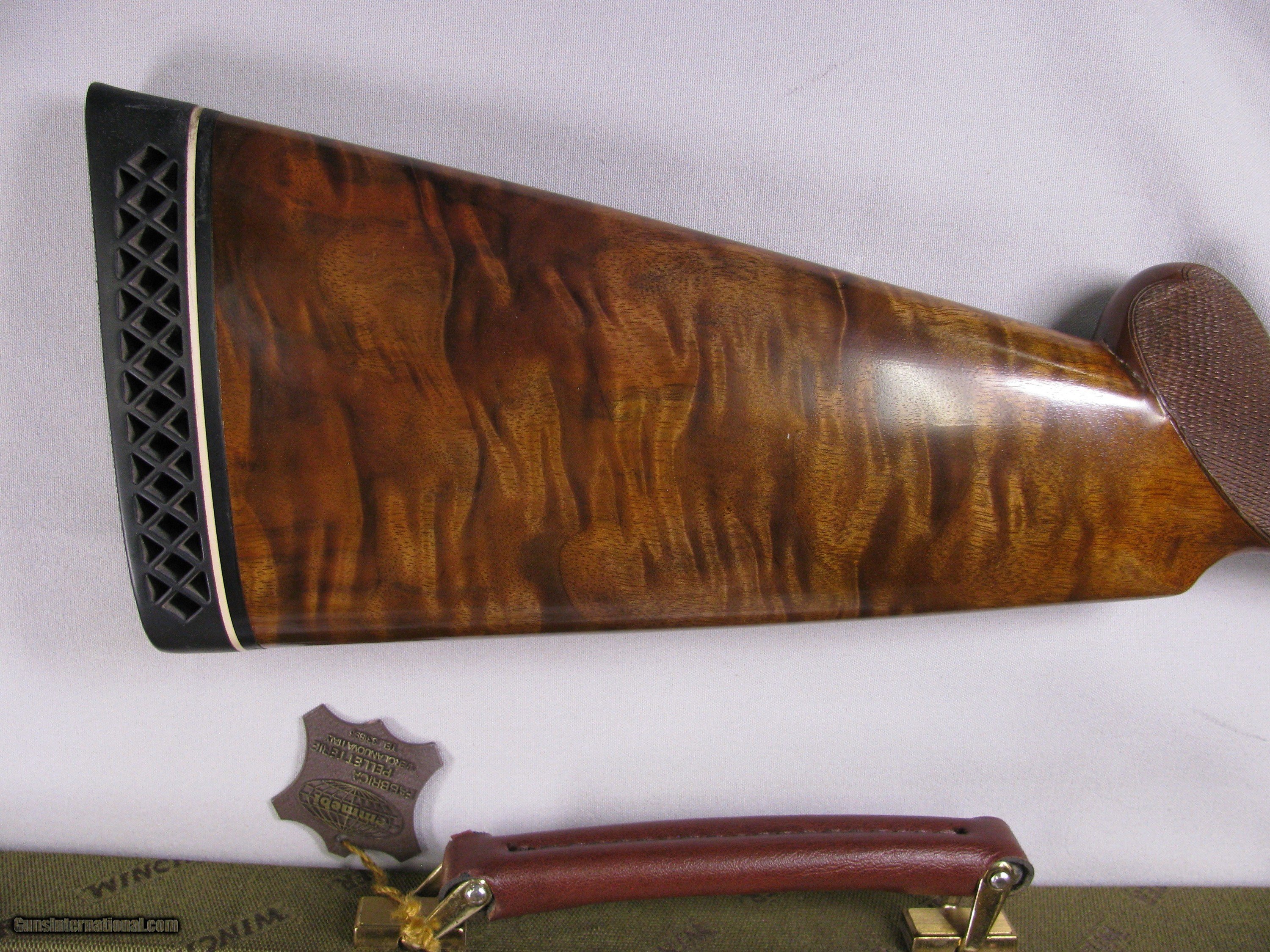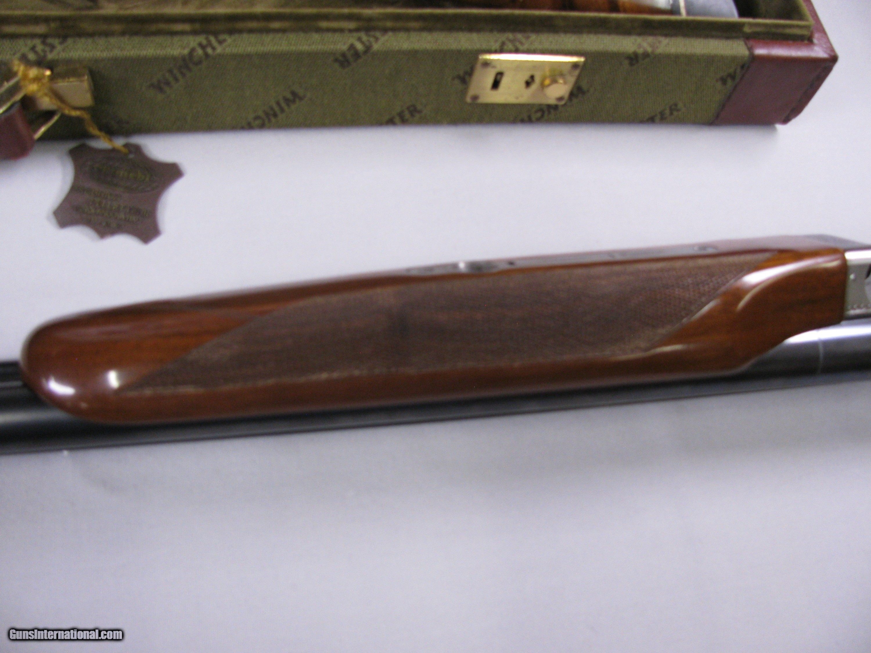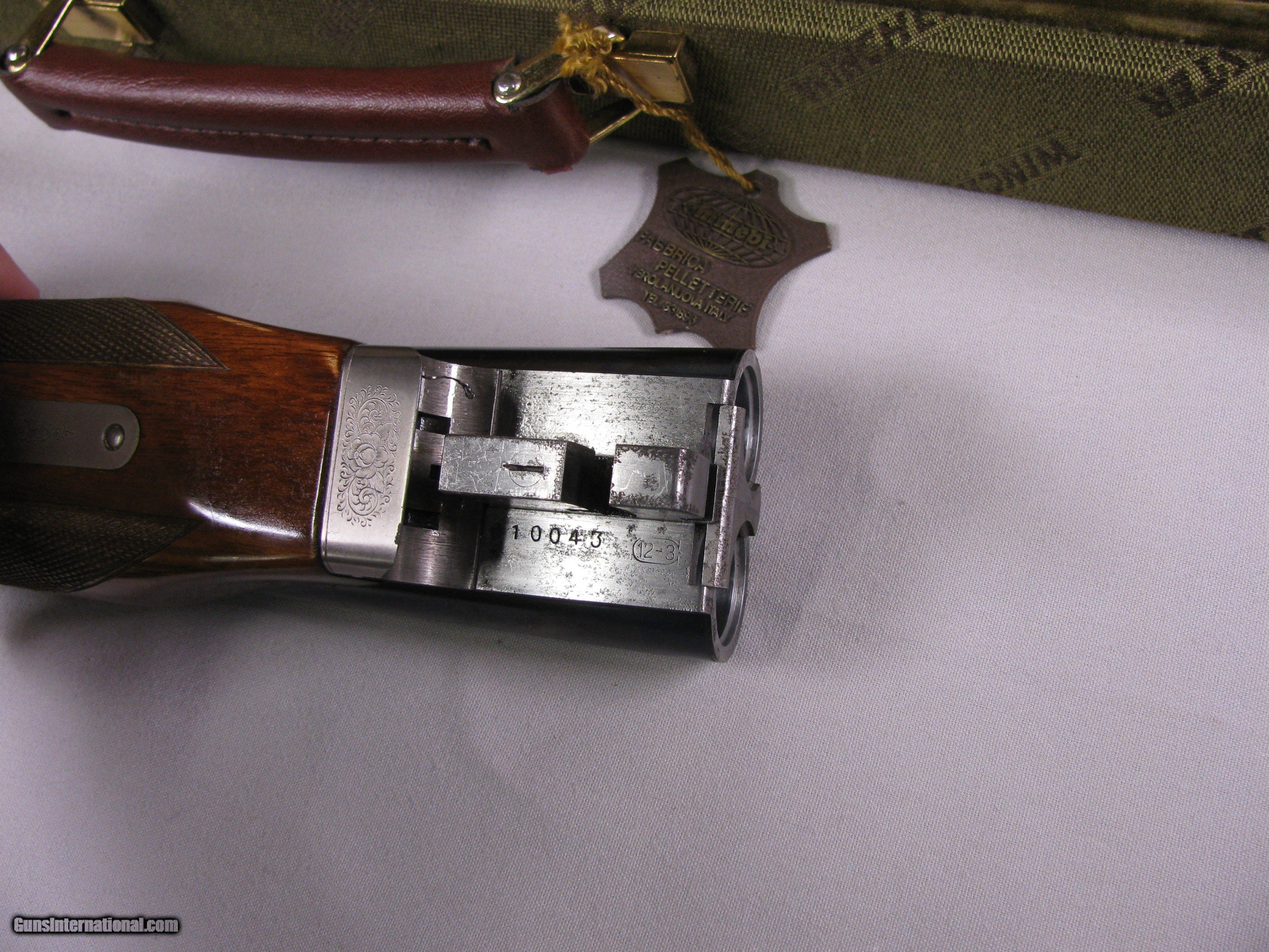 Description: 7898 Winchester 23 Pigeon XTR 12 gauge 26 inch barrels 2 3/4&3 inch chambers, Green Winchester Hard Case, screw in extended winchokes (2 SK, 2 IC, F, M, XF, IM), comes with tool bag and wrench round knob, vent rib, ejectors, Winchester butt plate, rose and scroll coin silver engraved receiver, opens closes tight, bores bright shiny, 2 white bead, A+ walnut excellent, 97% condition, great configuration. SOLD Shotgun Gauge: 12 Gauge |