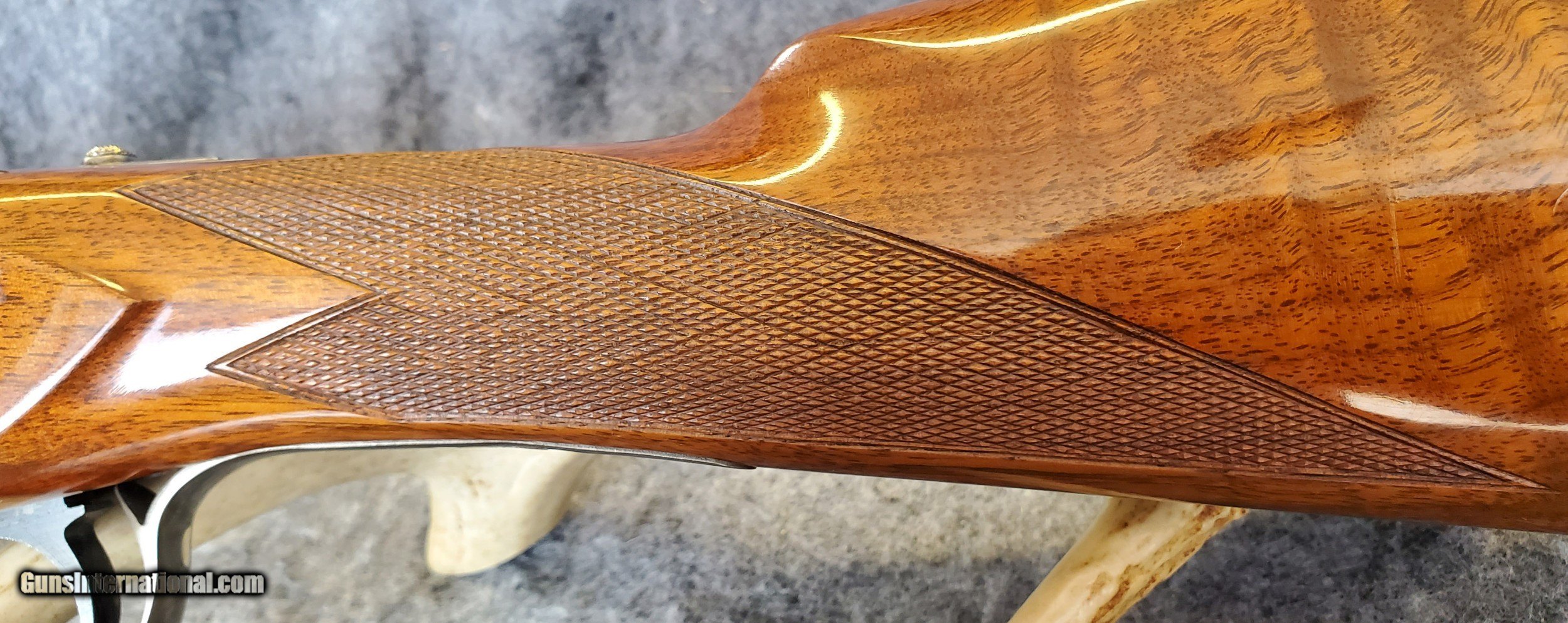 - The English style stock features its original finish and checkering. Overall, it's in great shape, with some minor handling marks. It retains its original integrity with no splits or cracks.