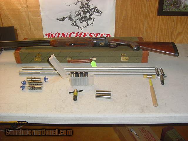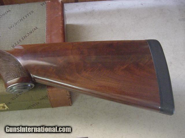 Description: 3223 Winchester Model 23 HEAVY DUCK 12g 30bls ejectors beavertail pistol grip Decel pad AA+Fancy Walnut.Engraved and signed by MASTER ENGRAVER GINO CARGNEL with GOLD/SILVER ducks,barrel band swirl.Briley light 30 inch full length tubes in 20 gauge with 2 Briley skeet chokes,9 Briley 12 ga screw chokes 2sk 2ic 3m,1f,11chokes total, series 26,hammer and 2 wrenches and correct Winchester Model 23 Heavy Duck 30inch case.NONE FINER SOLD |