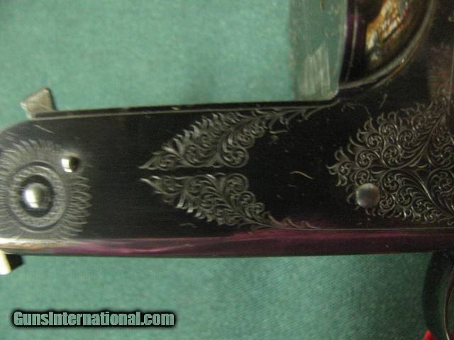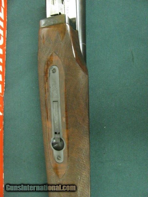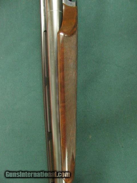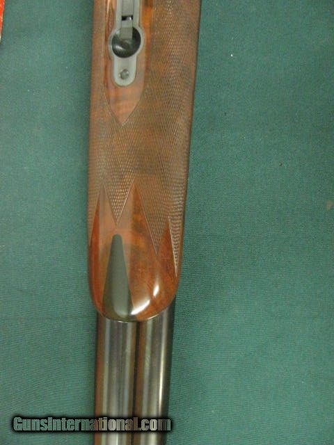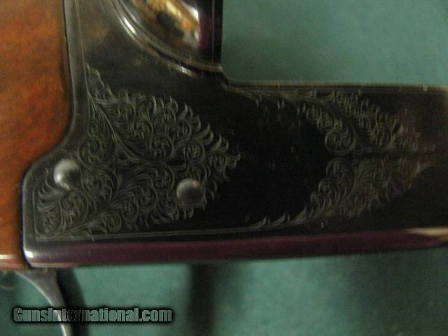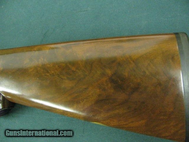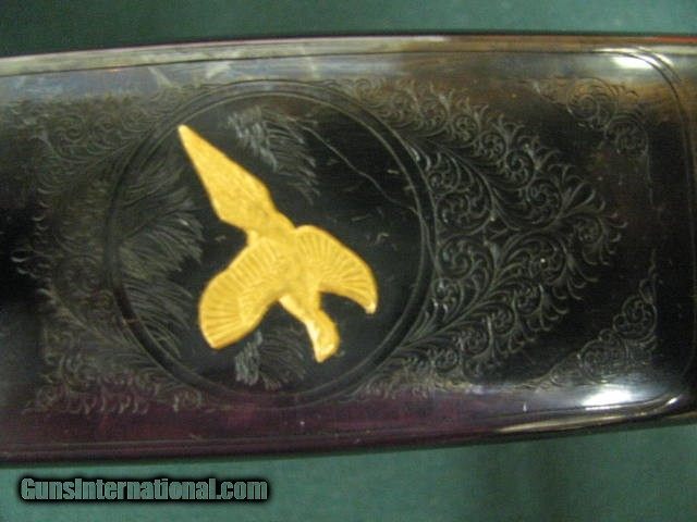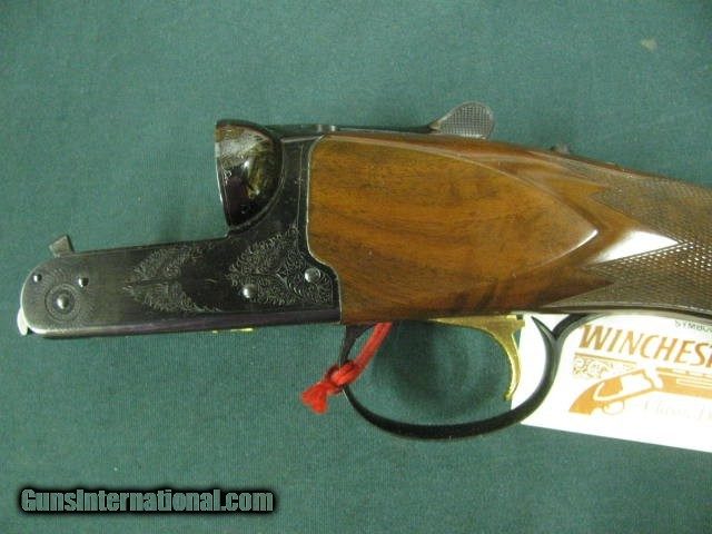 Description: 6804 Winchester 23 Classic 12 gauge 26 inch barrels, 2 3/4& 3 inch chambers, ejectors, vent rib, pistol grip with cap, Winchester butt pad, GOLD RAISE RELIEF PHEASANT ON BOTTOM OF RECEIVER, all papers hang tag etc.correct serialized box to gun, all complete, all original time capsule survivor, 99% condition. AA++Fancy Walnut SOLD |