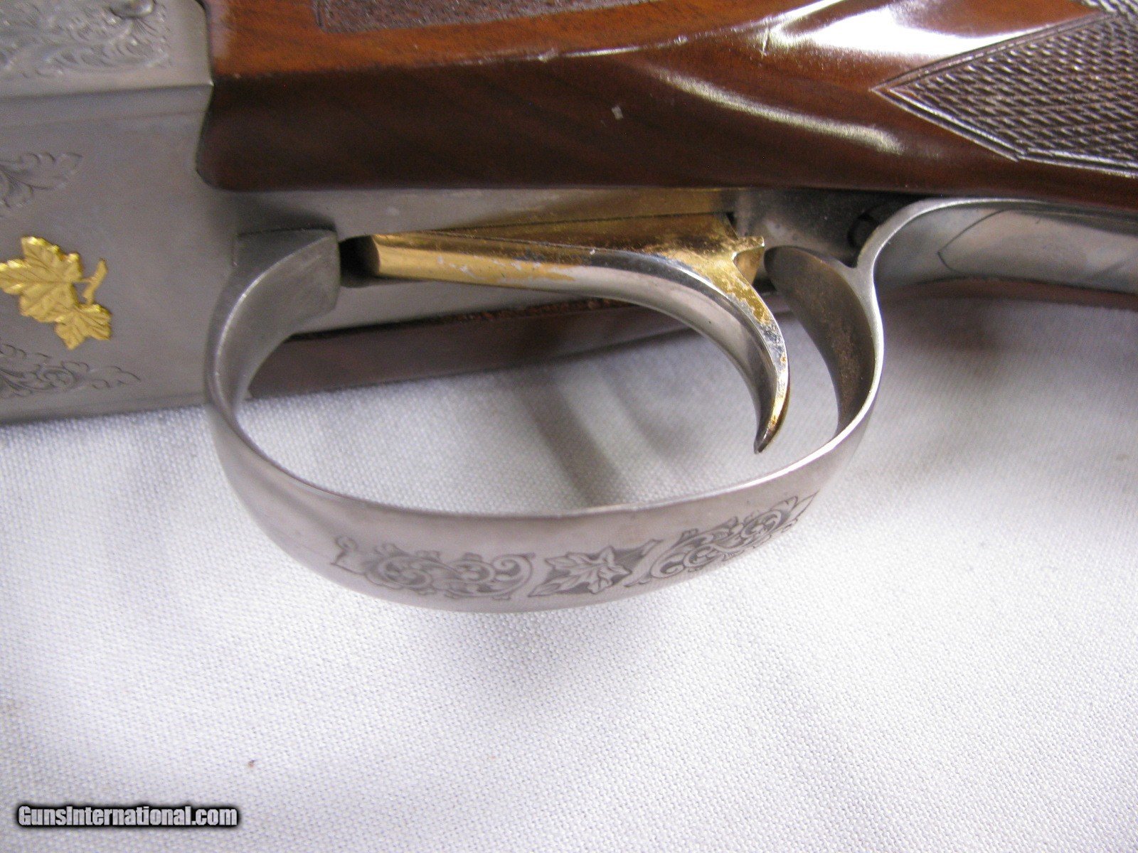 Description: 7854 Winchester 23 GRAND CANADIAN 20 gauge 26 barrels ic/mod, STRAIGHT GRIP, 100% original, ejectors, vent rib, single select trigger, GOLD RAISED maple leaf engraved on bottom of receiver, engraved coin silver receiver, AAA+++FANCY FEATHER CROTCH WALNUT, 97% condition, Great shooter! SOLD Shotgun Gauge: 20 Gauge |