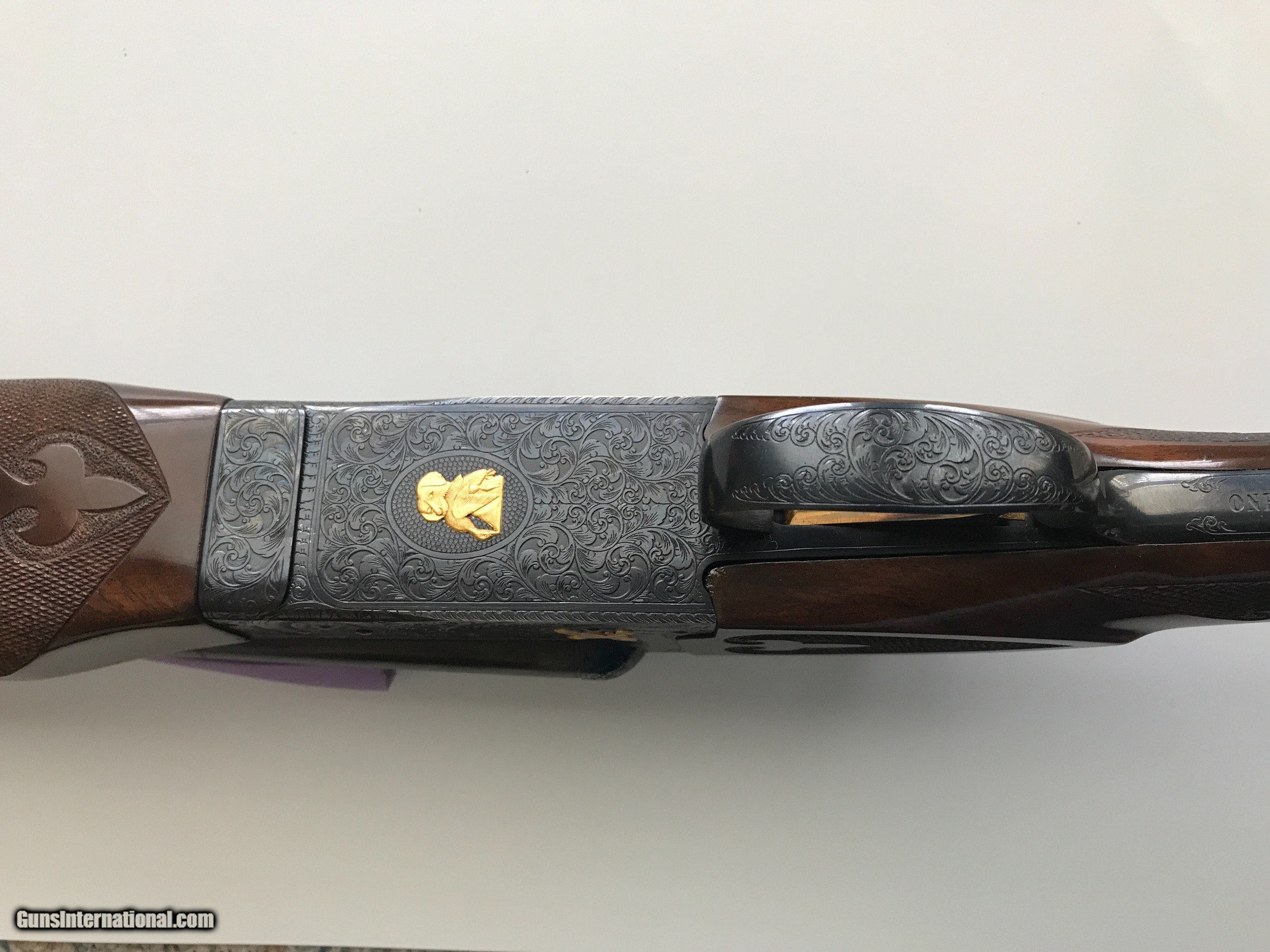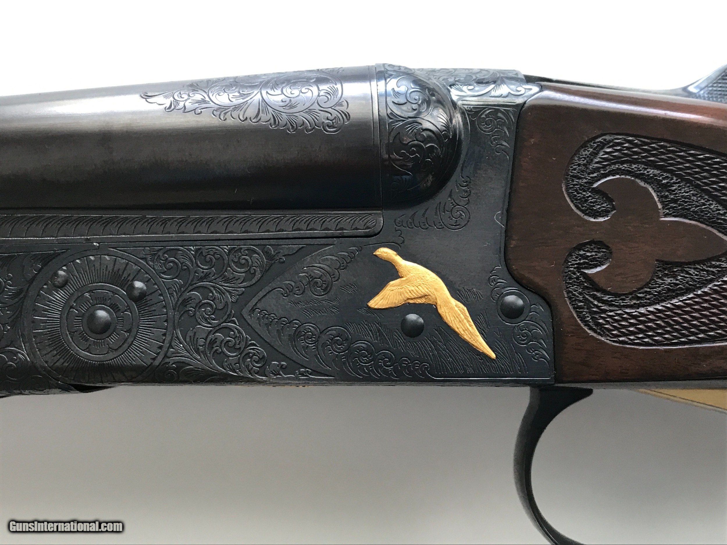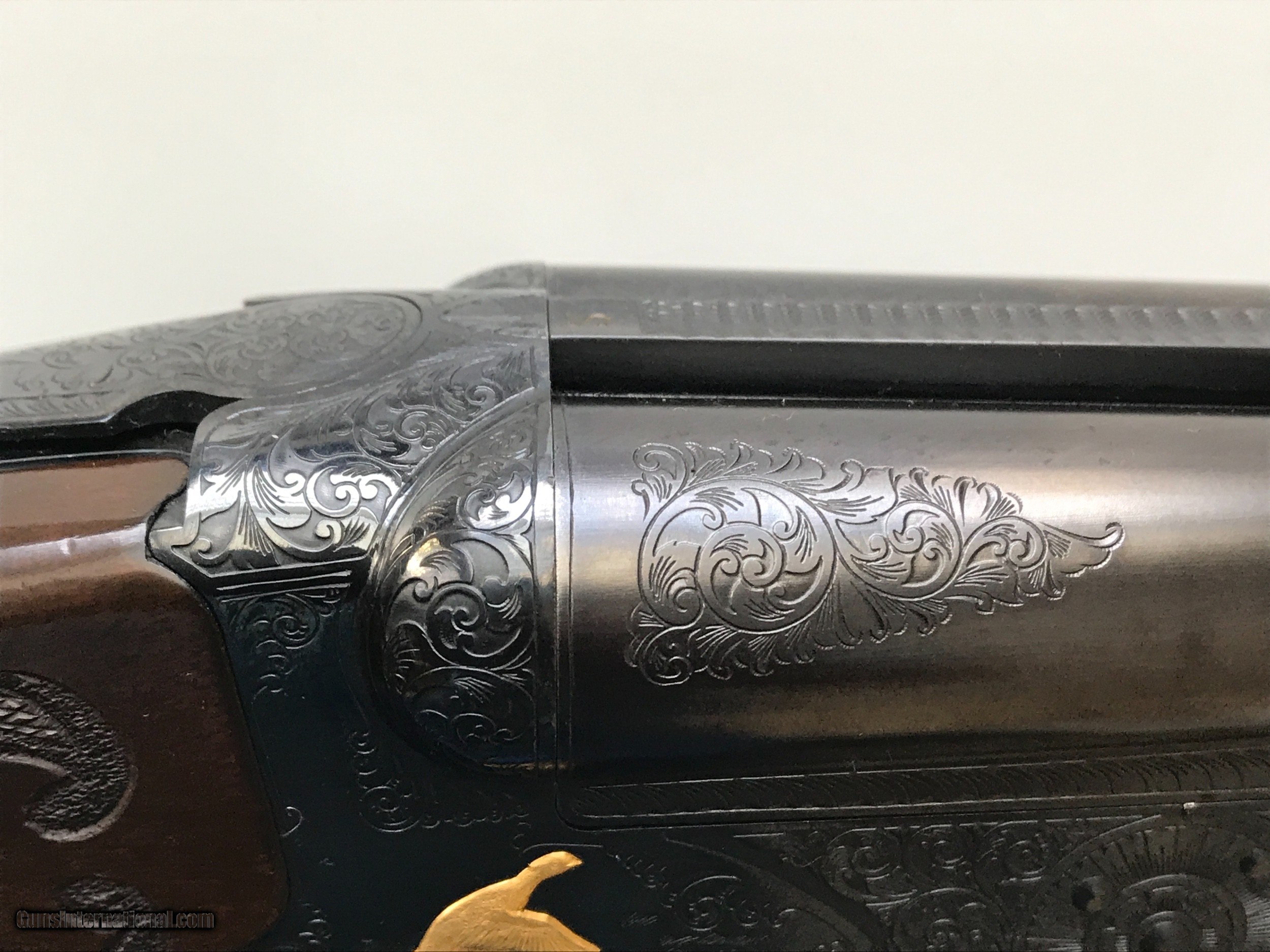 Description: Blued finish full coverage engraving w/gold inlay animals, both barrels 25 1/2" IC&MOD, beavertail forearm, pistol grip stock with "B" style checkering, SST, auto ejectors, factory case. SOLD Manufacturer: Winchester Model: 23 Barrels: 25 1/2 Gauge Info: 20&28 gauges Stock: pistol grip Stock Comb: 1 1/2 Stock Heel: 2 1/2 Fore End: beavertail LOP: 14 Chokes: IC&MOD Case: factory case |