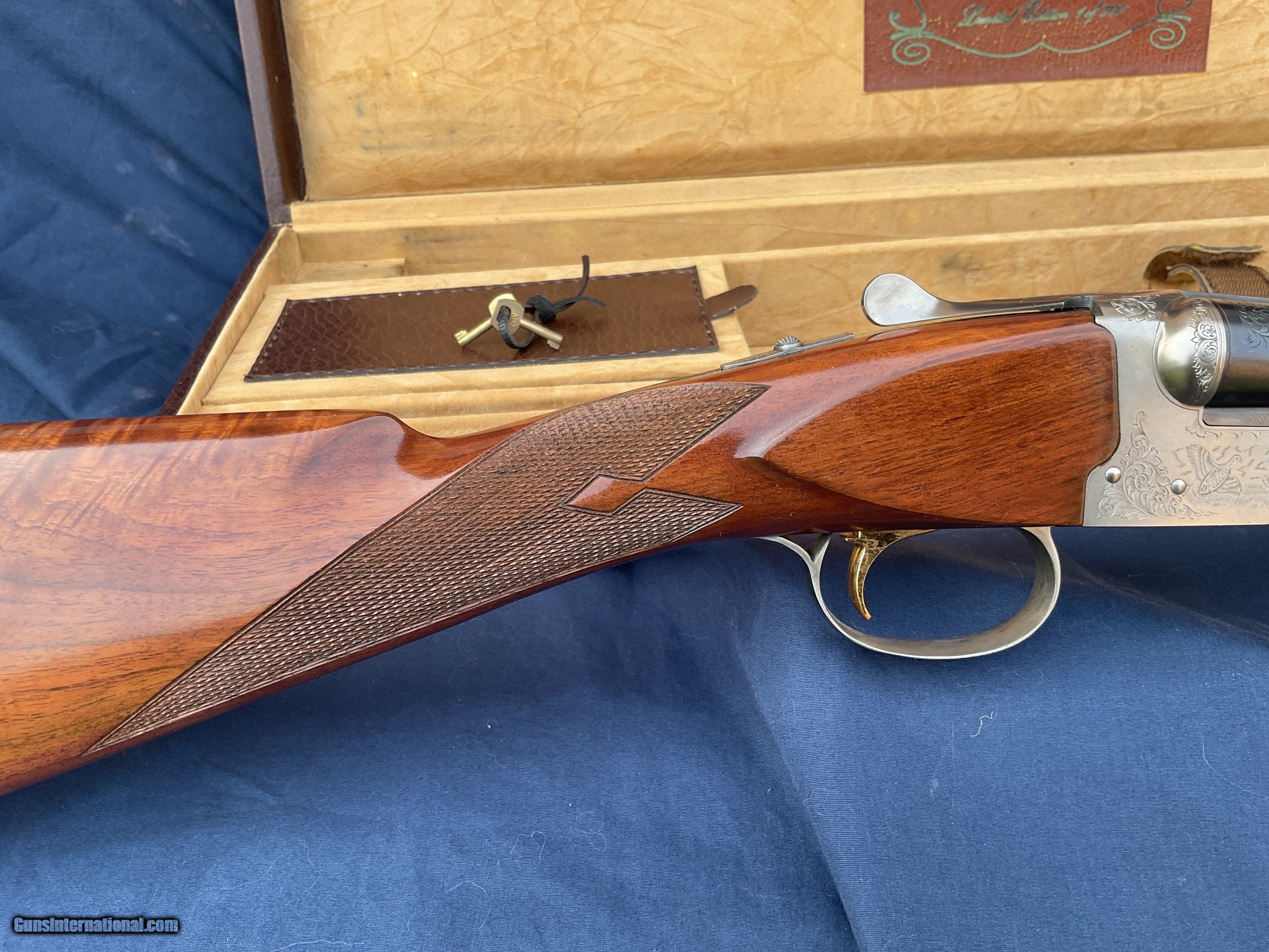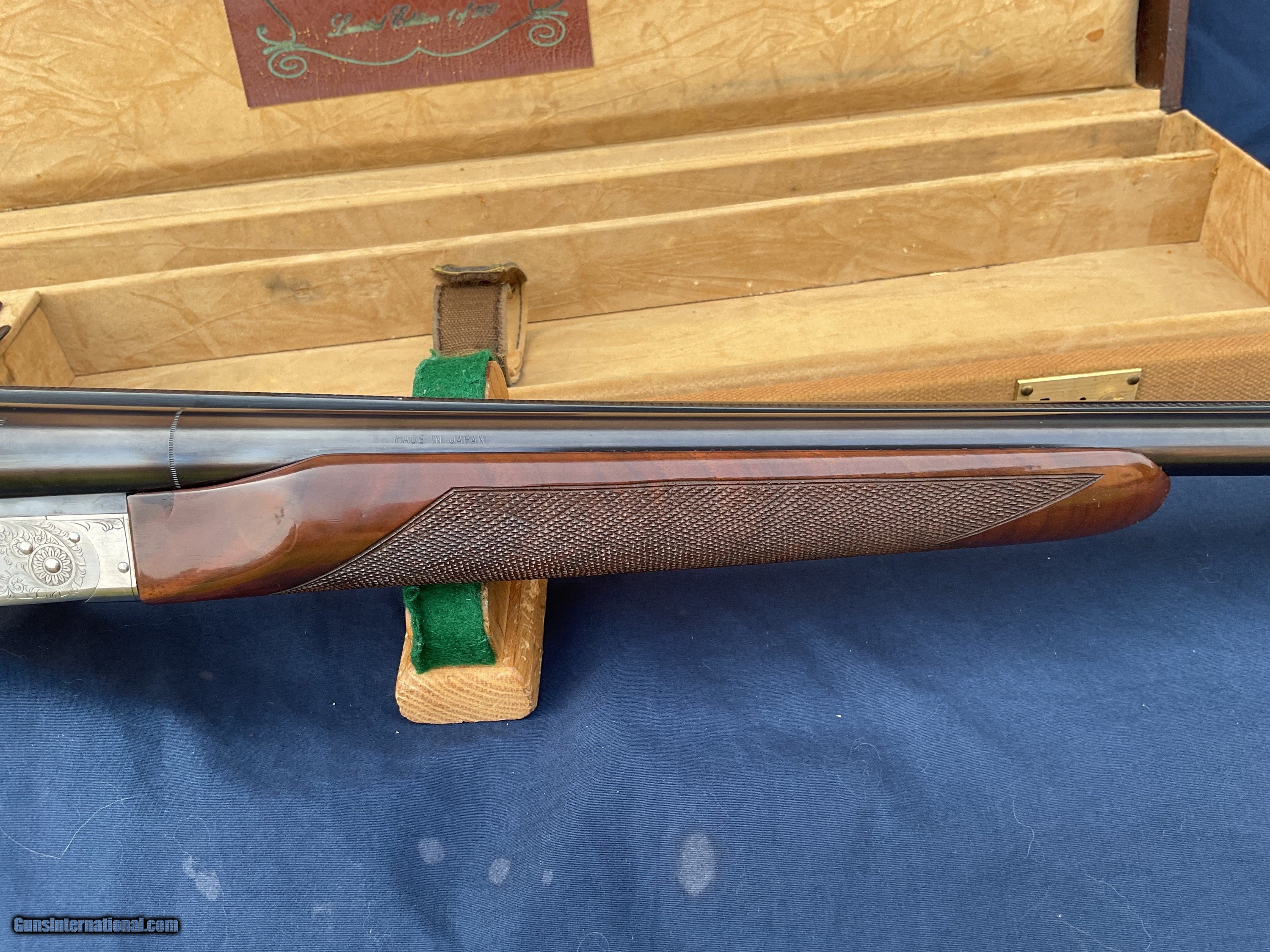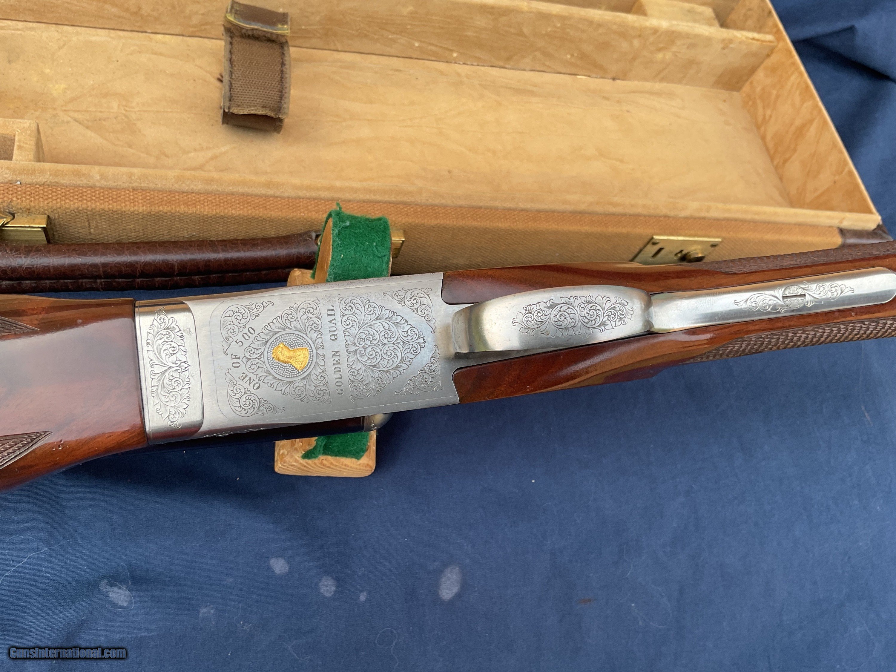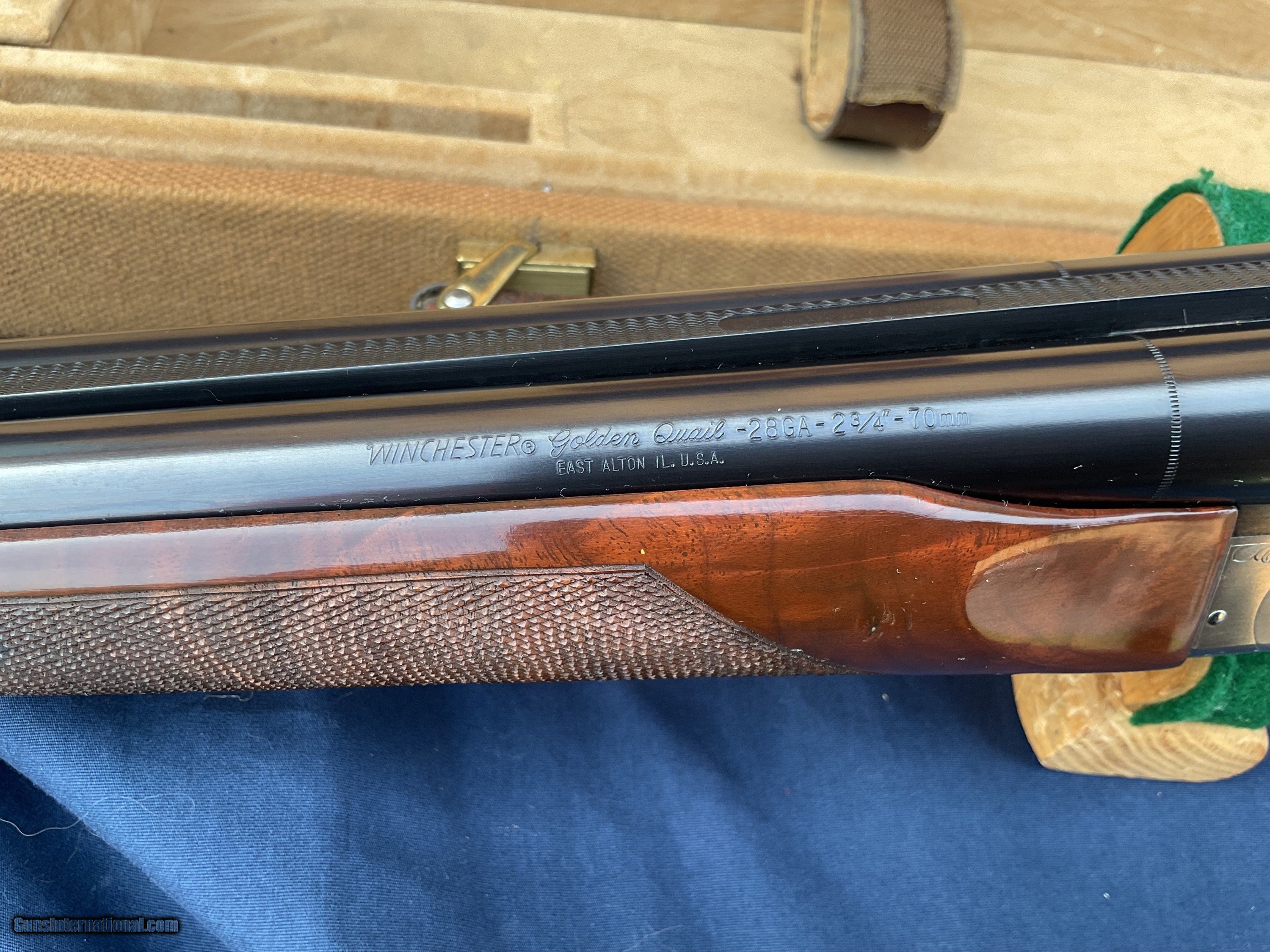 Description: Winchester Model 23 28 Gauge Golden Quail. Blue "Winchester Proof" steel barrels with 2 3/4 inch chambers, automatic ejectors, improved cylinder/modified chokes, single white bead sight, "GOLDEN QUAIL" marking on top of the rib, and light scroll engraving at the breech. Standard Golden Quail edition engraving on the receiver with a dog and quail scene on the left, two quail in flight on the right, and a gold inlaid quail head on the underside. The underside is marked "ONE OF 500". Checkered beavertail forearm and straight grip stock with engraved fittings, and solid Winchester recoil pad. Matching serial numbers. Dimensions: 25 1/2" barrels with solid rib. Finish coin / blue 28 gauge Stocks walnut straight grip / checkered Condition: Excellent overall with 95% plus original finish, light handling marks, and sharp checkering on the wood. Mechanically excellent. Comes with original hard case. Hard shows handling marks and some staining. I offer a layaway and will consider trades. Must ship to a FFL or Curio and Relics license holder. Please feel free to ask questions. SOLD |