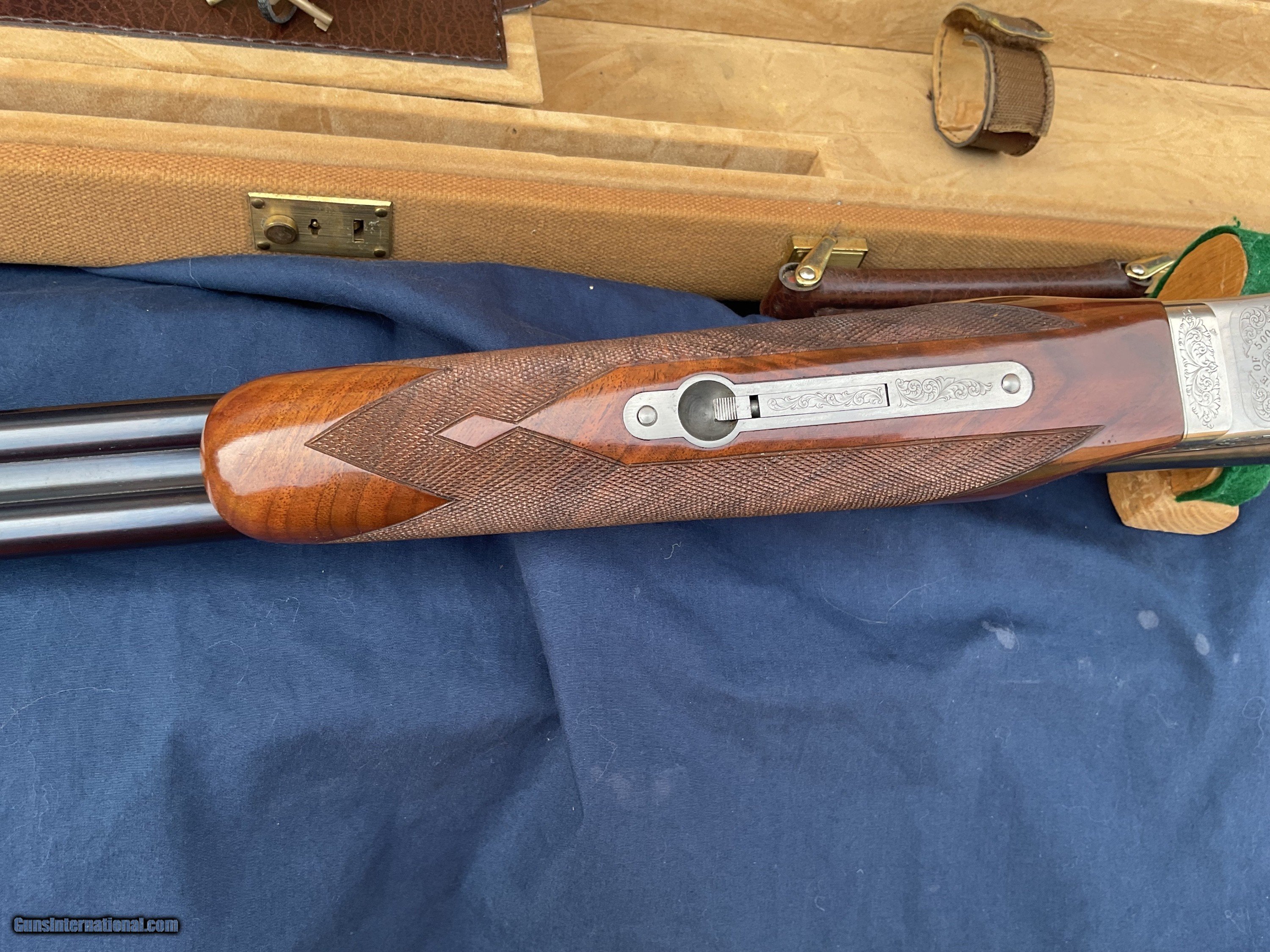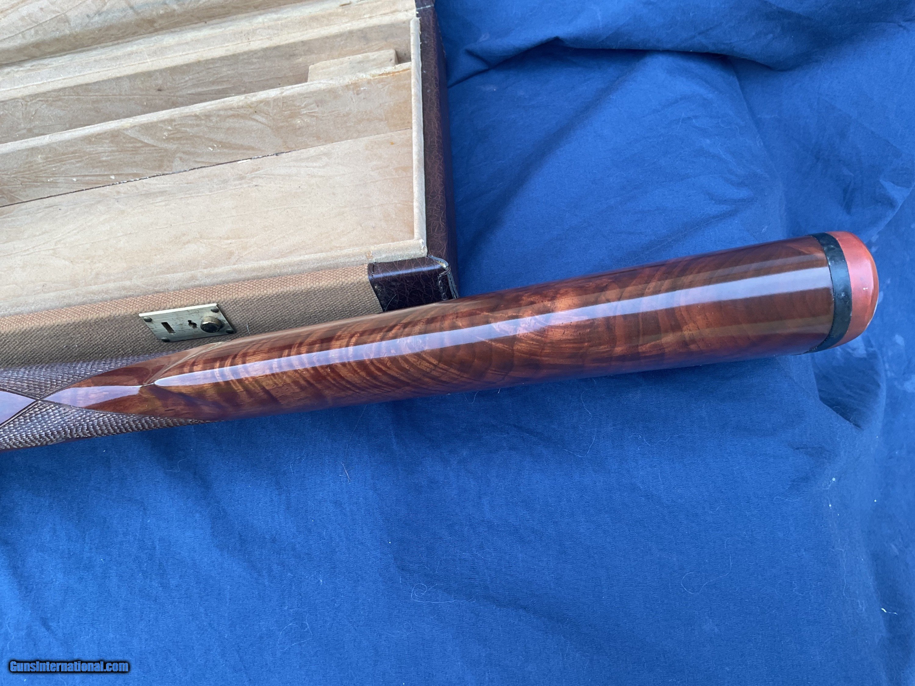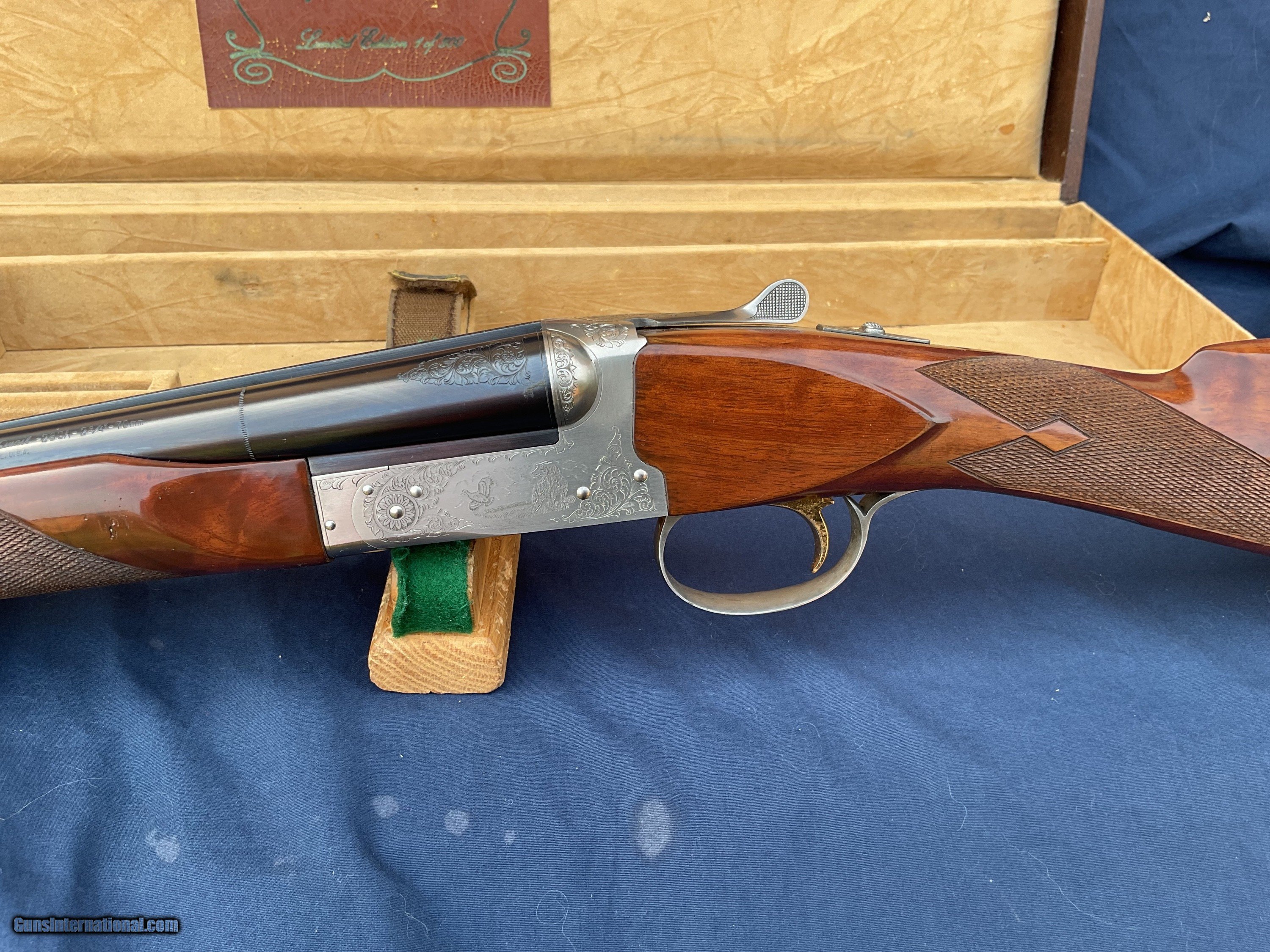 Description: Winchester Model 23 28 Gauge Golden Quail. Blue "Winchester Proof" steel barrels with 2 3/4 inch chambers, automatic ejectors, improved cylinder/modified chokes, single white bead sight, "GOLDEN QUAIL" marking on top of the rib, and light scroll engraving at the breech. Standard Golden Quail edition engraving on the receiver with a dog and quail scene on the left, two quail in flight on the right, and a gold inlaid quail head on the underside. The underside is marked "ONE OF 500". Checkered beavertail forearm and straight grip stock with engraved fittings, and solid Winchester recoil pad. Matching serial numbers. Dimensions: 25 1/2" barrels with solid rib. Finish coin / blue 28 gauge Stocks walnut straight grip / checkered Condition: Excellent overall with 95% plus original finish, light handling marks, and sharp checkering on the wood. Mechanically excellent. Comes with original hard case. Hard shows handling marks and some staining. I offer a layaway and will consider trades. Must ship to a FFL or Curio and Relics license holder. Please feel free to ask questions. SOLD |