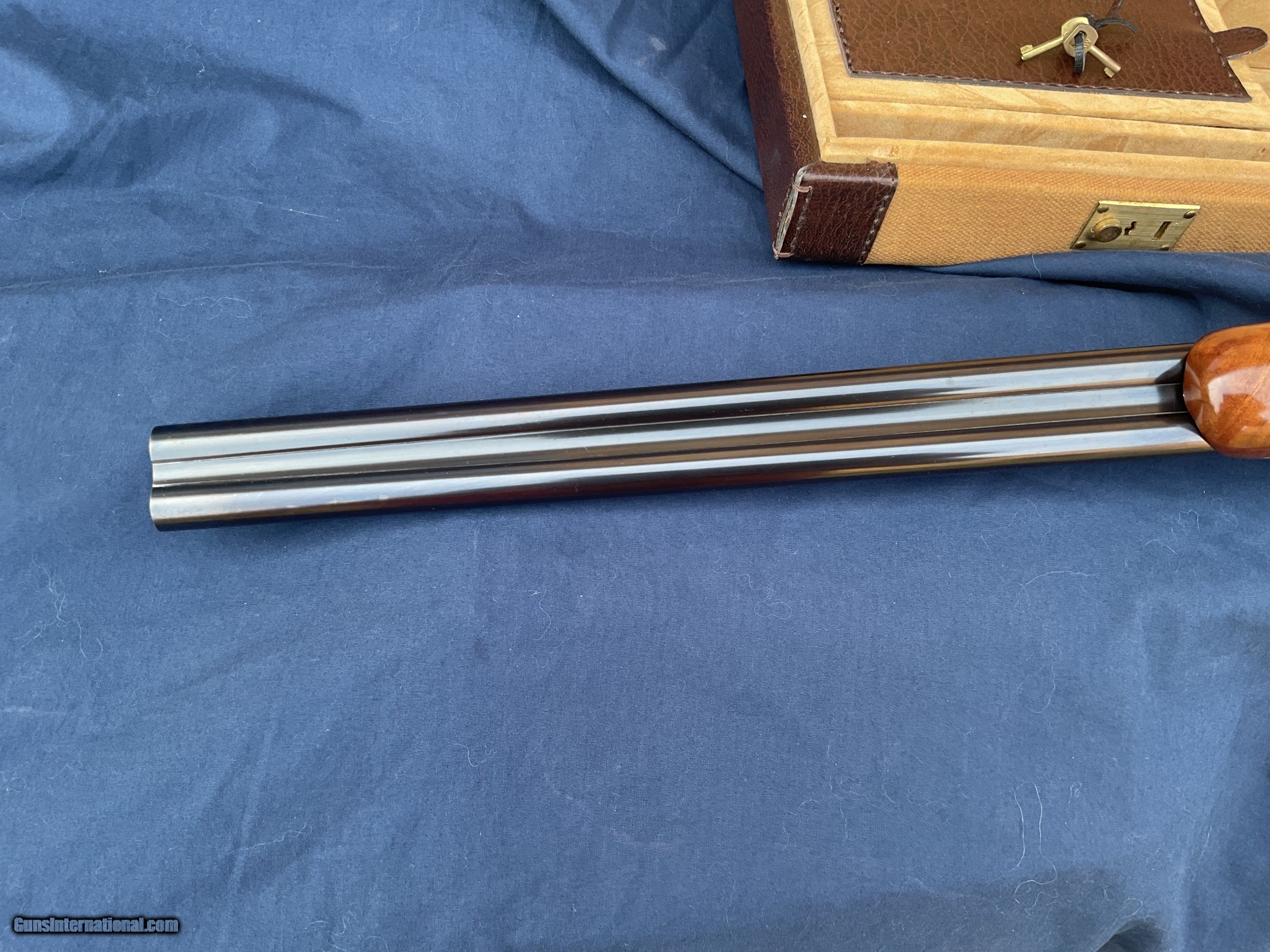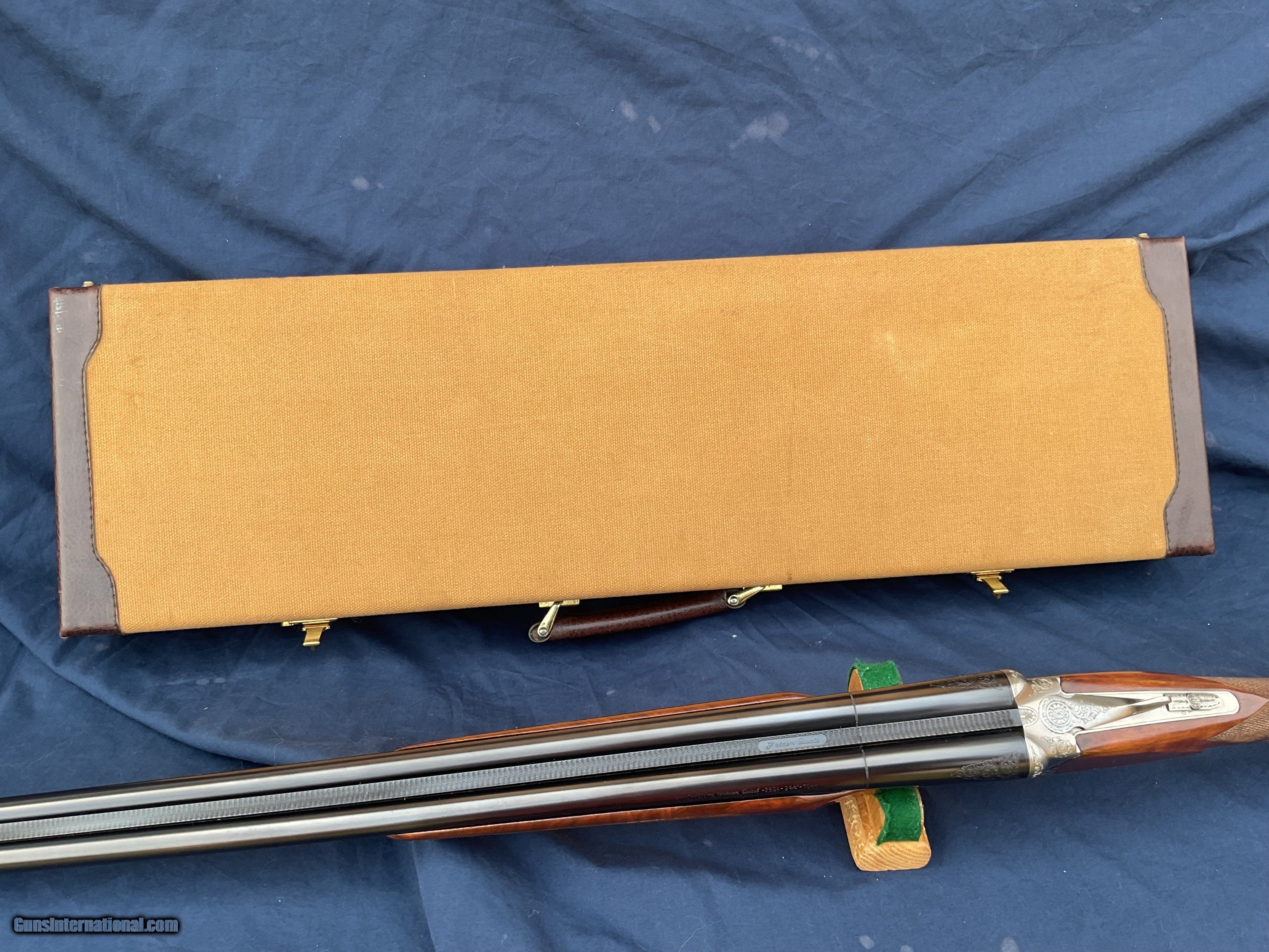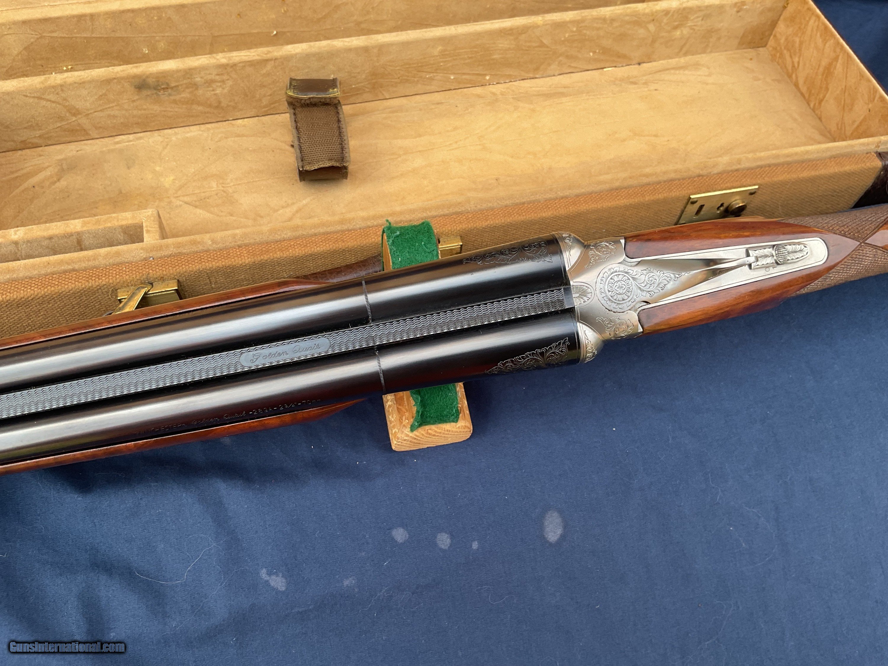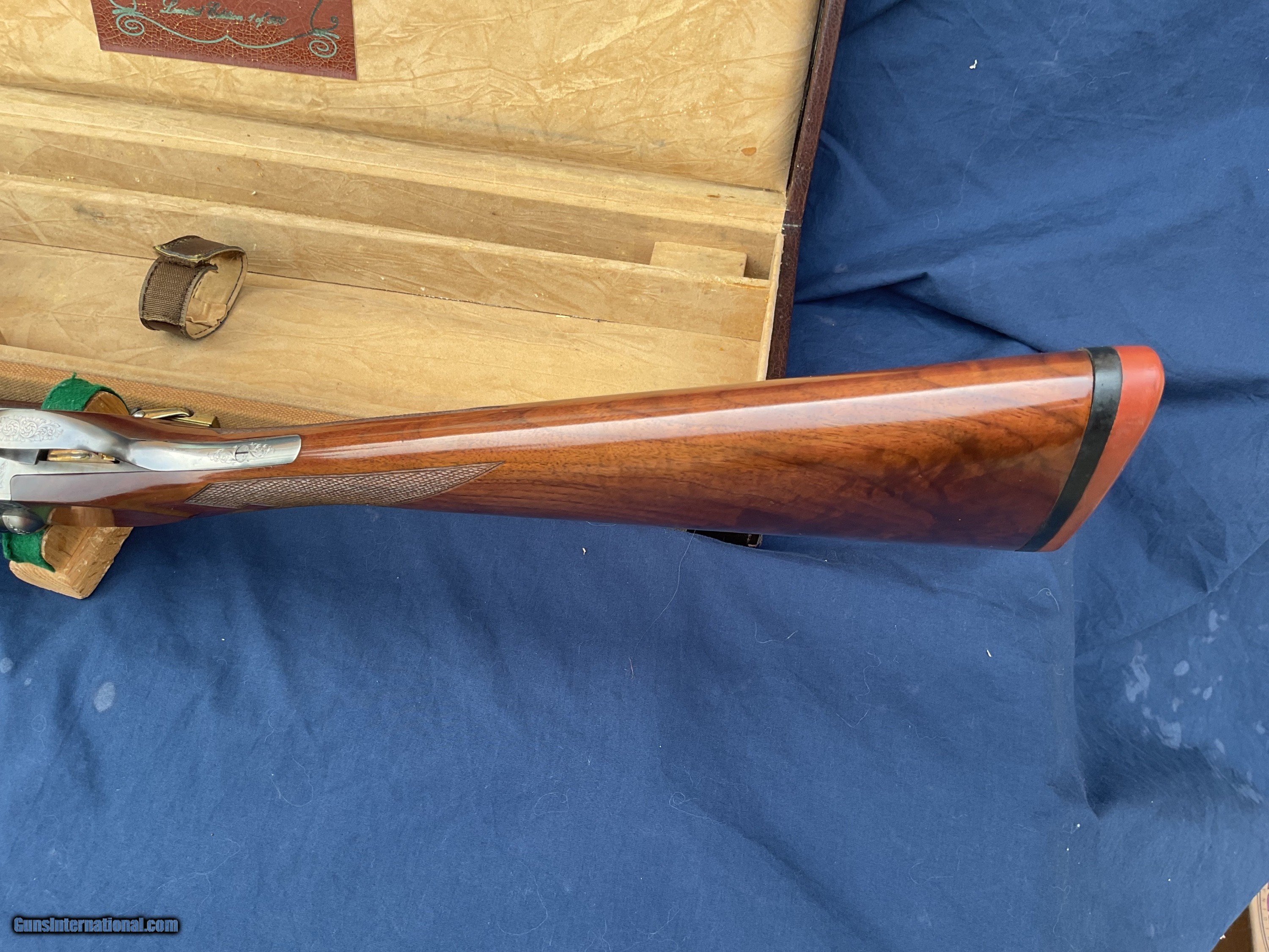 Description: Winchester Model 23 28 Gauge Golden Quail. Blue "Winchester Proof" steel barrels with 2 3/4 inch chambers, automatic ejectors, improved cylinder/modified chokes, single white bead sight, "GOLDEN QUAIL" marking on top of the rib, and light scroll engraving at the breech. Standard Golden Quail edition engraving on the receiver with a dog and quail scene on the left, two quail in flight on the right, and a gold inlaid quail head on the underside. The underside is marked "ONE OF 500". Checkered beavertail forearm and straight grip stock with engraved fittings, and solid Winchester recoil pad. Matching serial numbers. Dimensions: 25 1/2" barrels with solid rib. Finish coin / blue 28 gauge Stocks walnut straight grip / checkered Condition: Excellent overall with 95% plus original finish, light handling marks, and sharp checkering on the wood. Mechanically excellent. Comes with original hard case. Hard shows handling marks and some staining. I offer a layaway and will consider trades. Must ship to a FFL or Curio and Relics license holder. Please feel free to ask questions. SOLD |