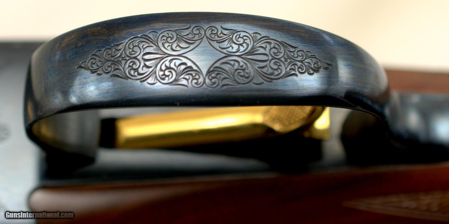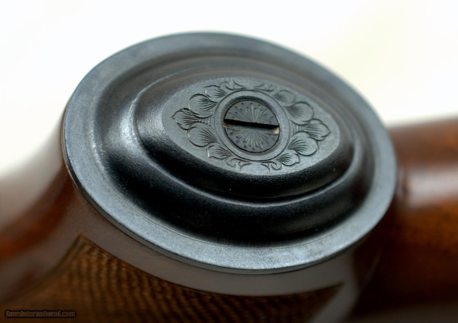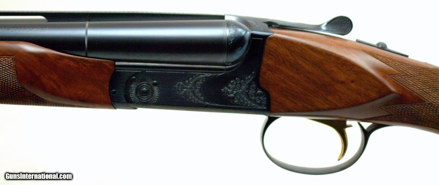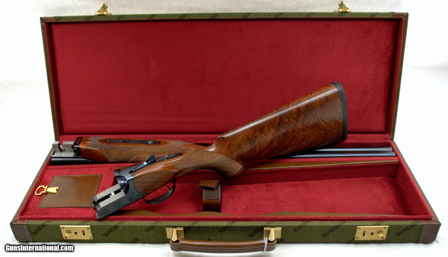 Description: WINCHESTER MODEL 23 CLASSIC 20GA ... 26" Matte Vent Rib Barrels ... LOA 43" ... LOP 14 1/2" ... DAH 2" ... DAC 1 1/2" ... 3" chambers ... IC / MOD ... ejectors ... Gold washed single trigger ... Selective tang mounted safety ... ebony tip insert ... steel grip cap ... engraved Manufactured in Japan, the Model 23 Classic was only imported in 1986 and 1987. Dual white bead sights on the matte rib with the East Alton address on the left barrel, "MADE IN JAPAN" on the right, a gold washed "20" marking on the rear of the rib, improved cylinder and modified chokes, 2 3/4 and 3 inch chambers with ejectors. The frame is lightly scroll engraved with a gold finished single trigger and a gold inlaid pheasant on the underside of the receiver. Tang mounted automatic safety with barrel selector. Mounted on a checkered walnut pistol grip stock with a nicely veed, ebony insert at the forearm tip. Features an engraved steel grip cap, unmarked gold inlaid inscription panel in the toe line of the butt stock and a solid Winchester recoil pad. Length of pull is 14 1/2 inches. Presented complete with a Winchester luggage-style takedown case and the original factory box numbered to the gun. The gun is beautiful and in like new condition. SHIPPING INFORMATION: Buyer pays all shipping costs. We offer flat rate $35 shipping & insurance to lower 48 states on guns under $2000. Hand guns ship 2nd Day. (M-F delivery only) Long guns ship ground. (3 to 5 days) We offer combined shipping: $35 for first gun and $15 for each additional in same box. Shipments will be delayed on any holiday. Alaska & Hawaii will be calculated on each order. We make every effort to ship the same day we receive payment & paperwork. SOLD Manufacturer: Winchester Model: 23 Serial Number: CL20032E Bore: 20 Chambers: 3 Ejectors: Yes Condition: Like New Metal Condition: Like New Wood Condition: Excellent Bore Condition: Shiney Barrels: 26 Action: Inertial Triggers: Single Gauge Info: 20 Stock: Walnut Stock Comb: 1 1/2 Stock Heel: 2 Stock Cast: neutral Fore End: ebony Butt Pad: Winchester Solid LOP: 14 1/2 Rib: Matte Vent Finish: Blue Sights: Dual white bead Manufacture Date: 1986 Chokes: Fixed Choke Left: IC Choke Right: Mod Engraving: Factory Extras: Gold inlaid Case: Winchester Item Location: Texas |