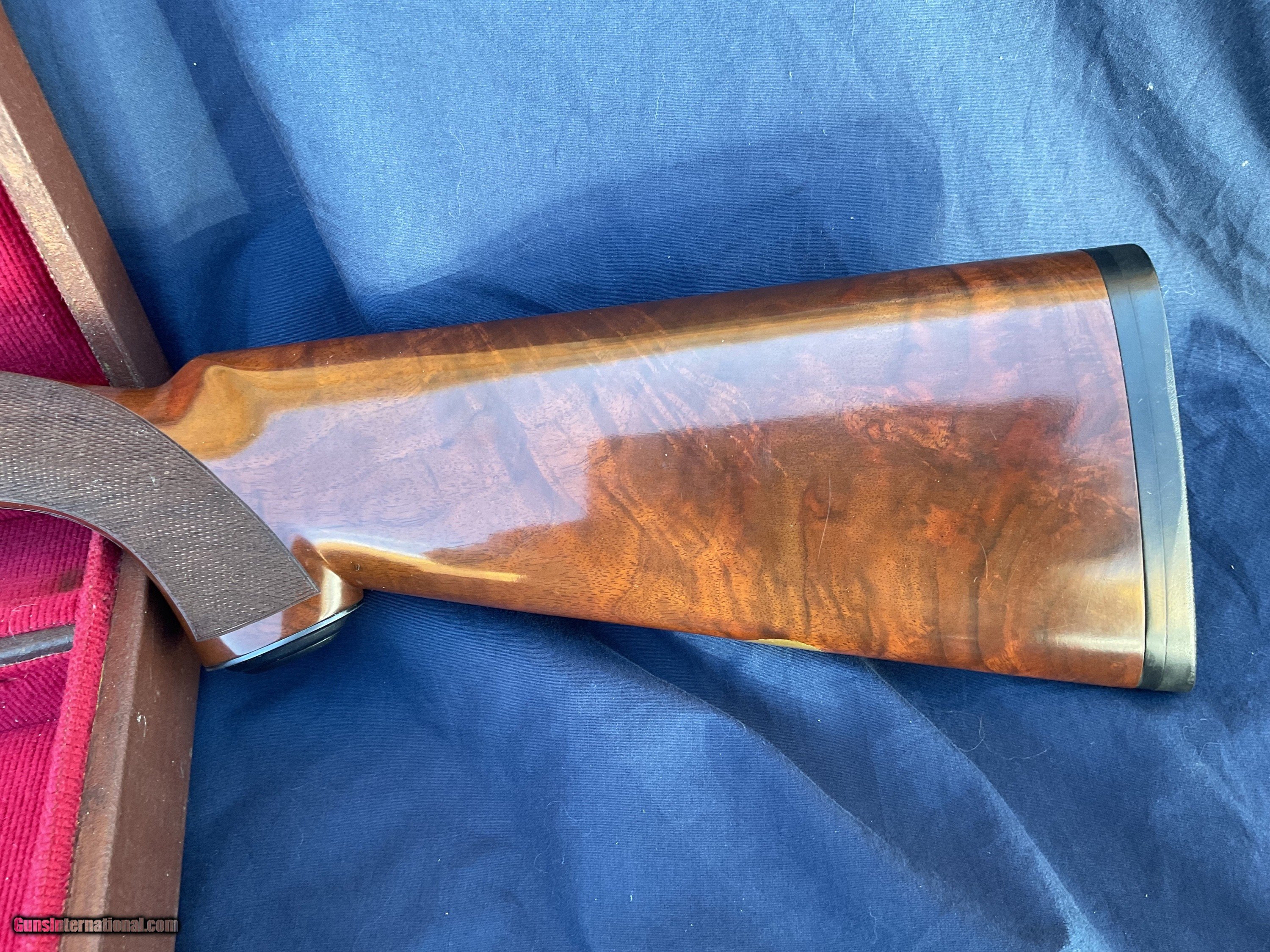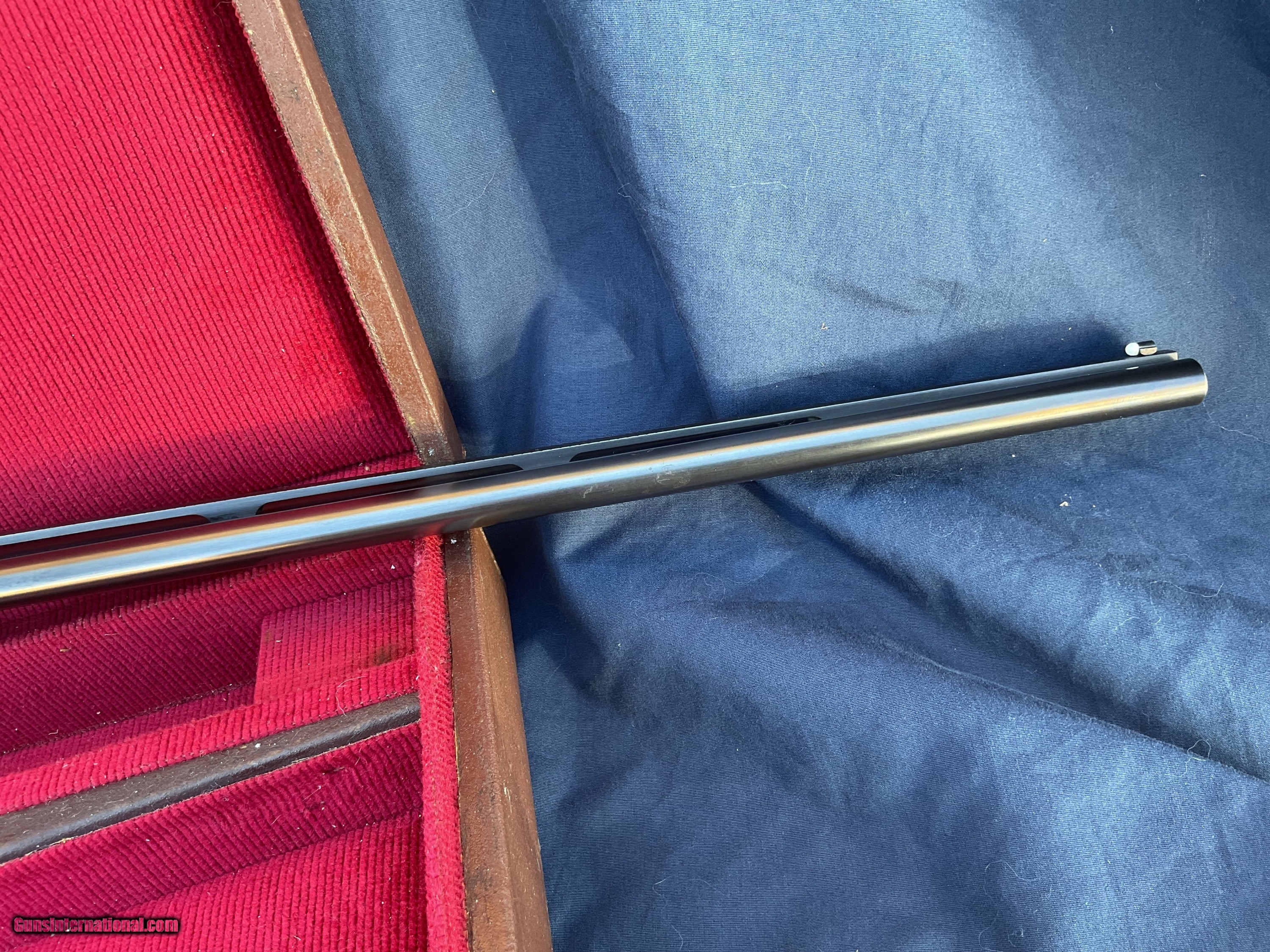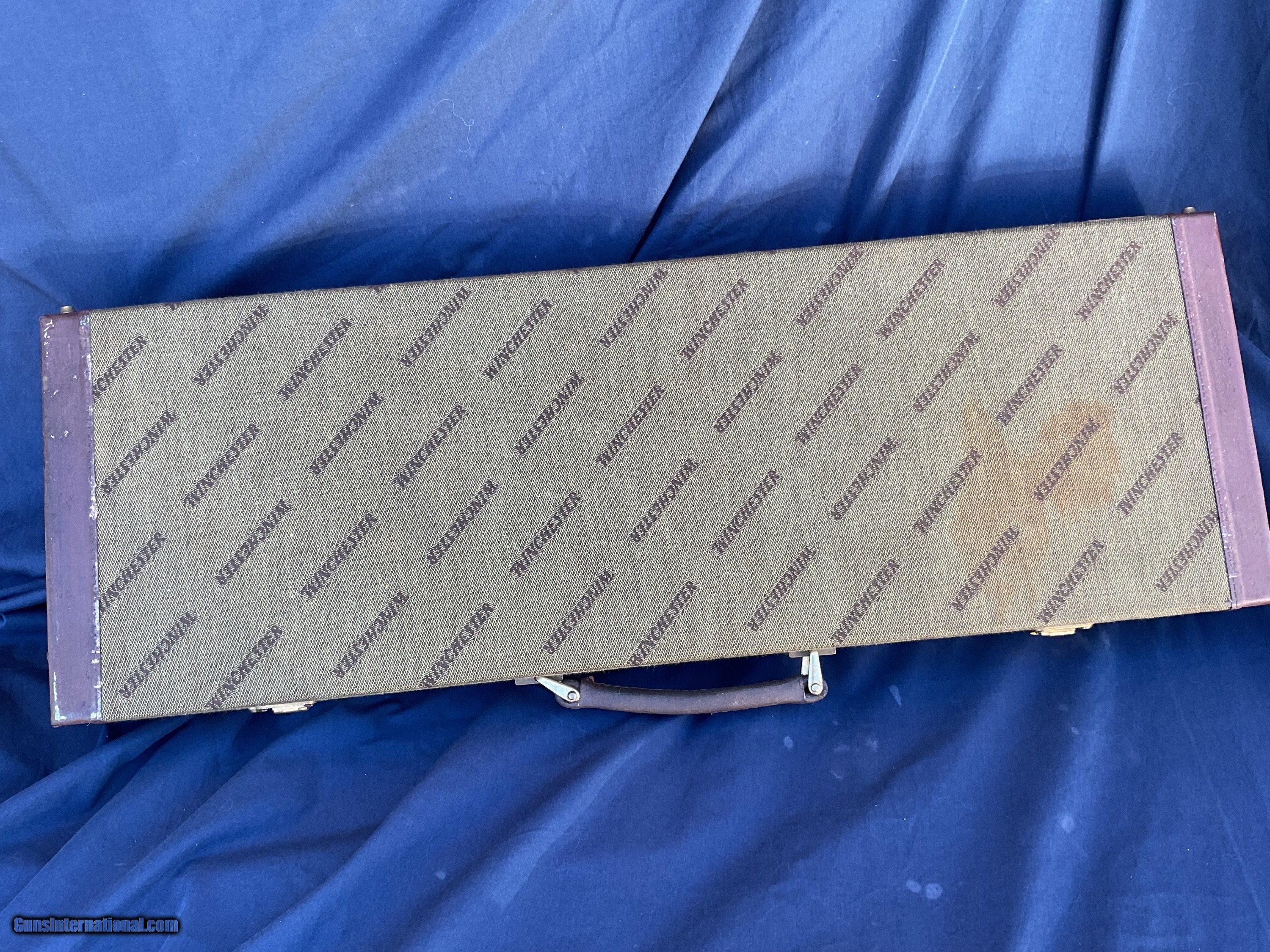 Description: Blued Winchester proof barrels with dual white bead sights on the raised ventilated rib, standard barrel legends, "410" on the rib at the breech, 3 inch chambers, chokes marked modified/full, and ejectors. Blued action with light floral scroll engraving on the left and right with a circular panel scene on the bottom with gold inlaid quail in a prairie surrounded by floral scrolls, engraved top lever, and automatic selective safety. Mounted on a nicely figured checkered beavertail forearm and pistol grip stock with Deeley forend release with engraved fittings, steel pistol grip cap, blank initial oval and Winchester solid recoil pad. Factory length of pull. Condition is extremely nice, retaining 97% plus original blue finish with limited handling marks and crisp engraving. Wood is very fine with some scattered minor handling marks, and crisp checkering. There are two areas on the barrels: right barrel subtle smooth staining and bottom of barrel near muzzle end there is a tiny corrosion spot (see pics). Comes with original Winchester case, two snap caps, original invoice when originally purchased, hang tag, and other factory literature Mechanically excellent. Must ship to FFL license holder. I will consider trades for Winchester Lever Actions or Colt SAA. Feel free to run any trade by me that is considered an equal value. Please feel free to ask questions. SOLD |