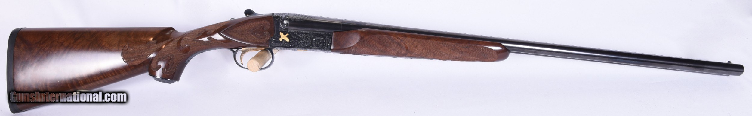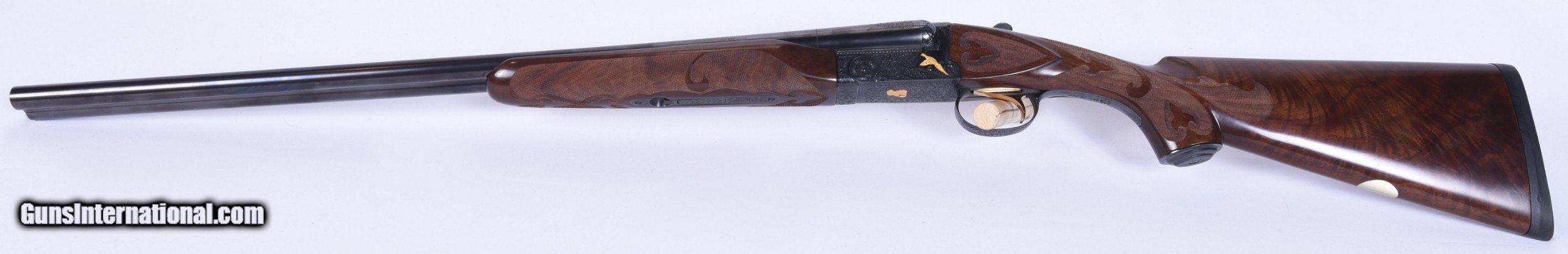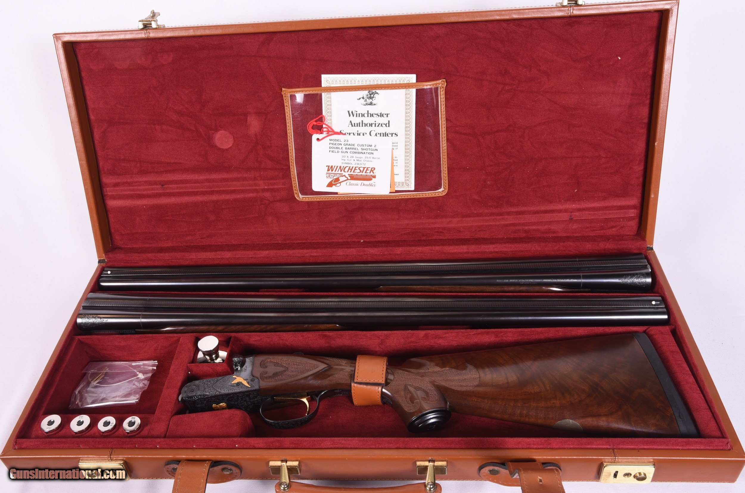 Description: Winchester Model-23 Deluxe 28/20Ga. 2 barrel set. 26" barrel IC/M 20Ga 3" chamber. 26" barrel 28Ga IC/M 2 3/4" chamber. Gold inlays. 14 1/4" LOP over Winchester butt pad. SOLD Engraving: Yes Extras: Gold Inlay Case: Yes Item Location: 35209 |