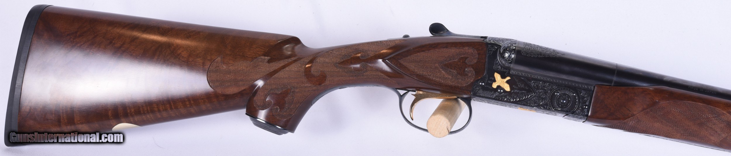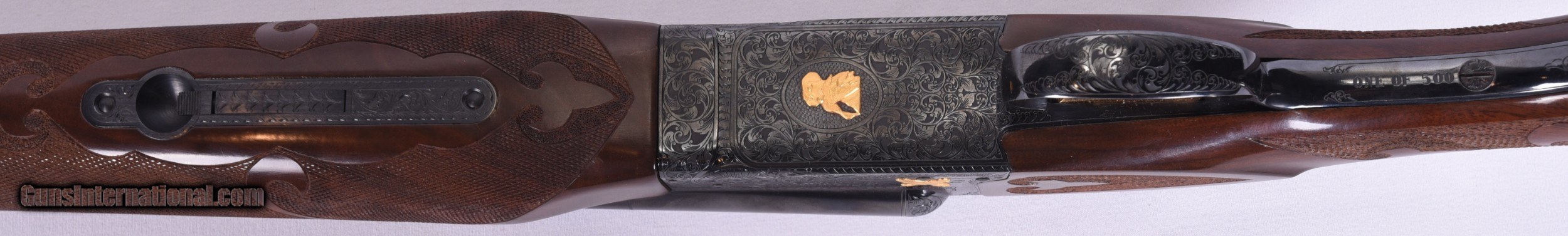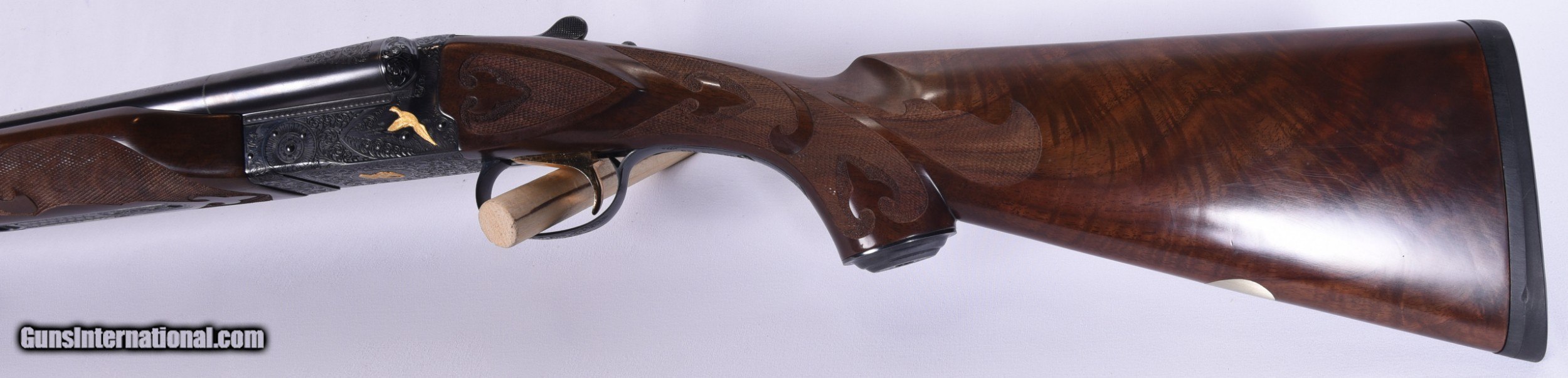 Description: Winchester Model-23 Deluxe 28/20Ga. 2 barrel set. 26" barrel IC/M 20Ga 3" chamber. 26" barrel 28Ga IC/M 2 3/4" chamber. Gold inlays. 14 1/4" LOP over Winchester butt pad. SOLD Engraving: Yes Extras: Gold Inlay Case: Yes Item Location: 35209 |