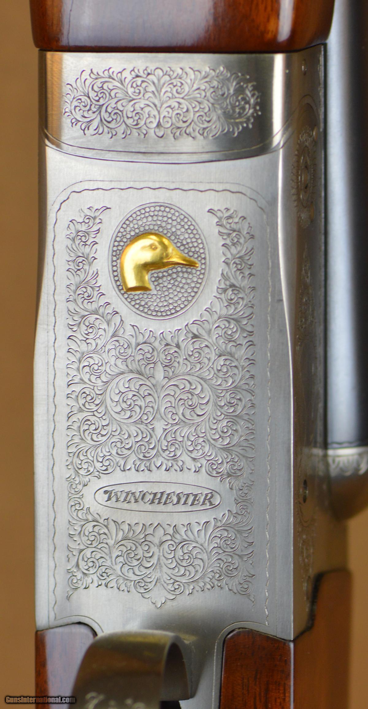 Description: Winchester Model 23 Side-By-Side 12GA with 28" fixed choke (M/F) barrels, factory ventilated rib. Ducks Unlimited limited edition with game scene engraving and gold Duck. Factory Prince of Wales pistol grip stock and full beavertail forearm. Shows very minor storage marks, very minor signs of use. Includes factory presentation case. SOLD |