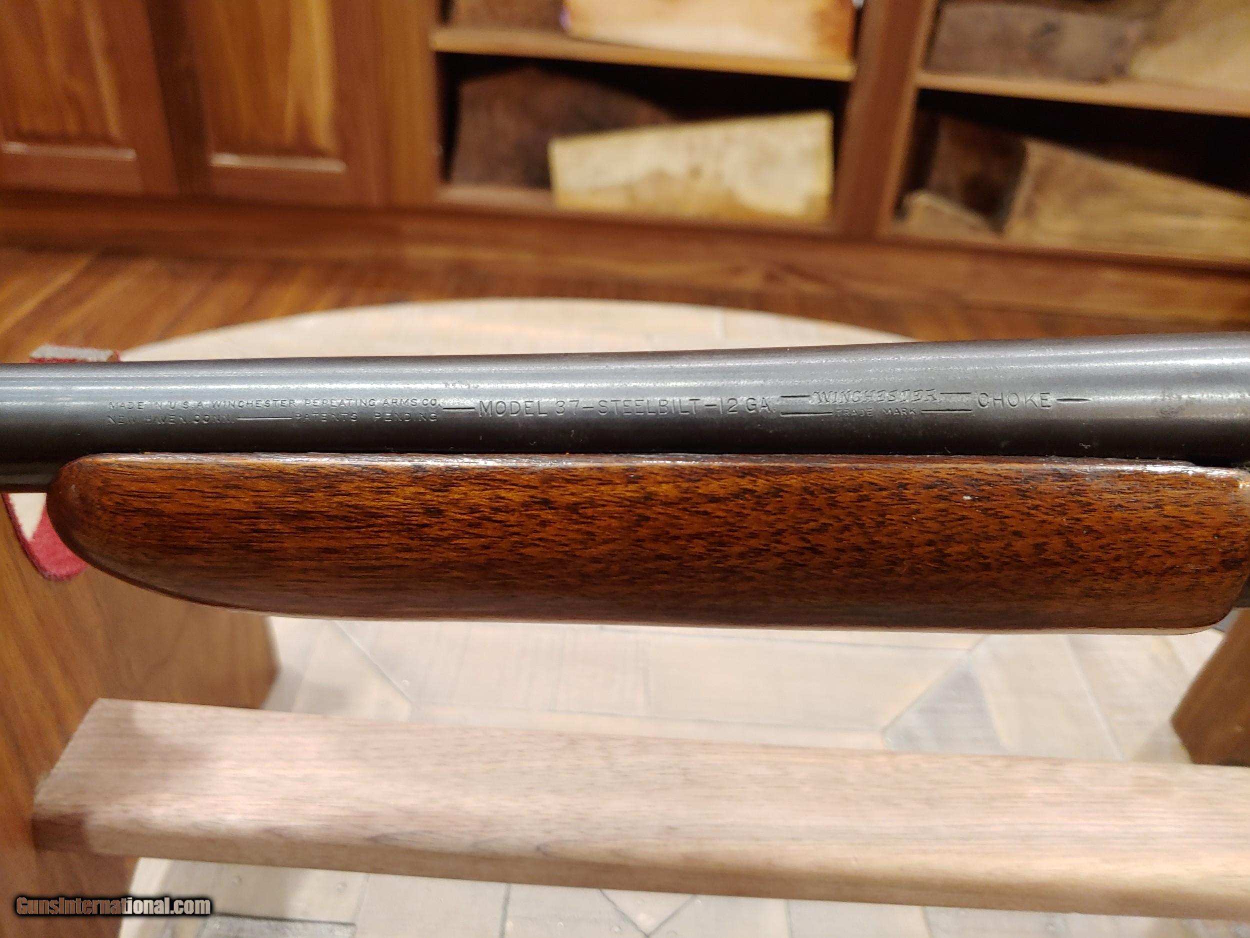 Description: This Winchester M37 is a 30" 12 gauge single-shot shotgun with an overall length of 46" and an LOP of 14". The gun has a wooden stock, beaded sight, and blued barrel. Has some gashes on the stock and scratches on the receiver but is in otherwise good condition.