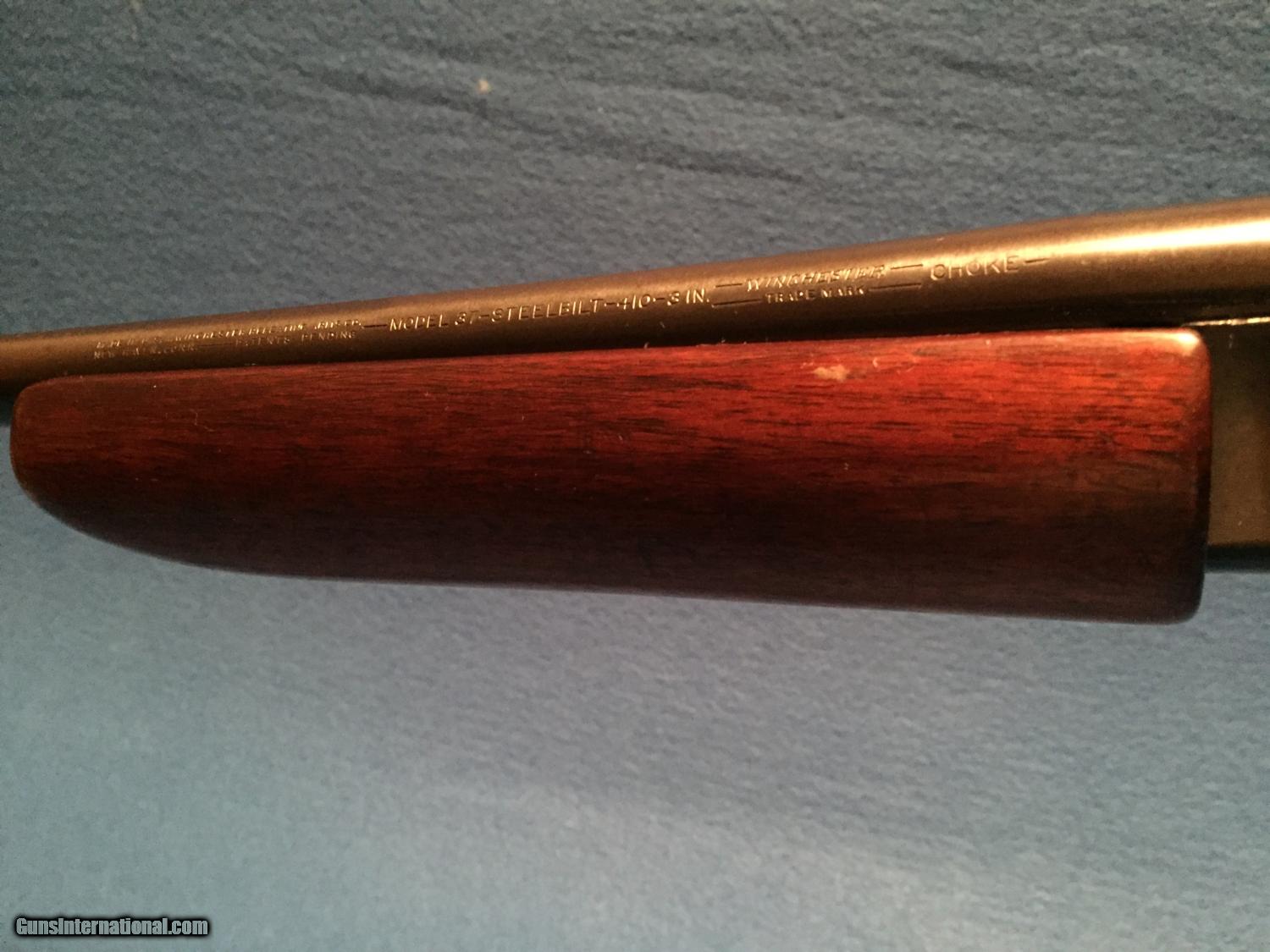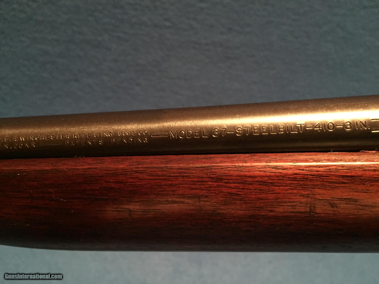 Description: Mod 37 Steel built 410 3 IN full choke. Clean gun with very nice wood with all it's original varnish. The receiver retains 95% with only two or three small light scratches with light wear at the end of the muzzle. Nice clean butt plate. A fine 410 with bright shinny bore SOLD |