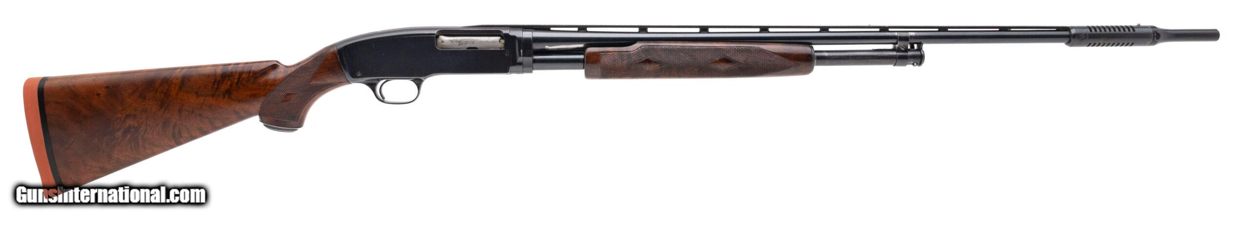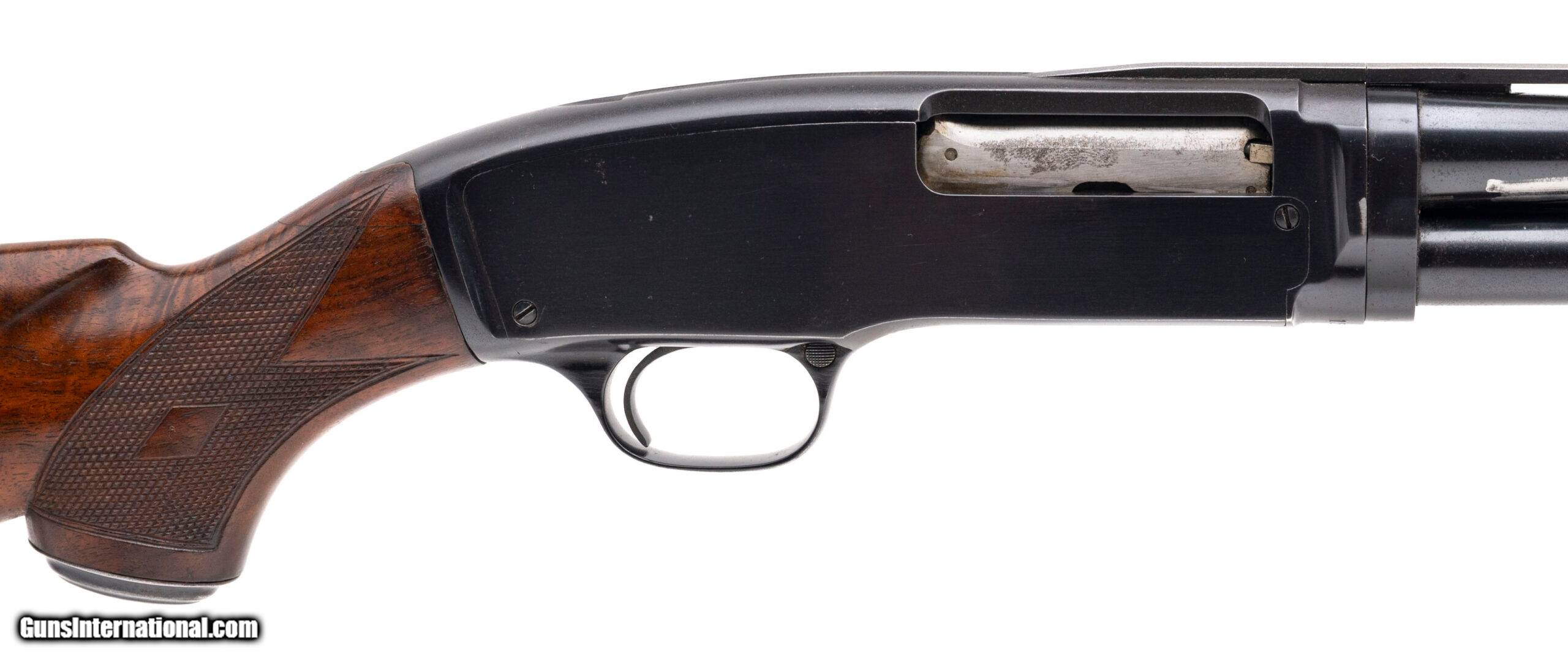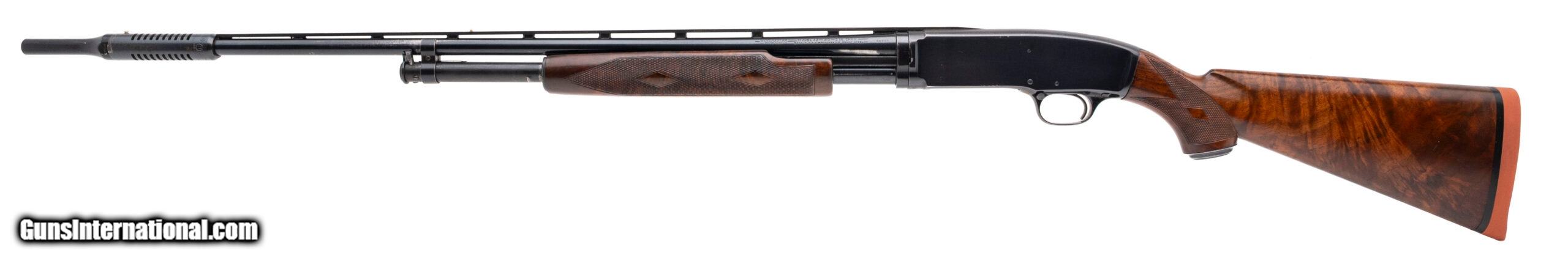 Description: "SN: 155596 made in 1959. Takedown pump action 410 shotgun with a 24" factory vent rib barrel, 3" chamber, fixed Skeet choke marked but later had a Cutts compensator installed bringing the OAL including the compensator to 29 ½". Deluxe grade wood hand checkered with a double diamond forearm, single diamond grip, steel grip cap and 14" to the modern Winchester recoil pad. Some light wear and handling marks and some very faint speckling but overall in very good condition for the age with an excellent bore. Price: $4,500.00 Contact Seller |
