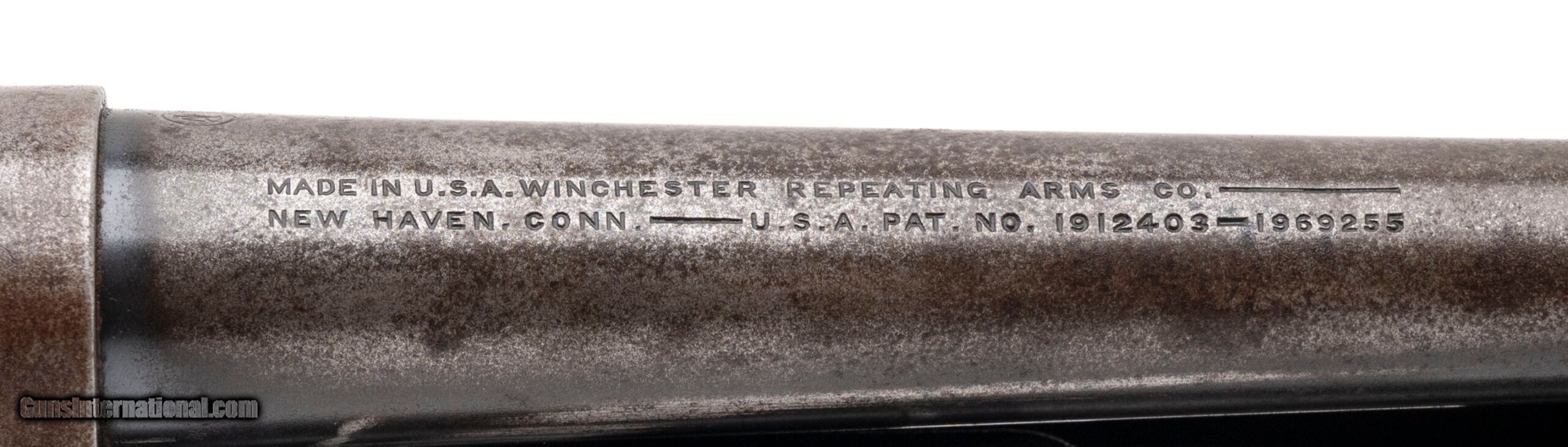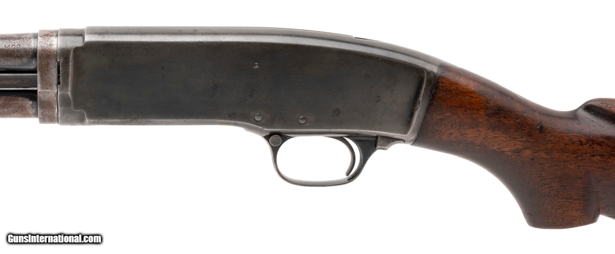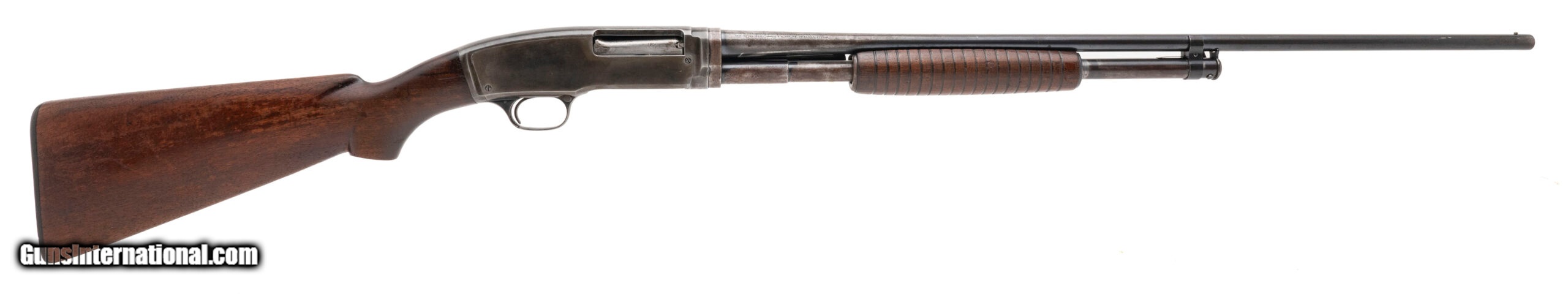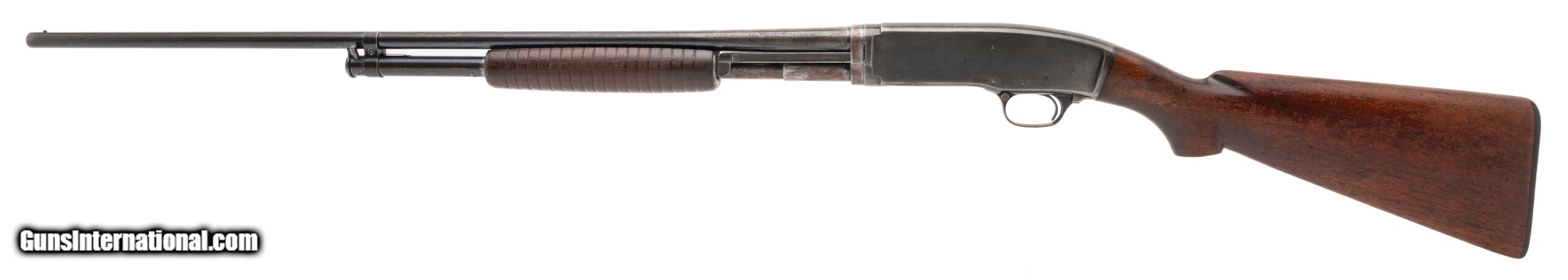 Description: "SN: 36500 made in 1939. 410 bore pump action shotgun with a 28" barrel with single silver bead sight, 3" chambers and fixed modified choke. 14" LOP to the original butt plate. Metal and wood finish are worn with normal wear and handling marks expected on a field gun of this age but the bore is excellent and the stock and forearm are both free of any cracks. Overall weight is 5lbs 14oz. SOLD |