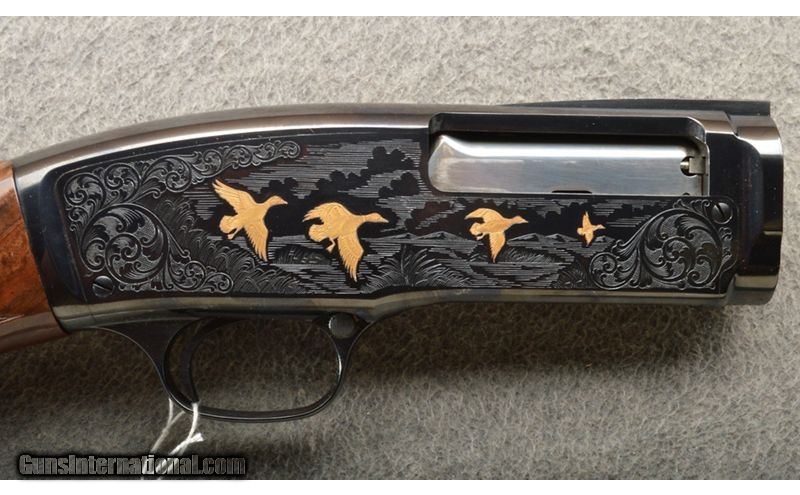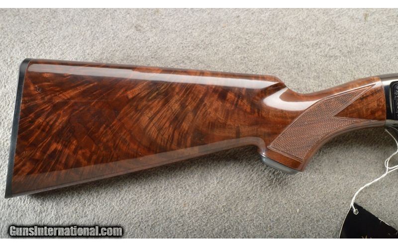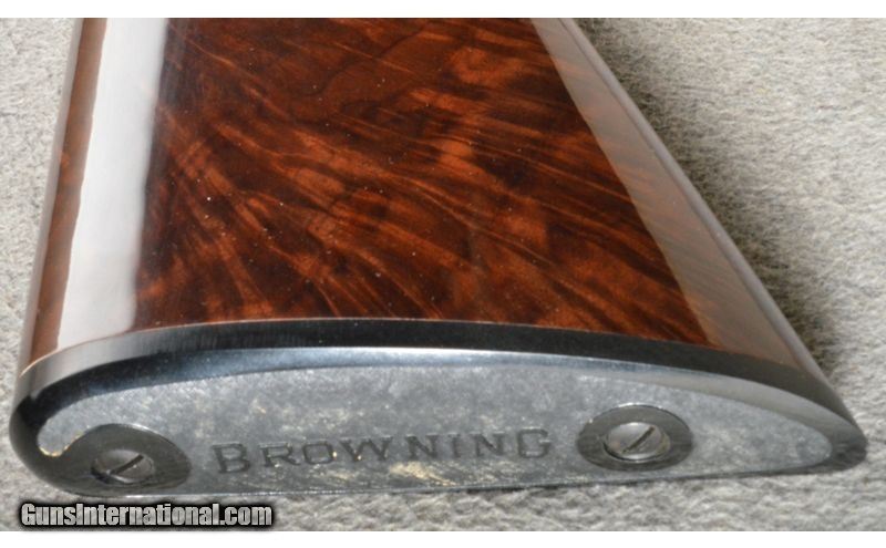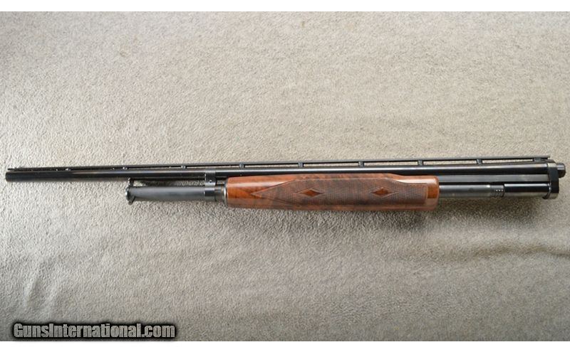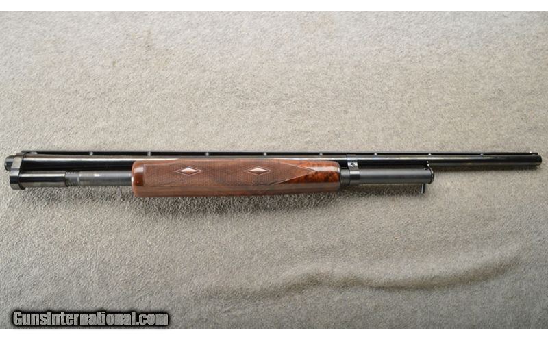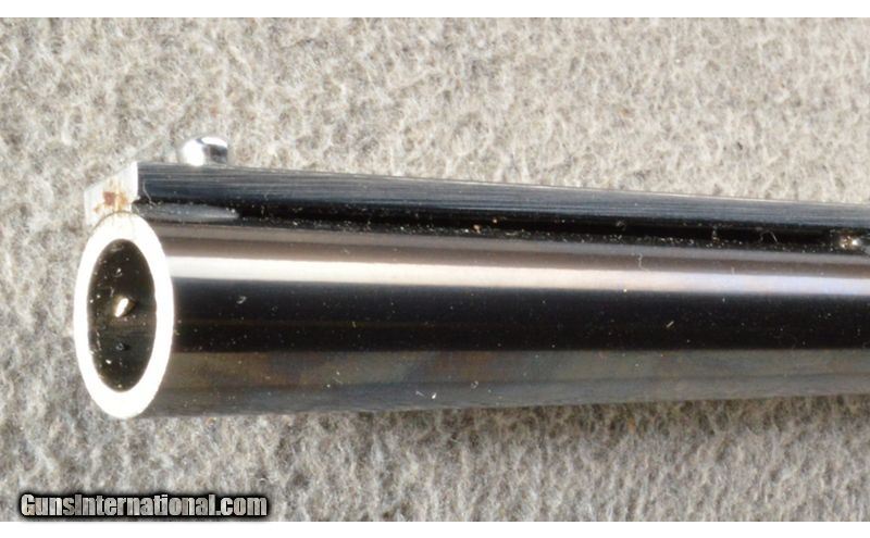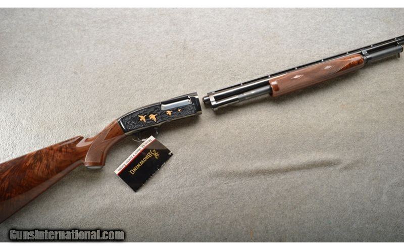 Description: This is an as new in box Browning made Winchester Model 42 grade V shotgun. The blue receiver is engraved and has 4 gold inlaid ducks on the right side and 2 dogs and a Grouse on the left side. The walnut stock and forearm are grade 5 or better with great figure and a gloss finish. This is one of several Winchester-Brownings with the SN#00109xxxxx that are new in the box. .410 Gauge SOLD Chambers: Pump action repeater 4+1. Metal Condition: ANIB. Wood Condition: ANIB. Bore Condition: ANIB. Barrels: 26" gloss blue with a vent rib. Triggers: Single blue. Stock Dimensions: 13 7/8" LOP. Fore End: Grade V walnut with a diamond checkering pattern. Butt Pad: Matching grade V walnut with a checkered pistol grip and a grip cap along with a Browning butt plate. Weight: 6 lbs. 11 0z. Sights: Single silver color front bead on the vent rib. Chokes: Fixed FULL. Item Location: Owatonna, MN |
