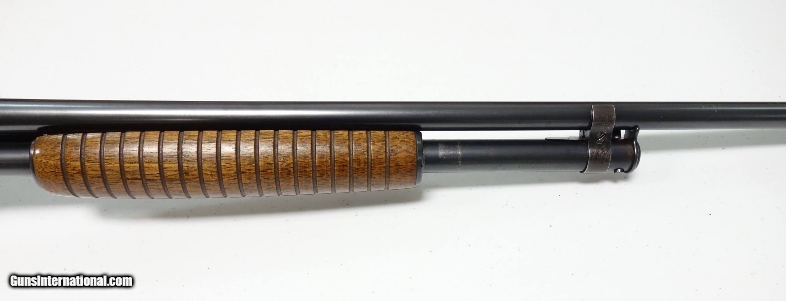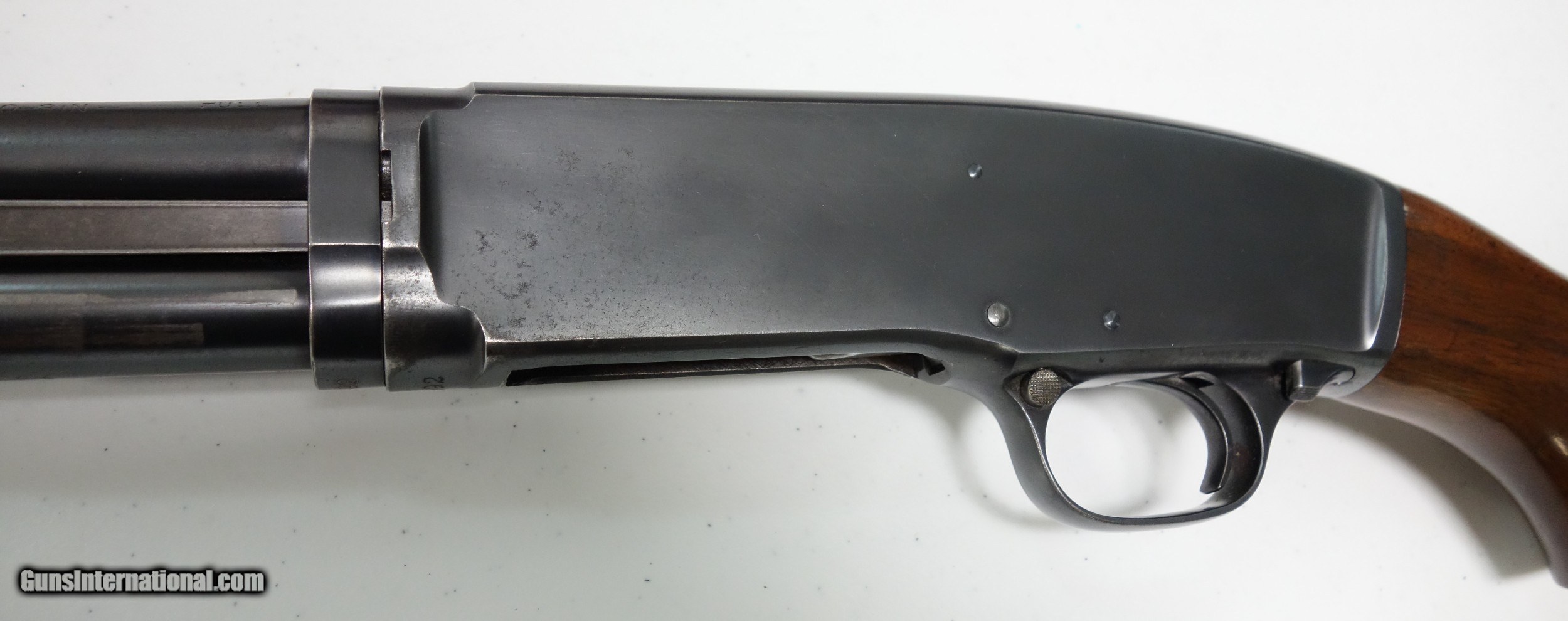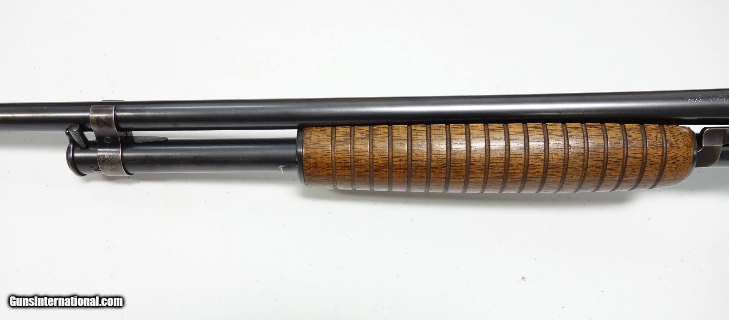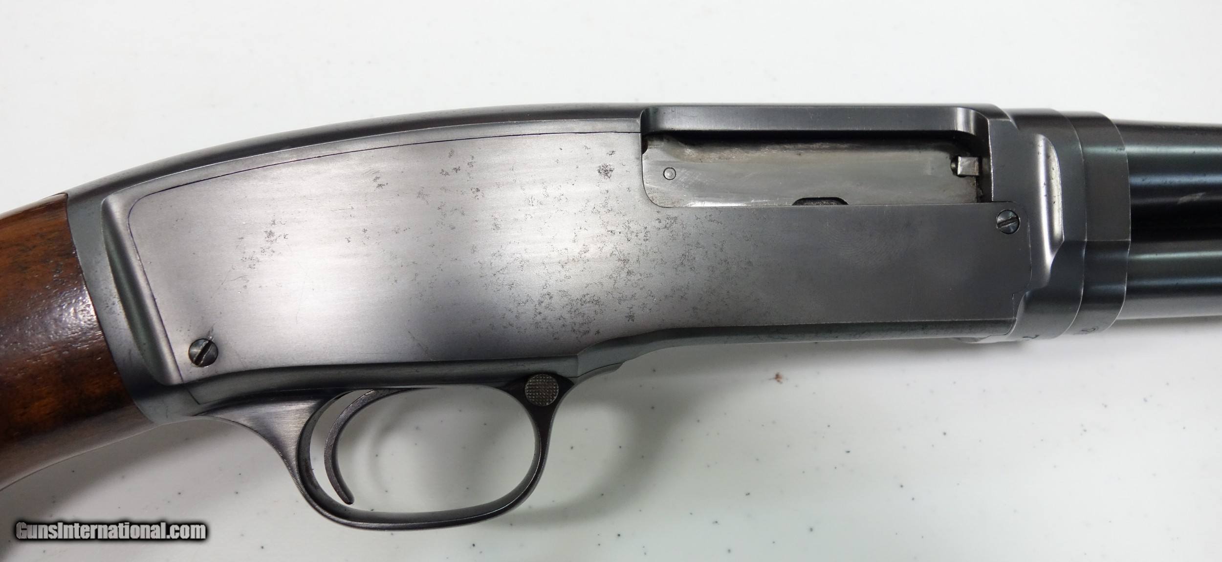 Description: Extra nice and untouched Pre War Model 42 pump-action shotgun. S/N 75** made during the very first year of production 1933! The barrel is 26" with bright shiny bore. Full choke, 3" chamber. Excellent condition overall, especially considering age. 95% Blue and Varnish other than the sides of the receiver which do show some light freckling. I have exaggerated this considerably by tipping into a most unfavorable light. (Is not as apparent in hand, under normal light). The mechanical functions appear to be working perfectly. A true survivor that is more than ready for another 87 years of stellar service to its next lucky owner! SOLD Curio/Relic: Yes |