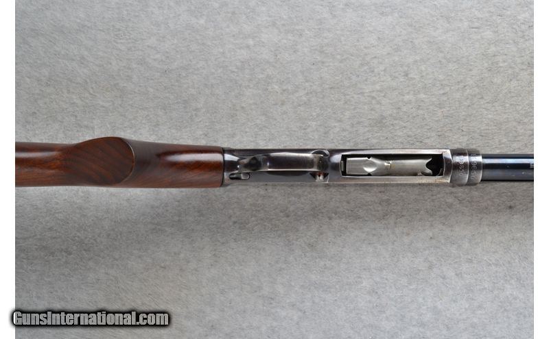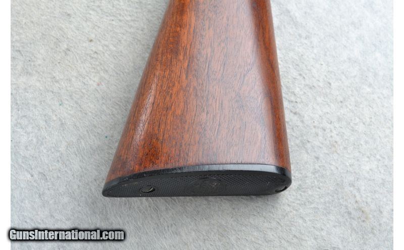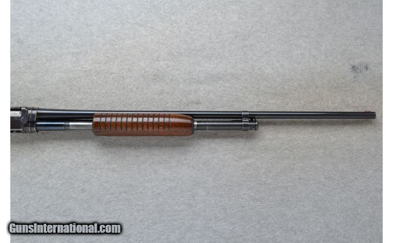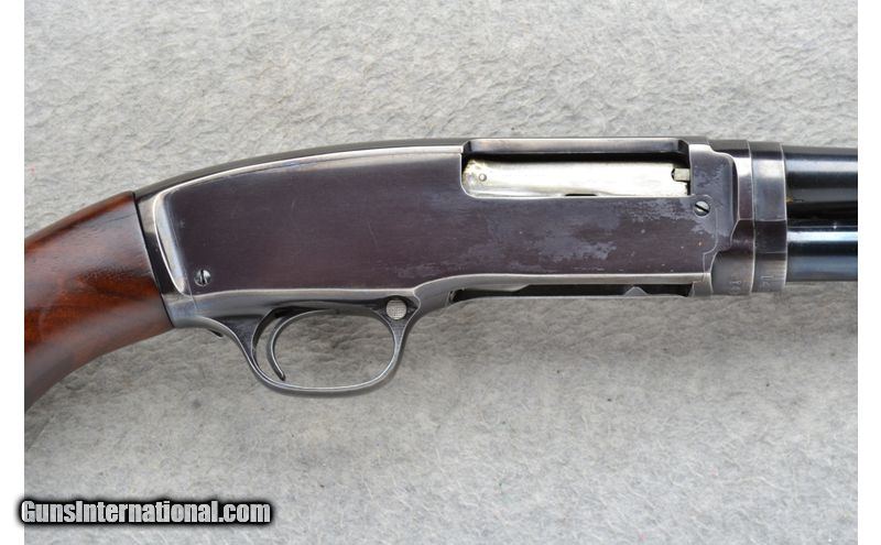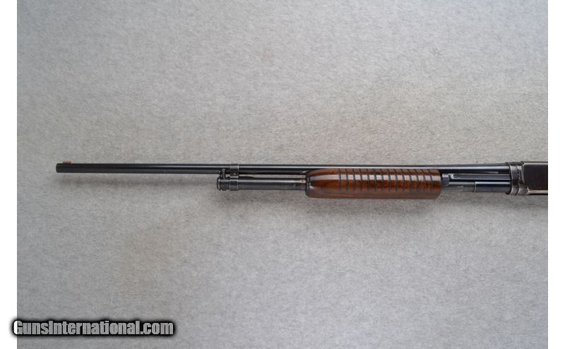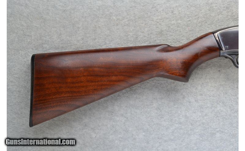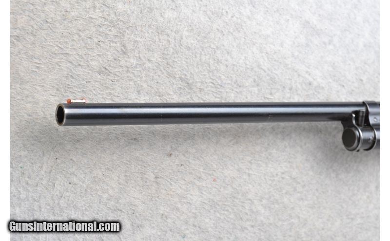 Description: This Winchester Model 42 is a right hand pump action .410 Bore shotgun. It has a 26 inch barrel with a red high visibility front sight. With a 3 inch chamber it has a fixed Full choke. It has a smooth walnut pistol grip butt and a vertical grooved grip fo .410 Gauge SOLD Chambers: 3 inch Pump Action. Metal Condition: "Good. Minor handling marks, light blue wear areas, surface finish marks on the receiver. Wood Condition: Good. Minor handling marks. Small minor crack right side at the receiver. Barrels: 26 inch blued. Stock Dimensions: LOP 13 7/8 inches. Fore End: Vertical grooved grip walnut. Butt Pad: Winchester checkered black plate. Sights: Red high visibility front. Chokes: Fixed Full. Item Location: Richfield, WI |