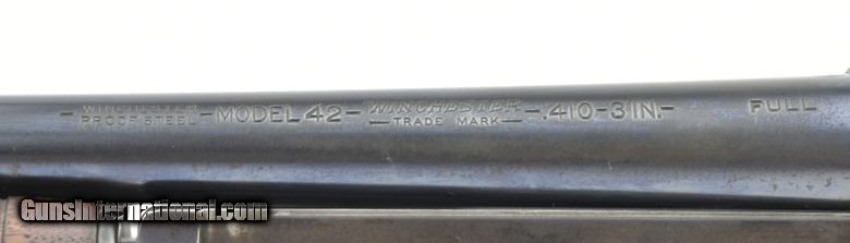 Description: Winchester 42 .410 Gauge shotgun. Field grade pump made in 1934. Has some light pitting on the receiver, overall very good condition 26” full.