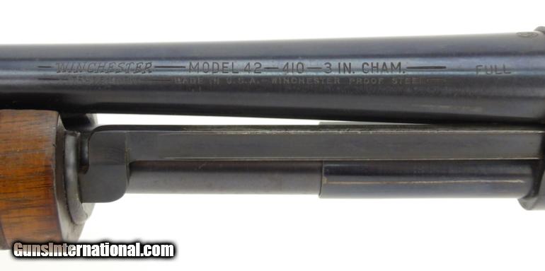 Winchester 42 410 Gauge shotgun. Desirable 410 pump shotgun with 26” full choke barrel. The metal is excellent with just a bit of wear on the receiver. The wood is very good with light handling marks and thin recoil pad. A nice looking gun, ready for the field.