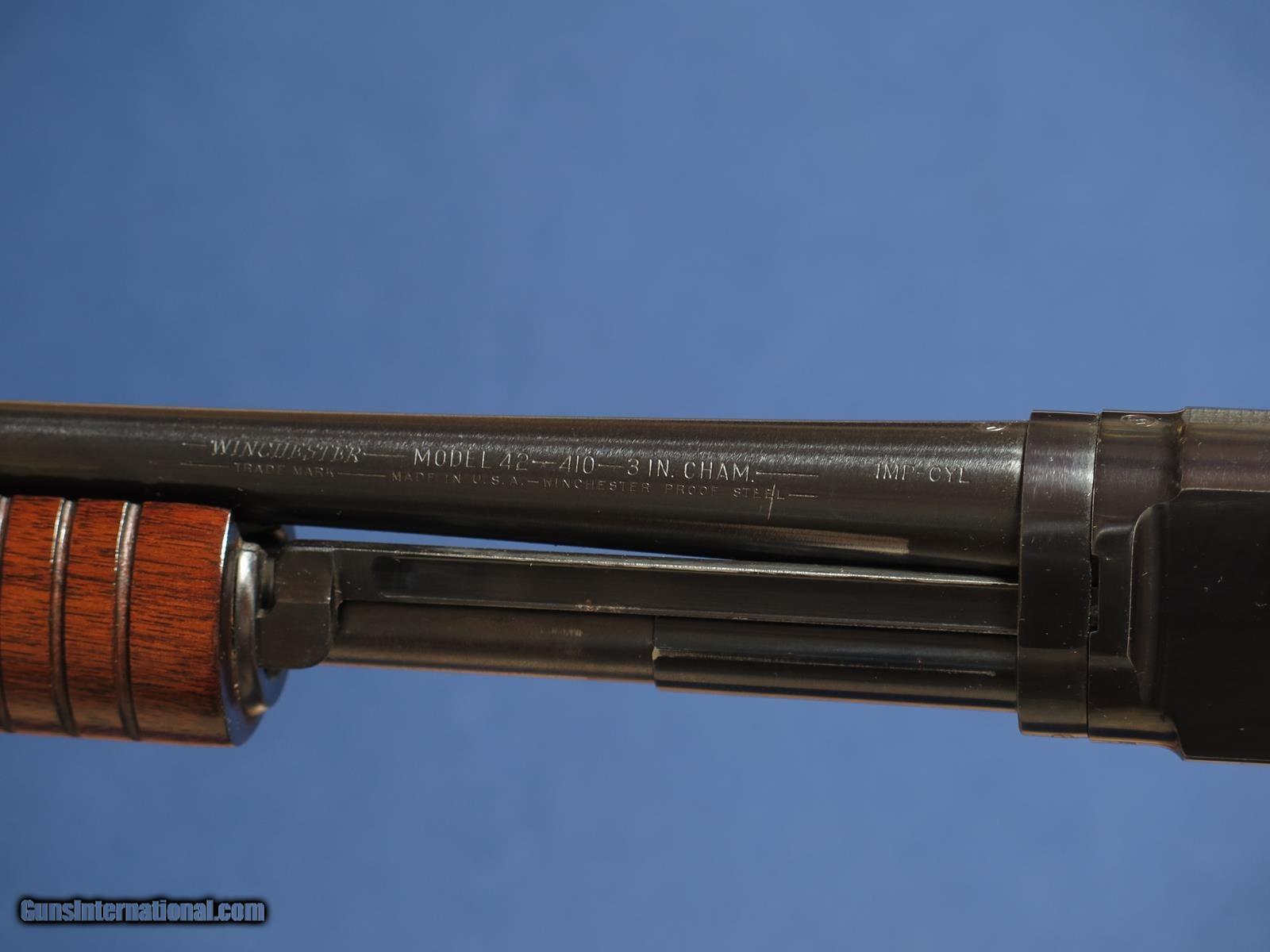 Description: Winchester 42 410. SN 132,3XX. 26 inch barrel. Imp Cyl choke. 14 1/8 LOP butt plate. Original blue finish. Swivel hole in stock has been plugged. Excellent condition showing slight wear. Excellent bore. SOLD Curio/Relic: Yes Shotgun Gauge: .410 Gauge |