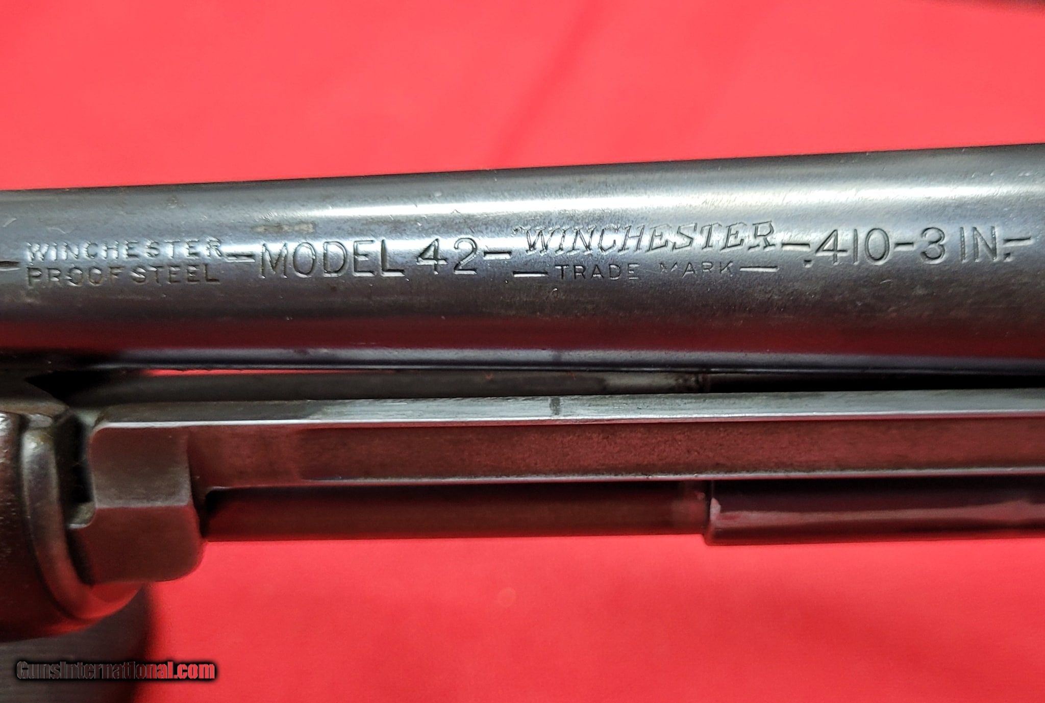Description: Guns Listing ID: 768112 This item is a Winchester Model 42 pump-action shotgun manufactured in 1935. It is chambered in 410GA and is in overall good condition. It has wear consistent with a firearm of this age. Bluing is approximately 80%. SOLD Manufacturer: WINCHESTER Model: 42 Condition: Used - Non-Certified Barrels: 28 BARREL Gauge Info: 410 Finish: WOOD, BLUED STEEL |