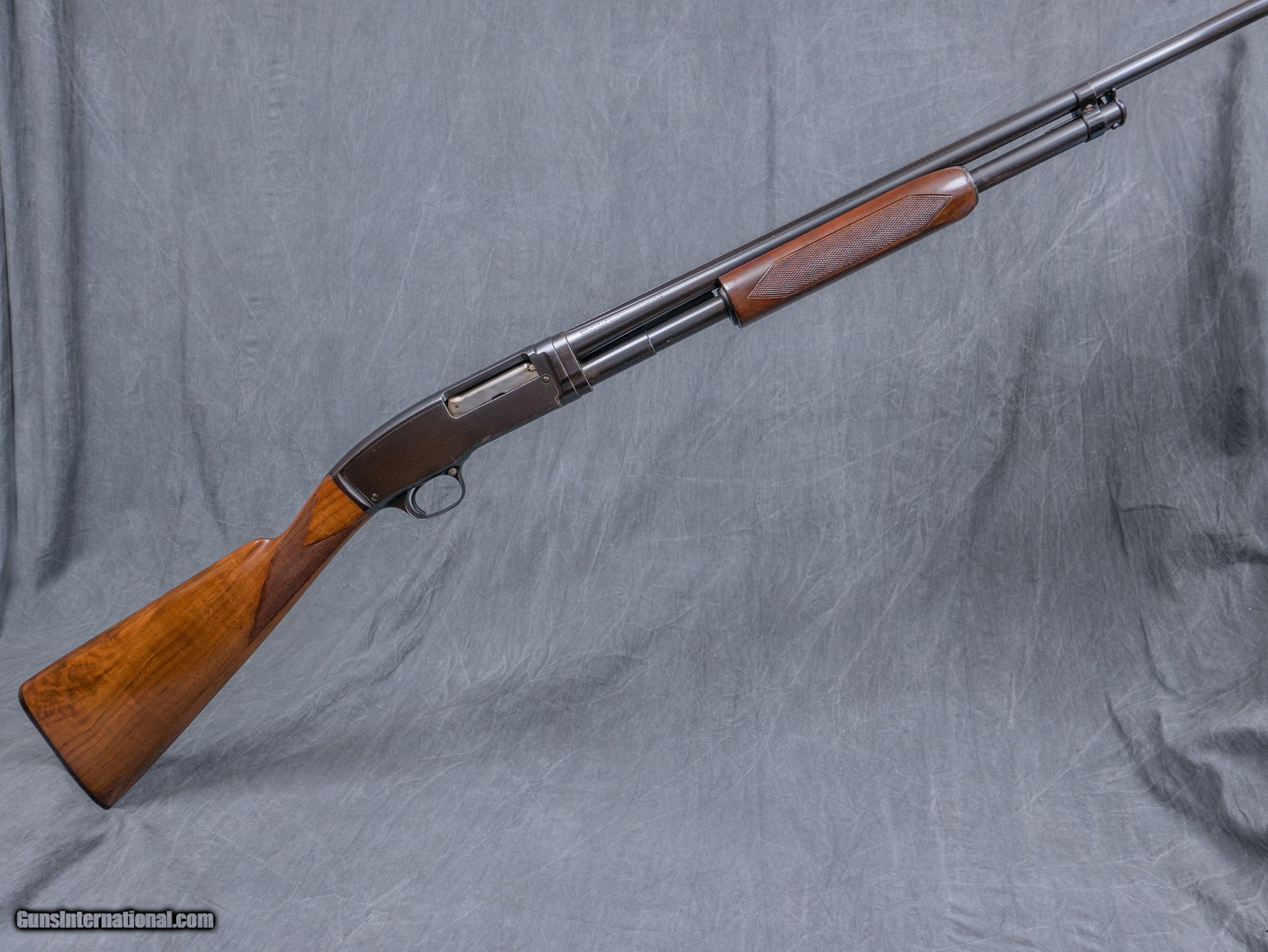 Description: WINCHESTER 42 early Field-style Trap Grade .410 bore pump, 3” ch, 28” bbl. w/ original solid rib, Choke: Full, Checkered straight grip stock w/ original butt plate, Checkered 7" short slide forearm, Stock dimensions: DC: 1 ½” x DH: 2 3/8” x Cast at Heel: 0” x LOP: 13 7/8”, Wt: 6 lb. 2 oz., Condition: Excellent to Mint, Made in USA circa 1934. Very, very few field-style short slide handled Trap Grade Model 42's were manufactured. Serial #18866. (C5626) FIELDSPORT: $9500. (To see & enjoy the entire inventory of fine shotguns, rifles & handguns for sale in the new FIELDSPORT Gun Room, we invite you to visit us at FIELDSPORTLTD) SOLD Curio/Relic: Yes |