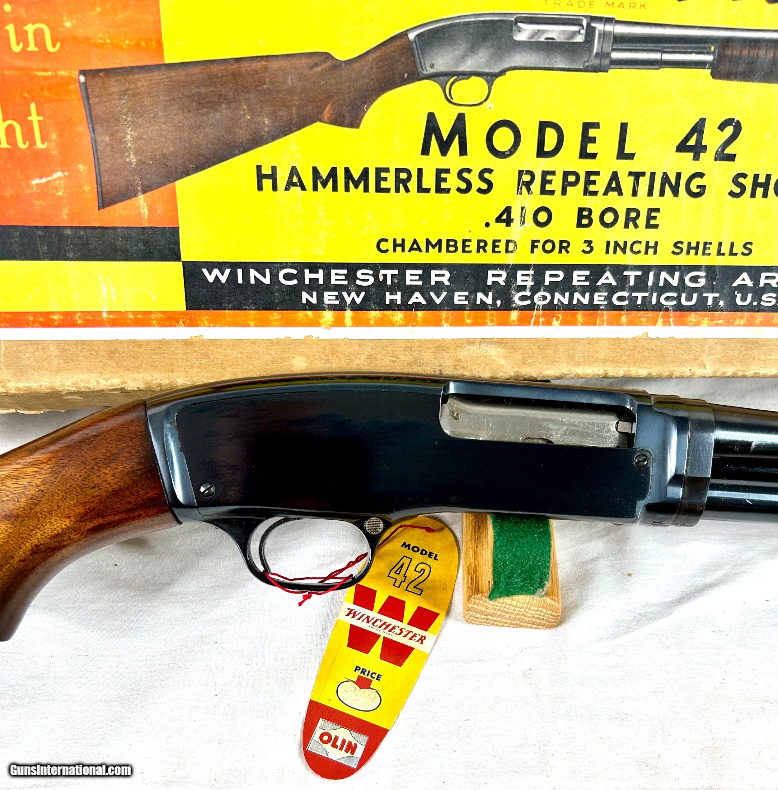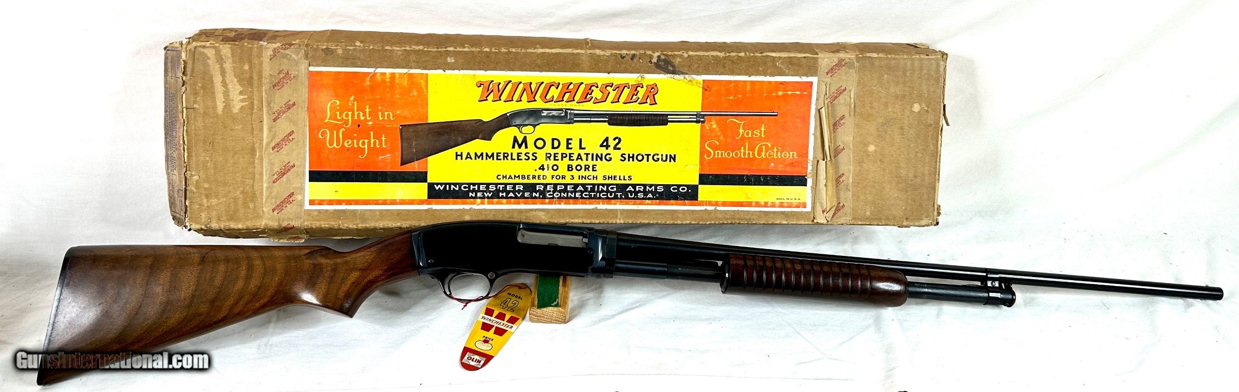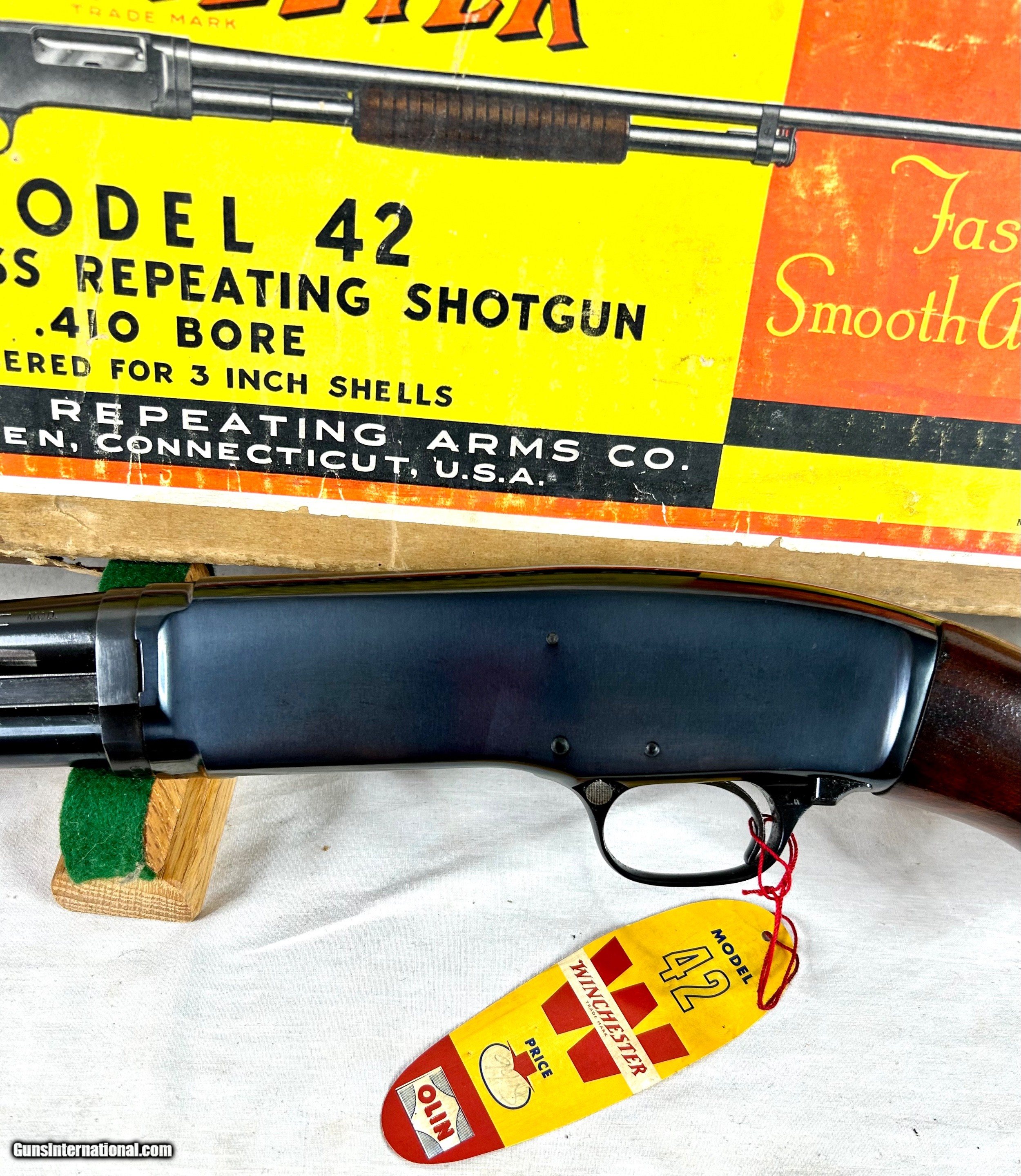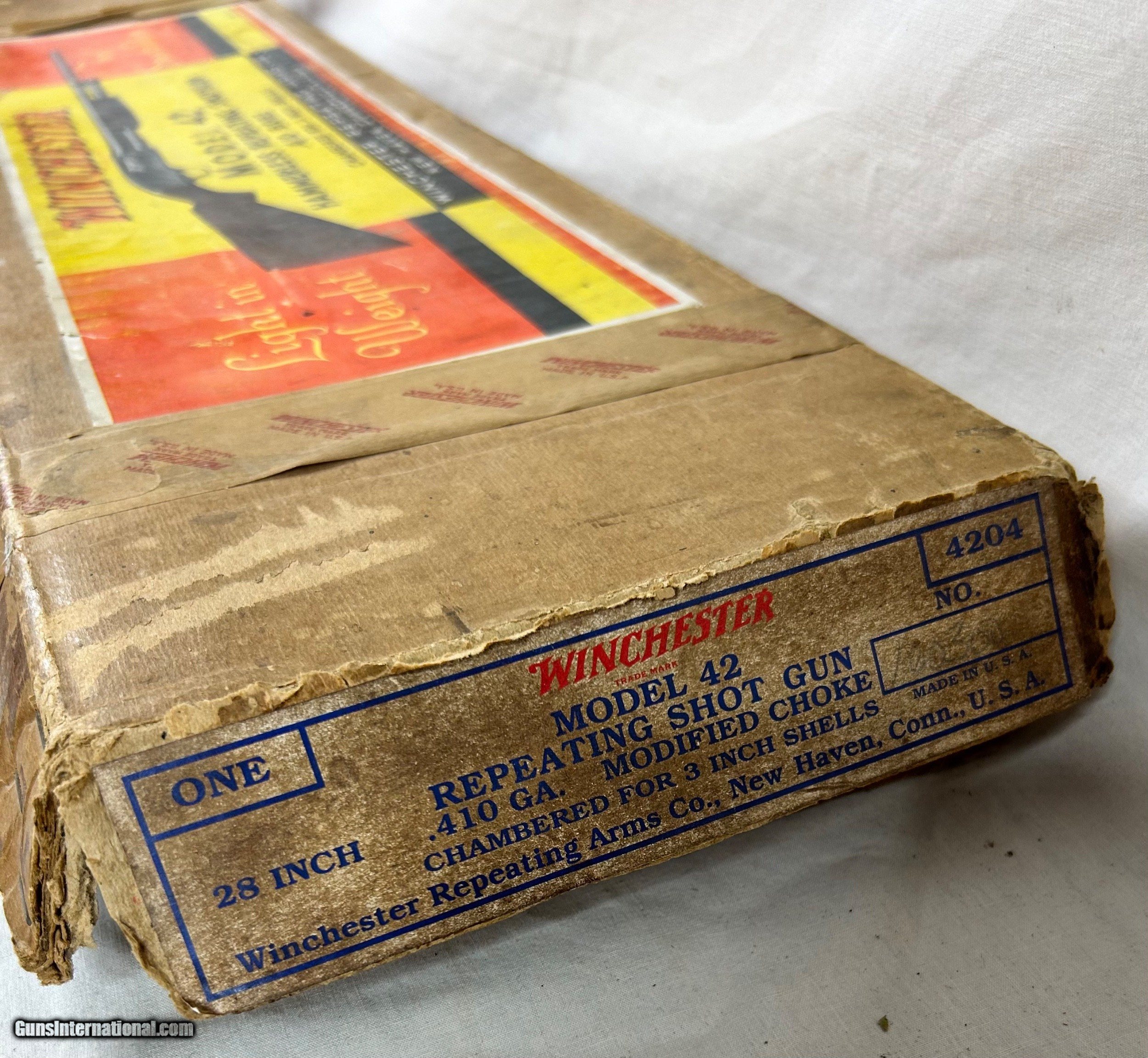 Description: *****ON HOLD****Up for sale I have a Winchester model 42 chambered in 410. This is a really rare little gun to find in its original box. This little gun has a 28" barrel with a modified choke. I would rate the condition of this little shotgun at 99.9% bc it has a couple tiny, tiny handling marks on the stock that I photographed. These Winchester boxes with the big pretty labels are very hard to find in this condition and are highly sought after. Shipping will be $75 and to FFL only. Please don't hesitate to ask any questions or request more photos. SOLD |