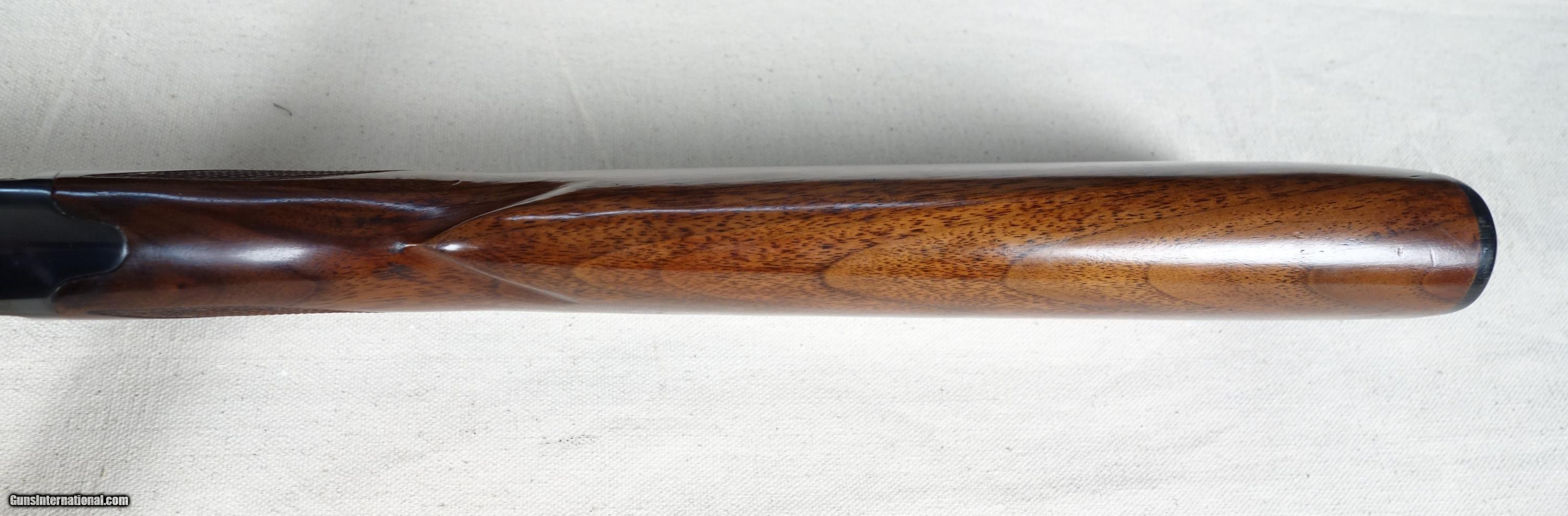 Description: Gorgeous Winchester 42 Skeet .410 pump action shotgun with the rare and highly coveted Solid Matted Rib. 26" Barrel. 3" Chamber. Skeet choke. S/N 82*** Mfg. 1950. 98% Blue with virtually no wear other than a couple slide rubs and a very light abrasion on left receiver wall only noticeable if tipped into the light. The wood is equally fine with 98% finish showing only scattered light handling marks. Mechanics and bore are like new. This is a highly collectible shotgun in a very difficult to find configuration. I estimate that 90% or more of all the higher grade 42s out there have been altered, customized, or are outright fakes. This is the most genuine and honest example of a factory solid rib skeet grade that I am aware of, and in the finest condition that I have personally handled. 100% original!! SOLD Curio/Relic: Yes |