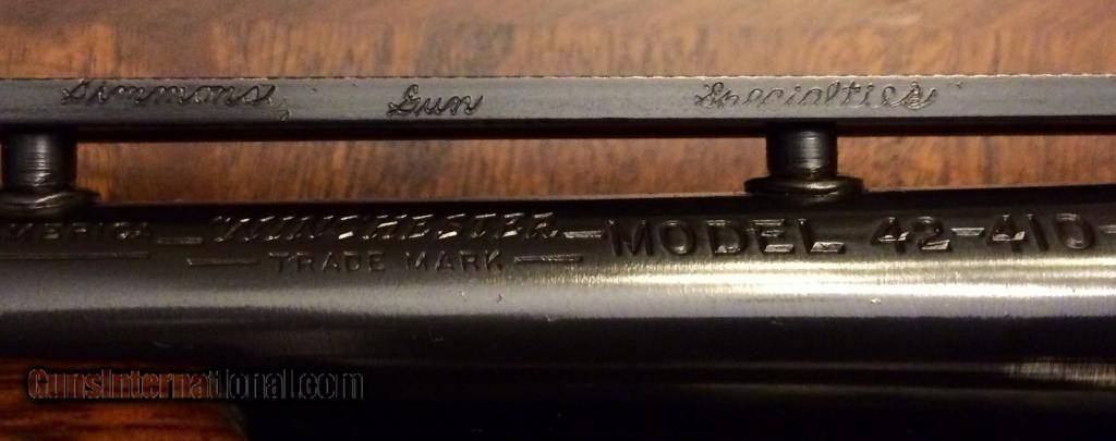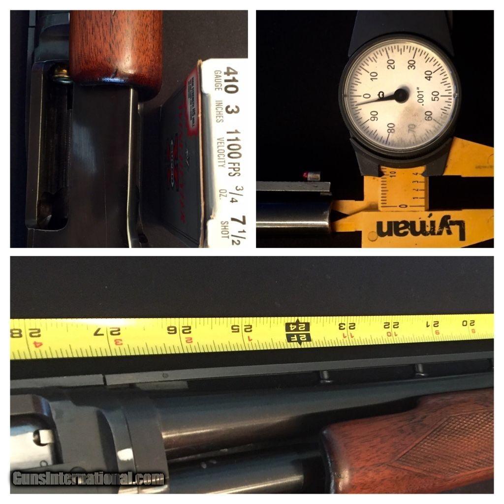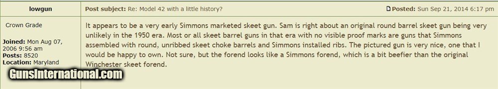 Description: 1951 Winchester Model 42 Skeet 410ga in excellent condition with RARE, unmolested 2 1/2" chamber, 28" vent rib barrel, Skeet choke, LOP 14", 13 5/16” to beginning of a stock extension. Butt-plate fits nicely over extension, indicating stock may have been cut for recoil pad then brought back to original plate and length. Custom grip cap reads "J. T. Turner - Houston Skeet Shooter's Association - 1948". J. T. Turner was once the President of the Texas Skeet Shooter's Association. Model 42 experts on shotgunworld believe this is most likely an early Simmons marketed gun, rather than a plain 2 1/2" barrel skeet gun that came out of the Winchester factory and was later sent to Simmons for vent rib installation . Vent rib reads "Simmons Gun Specialties". Serial number 87364. Take down adjustment sleeve in “1” position, showing little takedown use. A 3” shell will not fit in the chamber (see picture). End of barrel (choke section) ID measures approximately .0398” using caliper. Must ship to FFL dealer in your state. Please ensure your FFL Dealer accepts shipments from individuals, otherwise, Buyer will have to pay extra to have the item shipped by my FFL. Personal checks accepted, however, gun will not ship until check clears. Buyer pays actual shipping and insurance. Shotgunworld links discussing this gun: ….September 2014 - ://shotgunworld/bbs/viewtopic.php?f=60&t=406998 ….July 2017 - ://shotgunworld/bbs/viewtopic.php?f=60&t=457595 Add "h t t p s" prefix to above links. SOLD Shotgun Gauge: .410 Gauge |