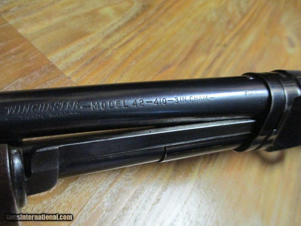 Description: Winchester, Mdl 42, .410, full choke, 3", 96% overall condition, 28" barrel, 14 3/4" length of pull, original finish, original bluing. For further information call John at 941-748-7318. SOLD |