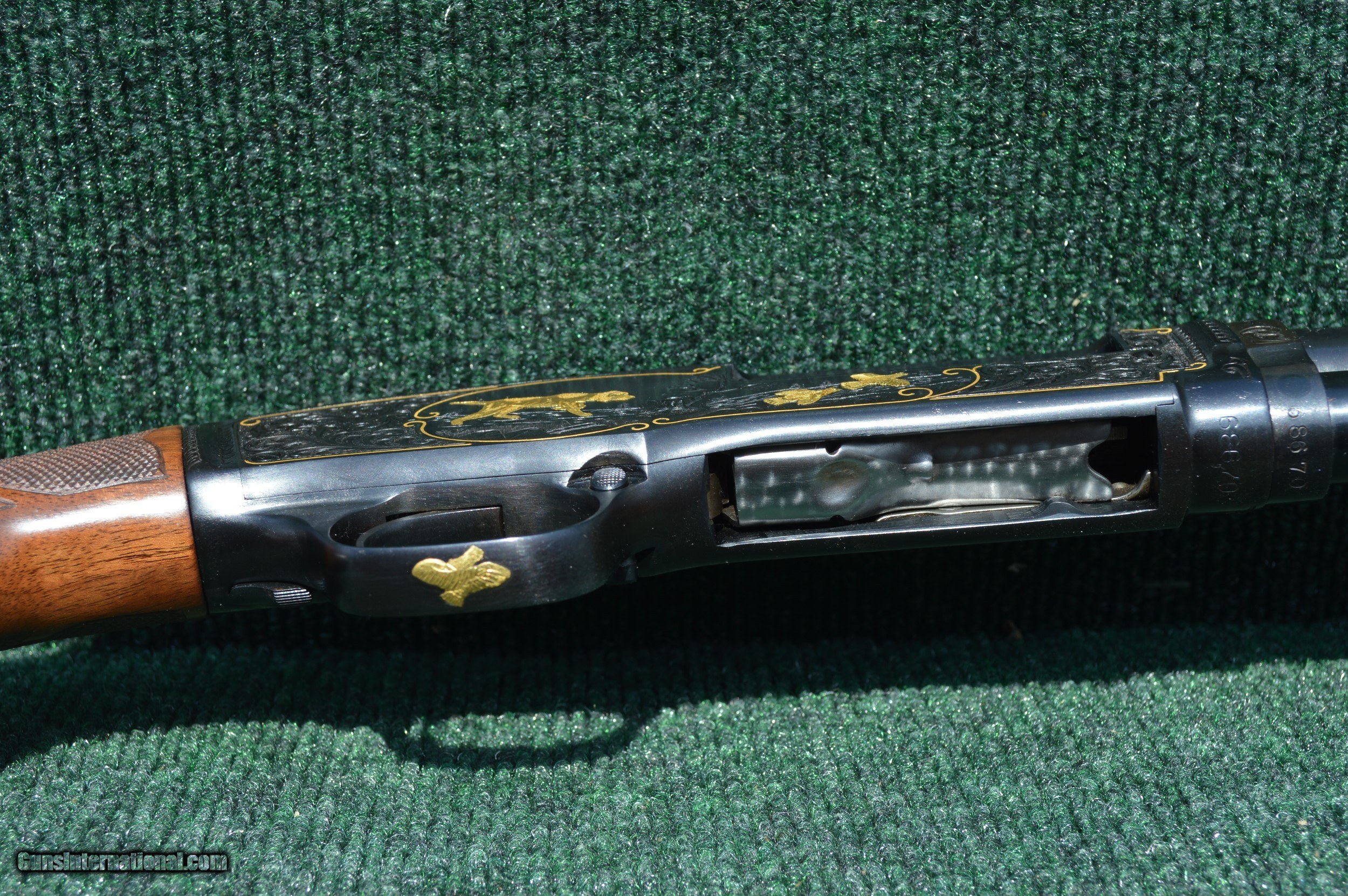 Description: Completely upgraded Win Mod 42 , 410 bore shotgun in exc. cond. Gold inlaid engraving in a takeoff of the classic Grade V pattern. Top of receiver is scroll engraved with gold inlaid quail on tang and trigger guard. Solid rib 26" bbl is Skeet choked. Exhibition Amer. Walnut stock is checkered in the 'A' carved Win. pattern. Dimensions 1 1/2" DAC, 2 1/4" DAH, LOP 14". Win logo on buttplate and grip cap. Ships in blk plastic case to your FFL dealer in lower 47 for $60. No Ca. or Intl sales. No trades or offers considered. SOLD |