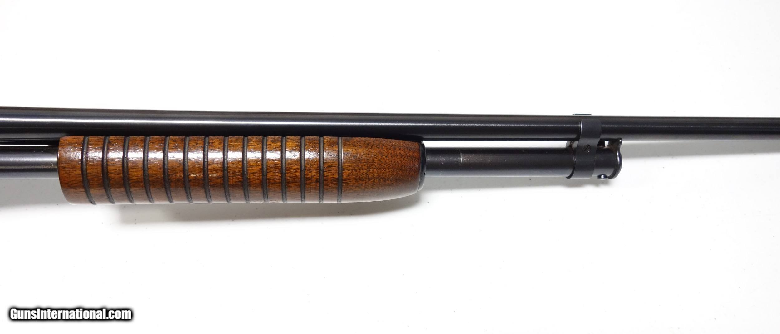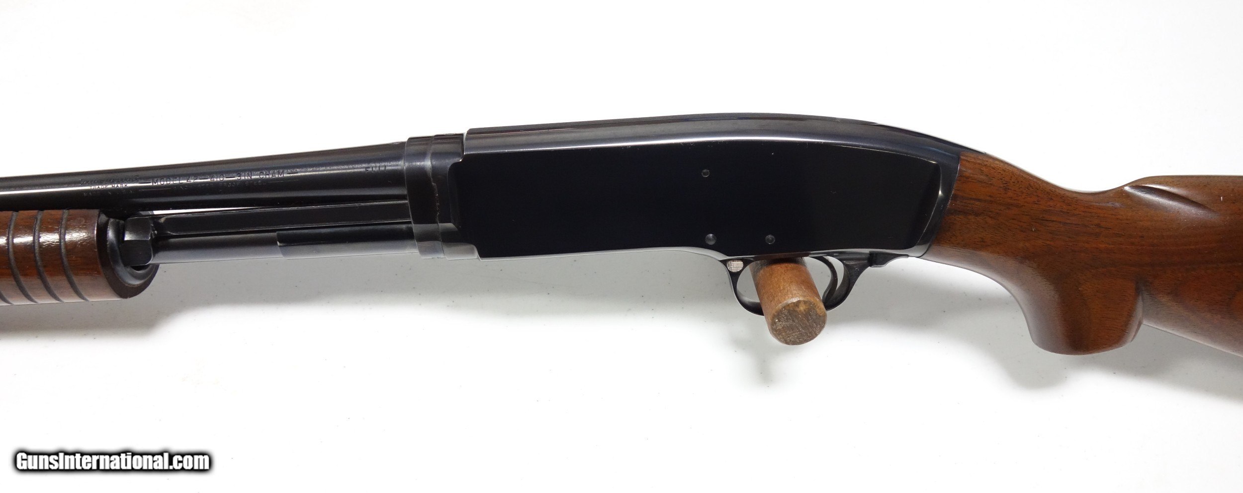 Description: Beautiful Winchester Model 42 .410 gauge pump action shotgun. S/N 106*** made in 1953. 98% original Blue and Varnish. 26" Barrel. Full Choke. 3" chamber. 14" LOP to original buttplate. Bore and mechanics are superb. Remarkable quality throughout. Justifiably, the Winchester 42 remains one of the most universally loved shotguns the world has ever known! SOLD Curio/Relic: Yes |