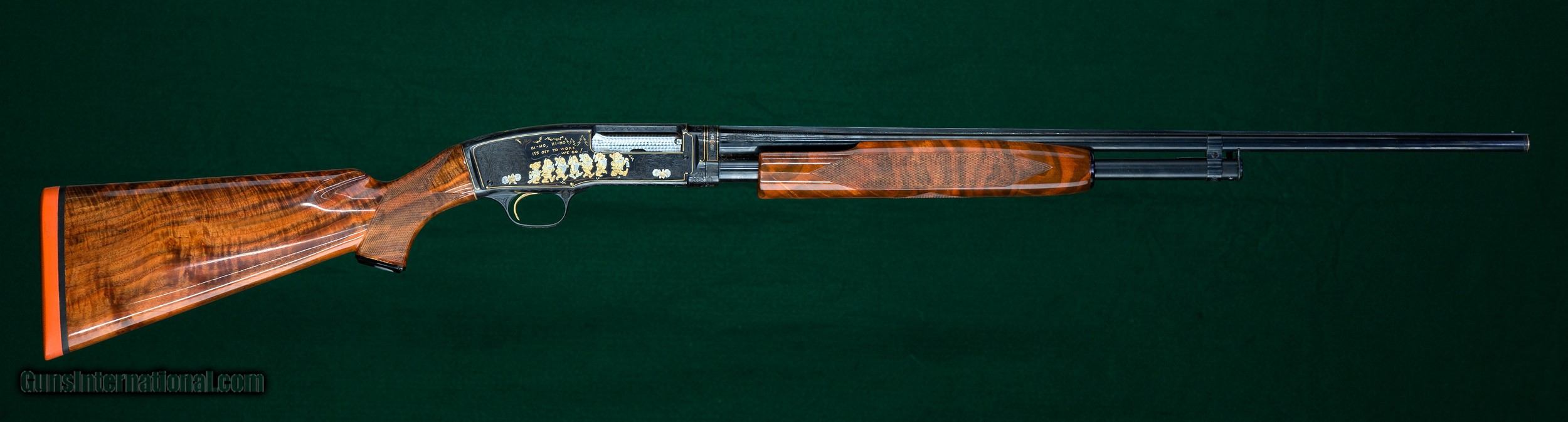 Description: 26" matted solid-rib barrel choked full. 14 5/8" pull from gold-plated trigger. Winchester deluxe stock of highly figured walnut, beavertail forend, classic point-pattern checkering, capped pistol grip with vacant silver initial oval, classic comb, and solid red Pachmayr Old English recoil pad. Extensively engraved and inlaid with multiple colors of gold and silver by Gino Cargnel: a scene of Snow White dancing with the seven dwarves on left, the seven dwarves on their way to work on right, all surrounded with foliate scroll, inlaid rose bouquets and gold borderline work. Maker's name and serial numbers inlaid in gold. Originally built 1935. New condition. In Huey oak & leather trunk case. SOLD Shotgun Gauge: .410 Gauge Manufacturer: Winchester Model: 42 Custom Serial Number: 15792 Barrel Length: 26 Chambers: 3 inch Condition: Excellent Stock: with capped pistol grip Fore End: Beavertail LOP: 14 5/8 Rib: Matted solid rib Manufacture Date: Originally, 1935. Chokes: Full Engraving: Snow White and Seven Dwarves by Gino Cargnal Case: Huey oak & leather trunk case Item Location: Livingston, Montana |