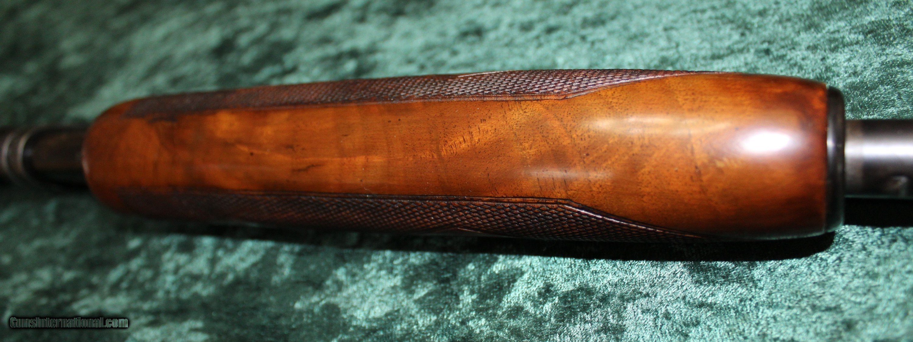 Description: Digging deep into the gun safe, I have for sale today my Winchester Model 42 Double Diamond Deluxe Shotgun. This fine shotgun was manufactured in 1958 per the 'Winchester Dates of Manufacture 1849-2000 ' first edition. I hope you take this opportunity to enjoy this beautiful shotgun as much as I have! It is a rare and hard to find double diamond deluxe grade. The proof stamp on the barrel is offset to accomodate the desirable, factory installed, solid barrel rib with a single bead sight. The blue finish is excellent retaining 95%+ of its original finish with a jeweled bolt and carrier. It has matching serial numbers on the receiver collar and receiver as shown in the pictures. Choked "FULL" stamped on the barrel at the breech, Winchester factory oval proof on the barrel and on the top of the breech as well as 3 INCH CHAM stamped on the barrel. Light cycling wear is visible on the magazine tube as well as on the sharp edges of the frame. The wood is very fine figured walnut with the forearm displaying the deluxe double diamond pattern on both sides surrounded by 20 LPI strong checkering. The stock has a single diamond on each side of the pistol grip stock surrounded again by 20 LPI checkering and the 'Winchester' grip cap on the bottom along with the 'Winchester Repeating Arms' butt plate. Both the forearm and stock have very crisp checkering and strong varnish to this day. There is one blenish on the left side of the butt that is show in the pictures. This is a mechanically excellent shotgun and a must have for any Winchester Model 42 collectors. I will ship to a licenesed FFL dealer only and must have a hard copy of FFL with payment. Shipping for this fine shotgun will be $85 and it will be packed with care and insured! Thank you for looking at me listing! SOLD Shotgun Gauge: .410 Gauge Manufacturer: Winchester Model: 42 Serial Number: 132503 Barrel Length: 28 Chambers: 3 inch Condition: Very Very Good Metal Condition: 95%+ Wood Condition: Excellent Bore Condition: Bright Action: Pump LOP: 14 3/8 Chokes: Full |