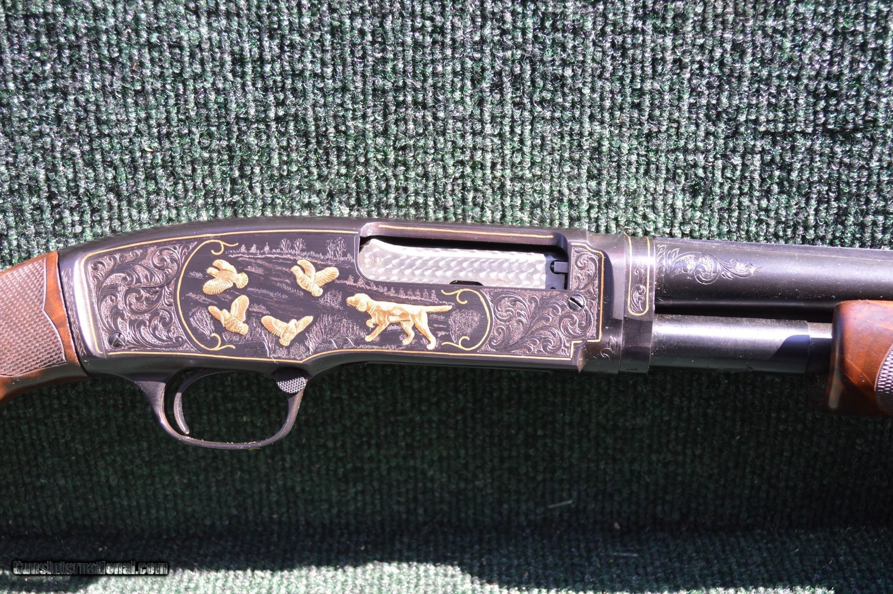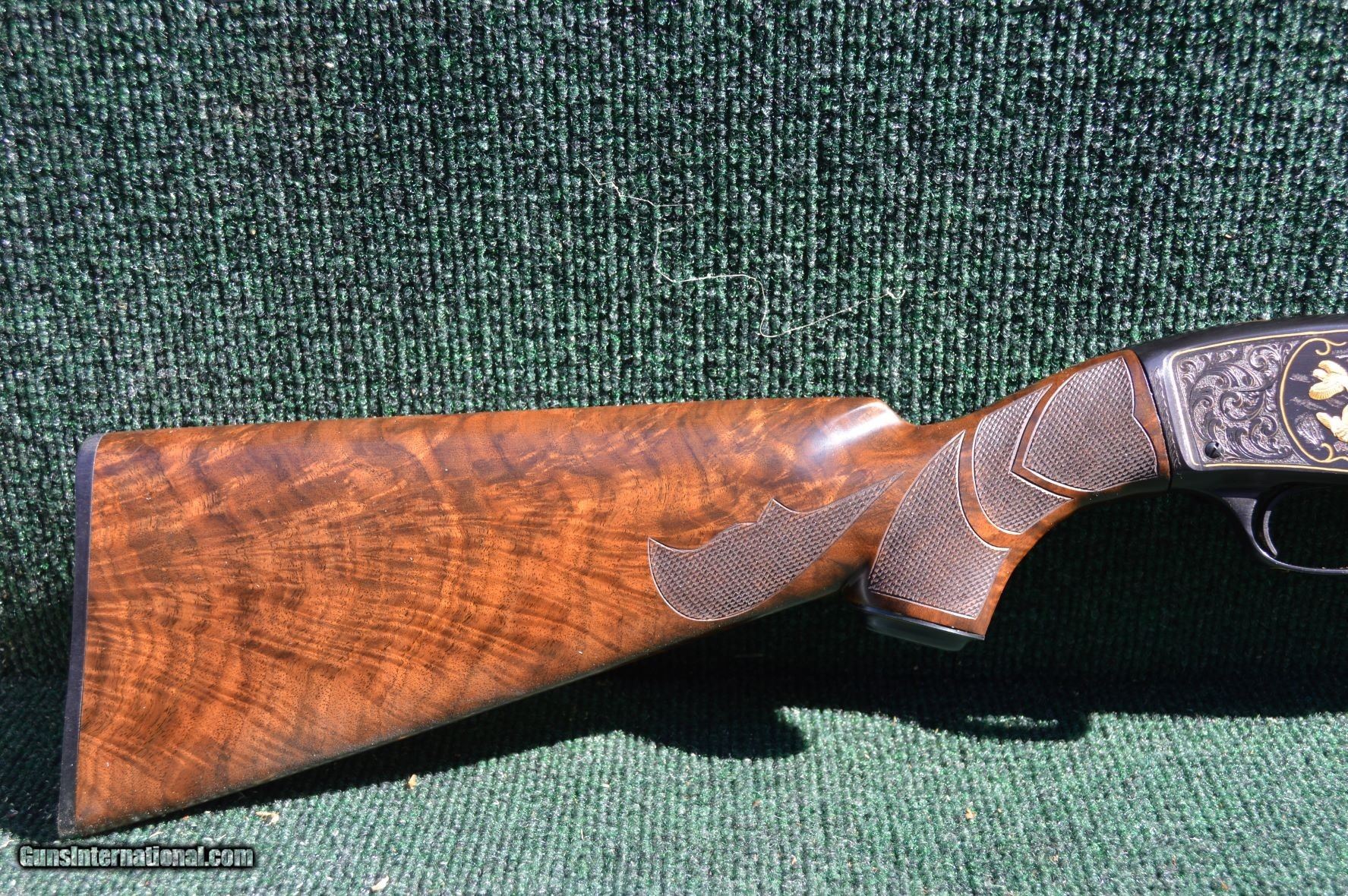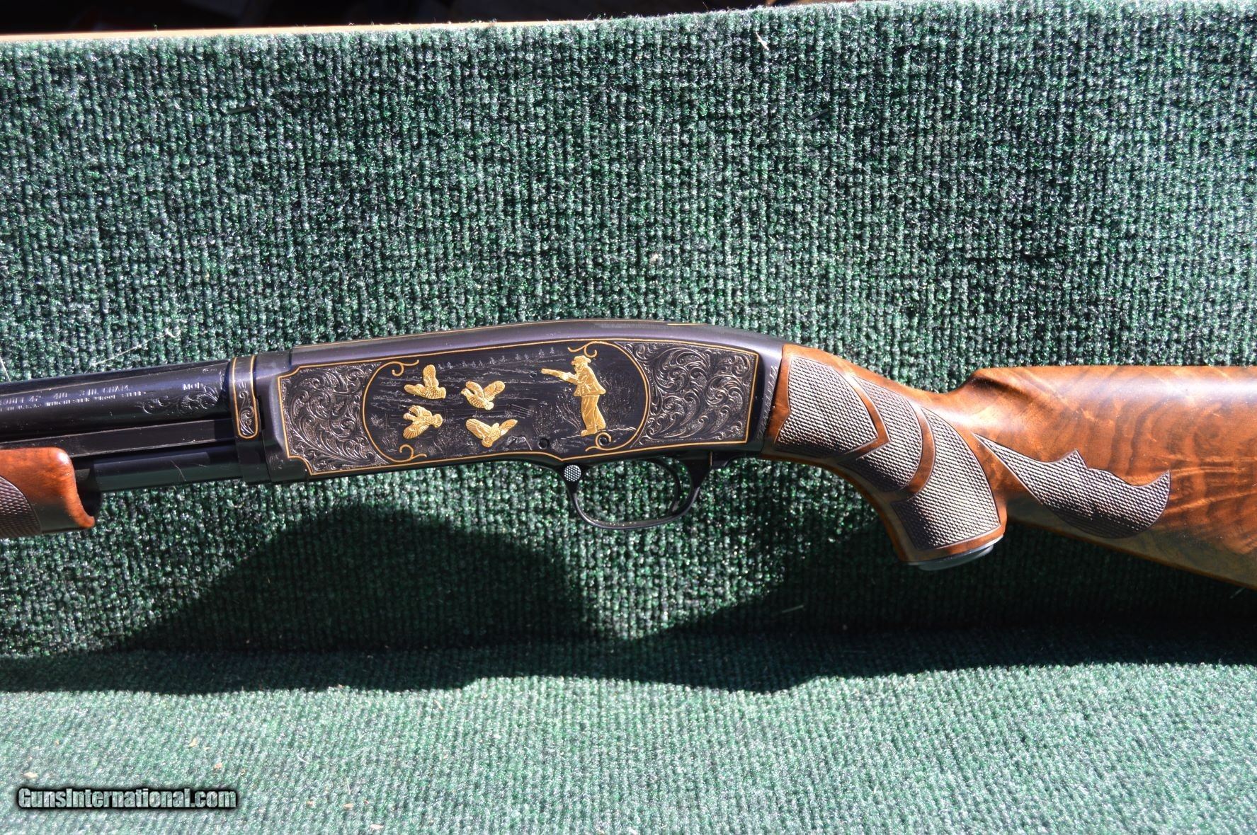 Description: Win Model 42 Shotgun in 410. Game scene engraved with many gold inlays. 26" solid rib Mod choked bbl. American Walunut custom stock with 'A' carved checkering. DAC 1 7/16. LOP 14". Ships in black plastic case to your FFL dealer. No Ca. or Intl. sales. SOLD Shotgun Gauge: .410 Gauge |