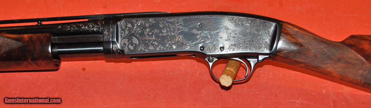Description: Winchester pre 64 model 42 Pigeon Grade 410.Built in 1953,this gun has the factory original round post donut base vent rib on a 26" barrel.The gun is choked skeet.The gun is engraved in the #5 pattern and signed by J.L.Salerno,a Winchester master engraver.Other features include a highly figured straight grip stock,fully checkered beavertail forend,and fine standard checkering.The gun is in mint condition retaining 99% blue and 100% wood finish.C&R eligible. SOLD Curio/Relic: Yes Manufacturer: Winchester Serial Number: 103034 Barrel Type: vent rib Gauge Info: 410 Manufacture Date: 1953 |