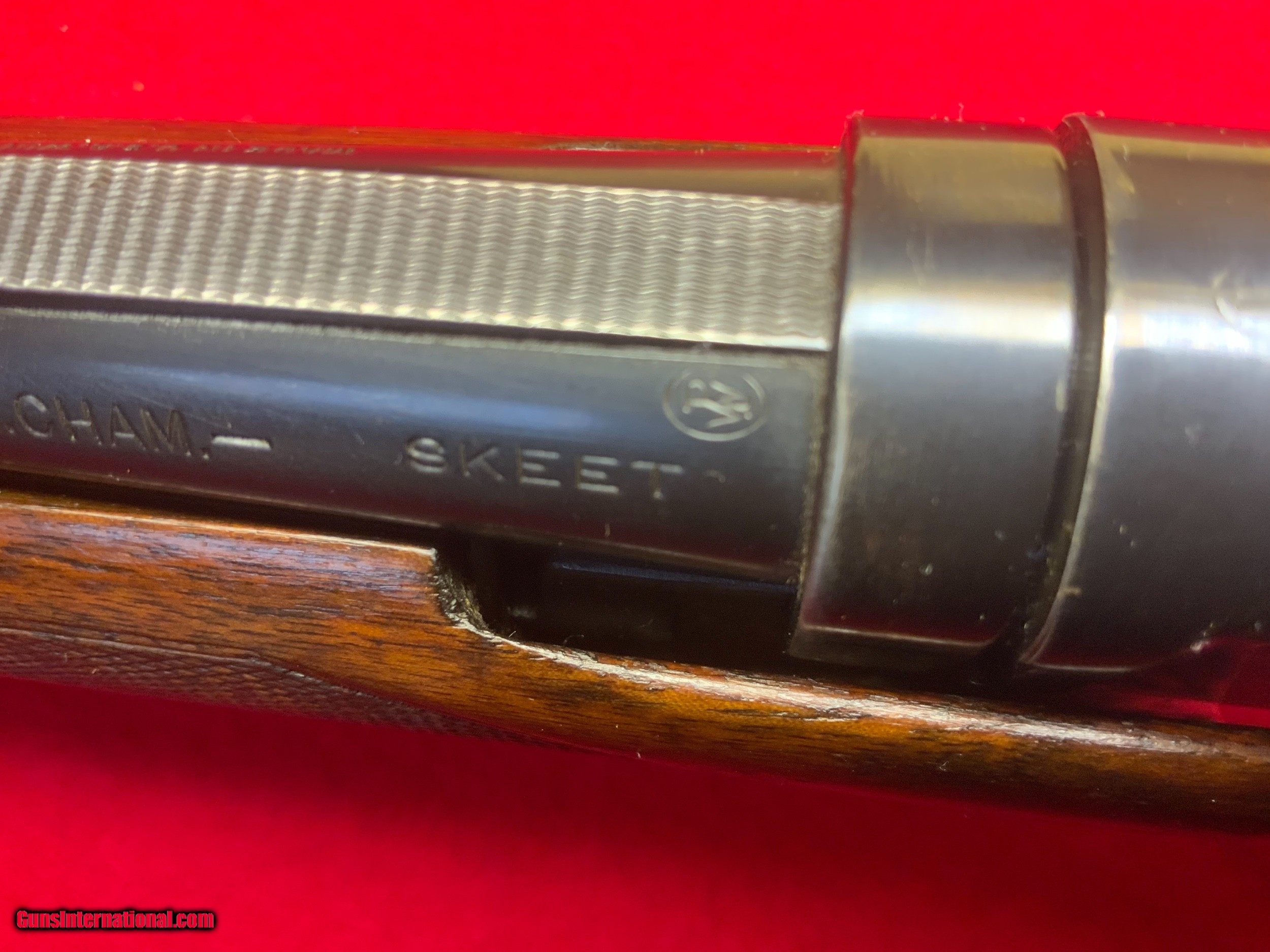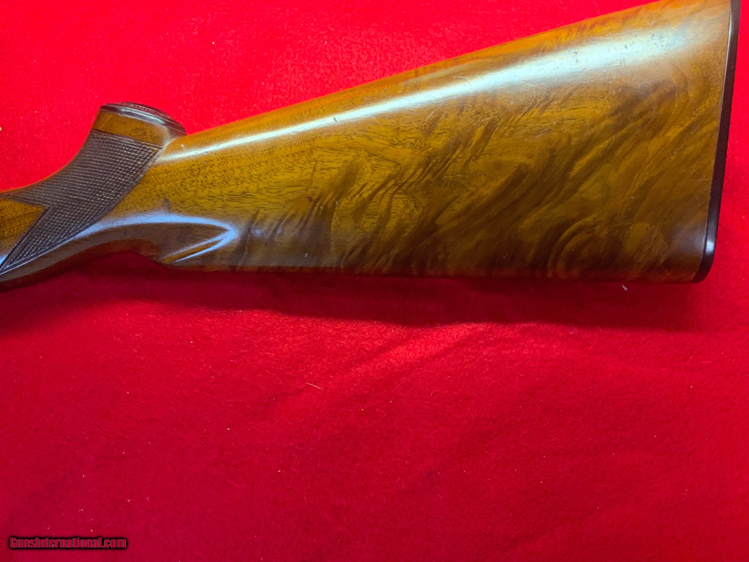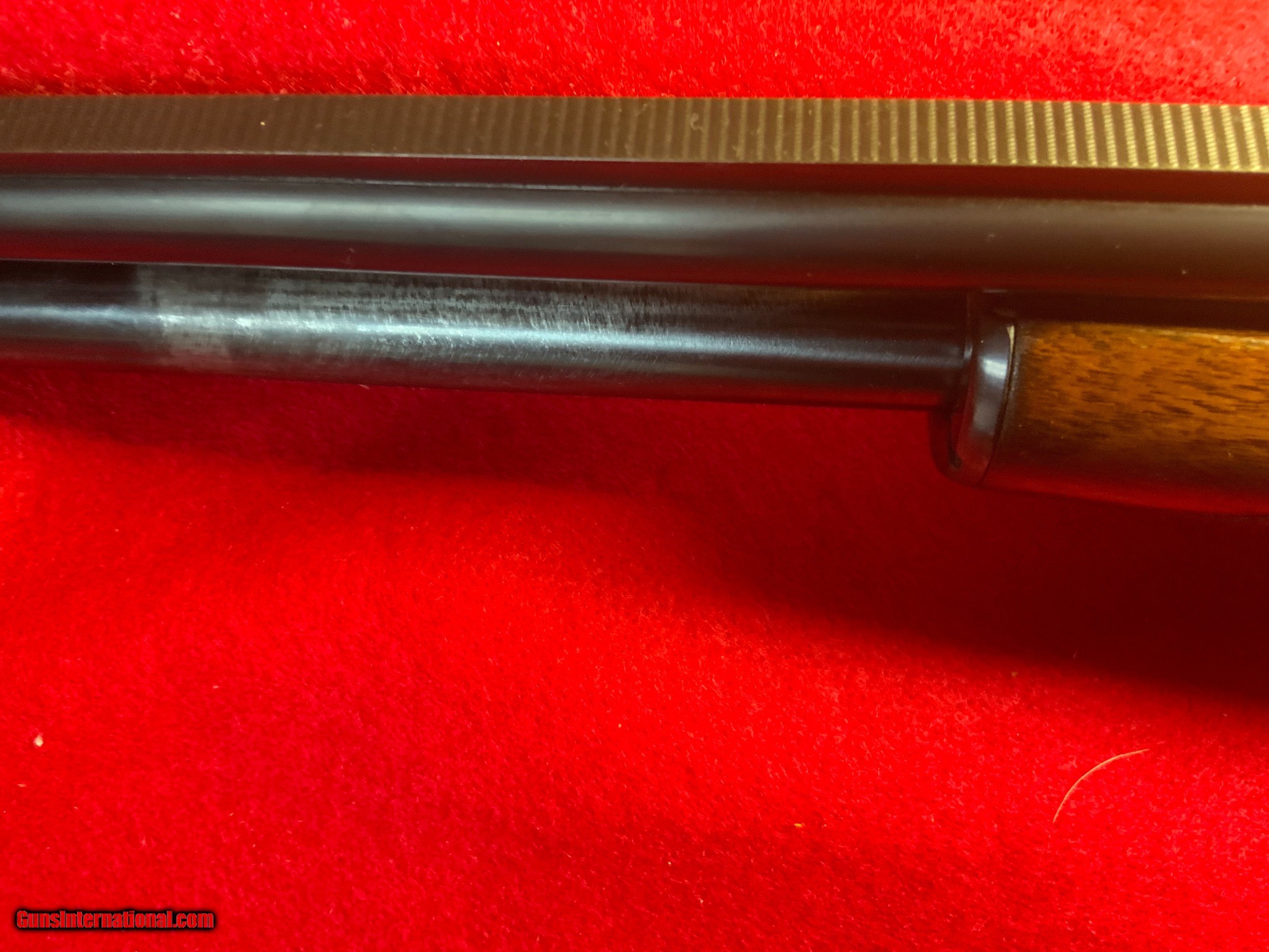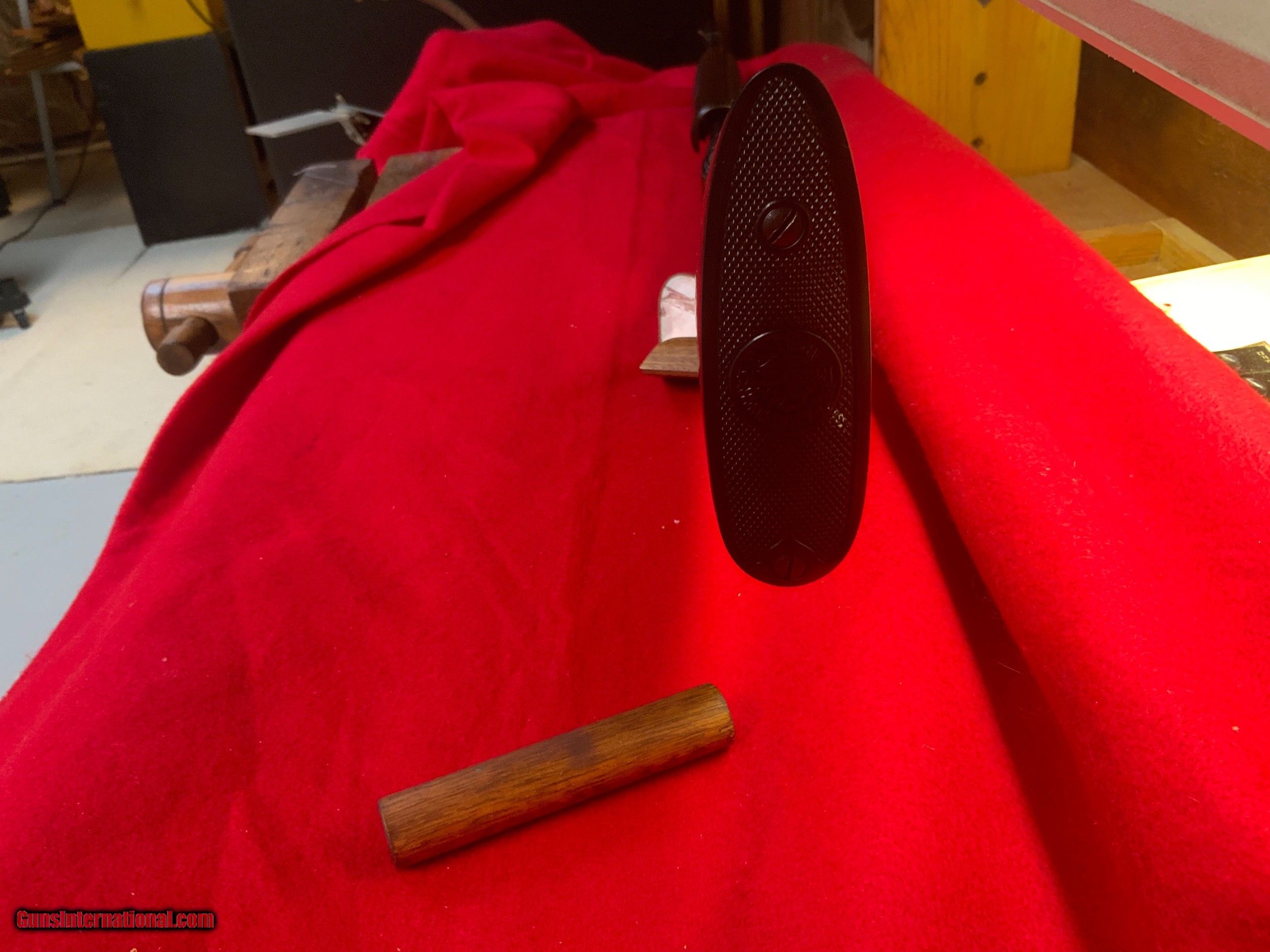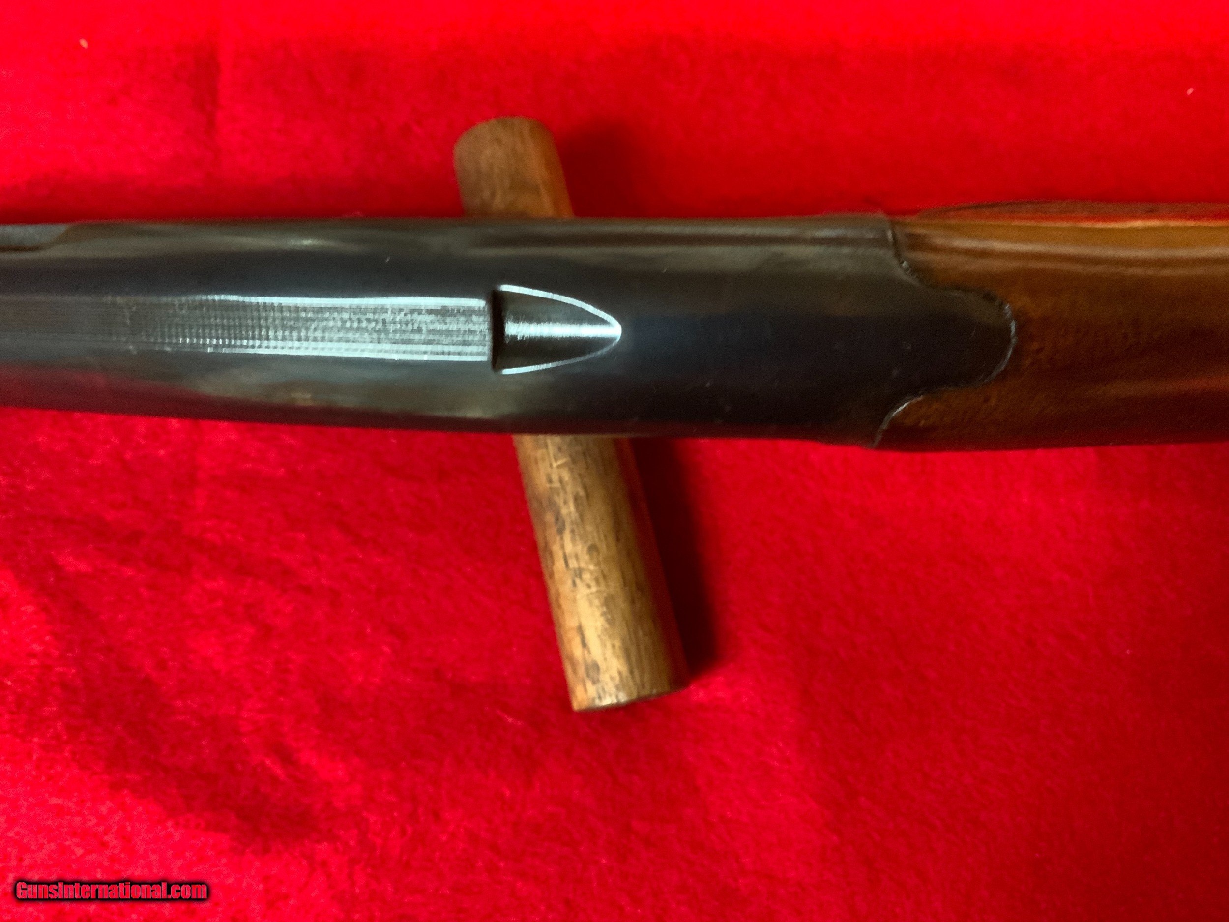 Description: SALE PENDING Winchester model.42 shotgun . Choked Skeet. Serial #39157 so pre war build in 1939. Solid Winchester rib so marked. 26 inch barrel. Deluxe Wood however I do not know if this was original since the double diamond is not checkered on the fore end. I have read some of the early deluxe Guns were checkered like this but I cannot determine if this was one of those guns. The barrel assembly is original however the receiver has been reblued. There is minor pitting in the receiver on top and underneath. Also some on trigger guard. A professional re-blue is needed in my opinion. LOP is13 3/4" and the weight is 6.13 lbs. Bore is perfect and the floor plate and extractor are both jeweled. SOLD Shotgun Gauge: .410 Gauge Manufacturer: Winchester Model: .42 Serial Number: 39157 Barrel Length: 26” Bore: Skeet Chambers: 3” Ejectors: Yes Condition: 93% Metal Condition: 90% Wood Condition: 98% Bore Condition: Mirror Barrel Type: Single Action: Pump Triggers: Single Butt Pad: Solid Winchester Plate LOP: 13 3/4” Rib: Solid Weight: 6.13lbs. Manufacture Date: 1939 |