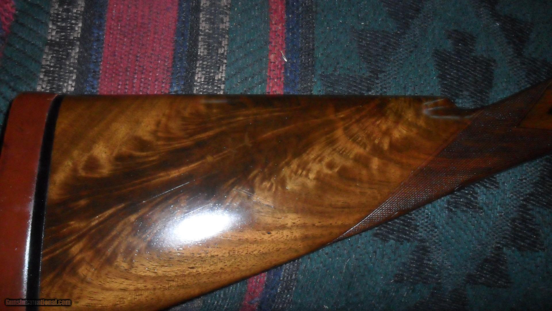 Description: Scarce Winchester model 42 Trap Grade , soild rib, 26 inch Skeet choke, Has a gold Bird Dog , and a Gold Mallard Duck on the other English straight stock with a red winchester pad looks originial , engraving .is nice trigger guard says C. B. McConnel did some research says he was a former vice president of Bank of America in the past would say he had the gold enlays and engraving done for him , has a black diamond not a enlay but looks to be painted on stock , but was done right . serial # 16,928 very nice wood , two diamond , style pump , would guess it was his favorite shotgun SOLD Serial Number: 16,928 |
